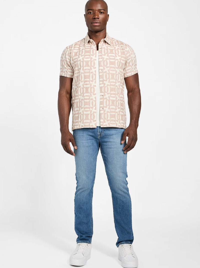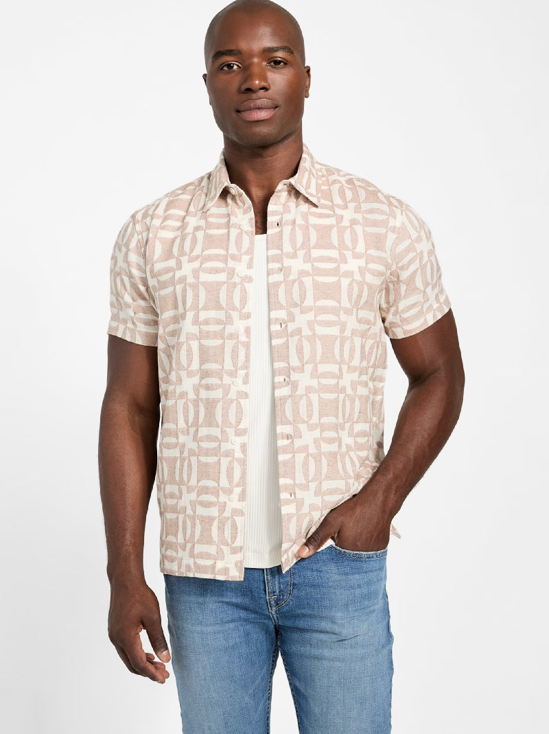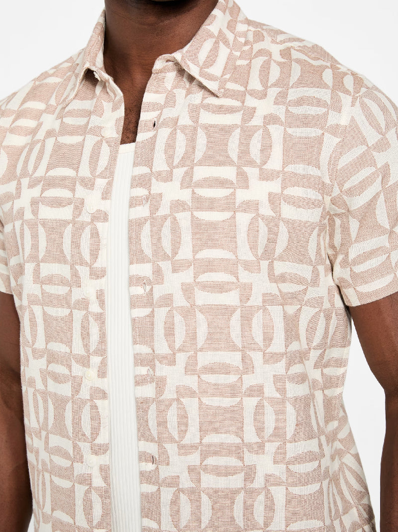 เสื้อเชิ้ต GUESS รุ่น Kendrick Geo Jacquard สีเบจ ตัดเย็บจากผ้าฝ้าย 100% มาพร้อมลายทอจาคการ์ดและแขนสั้น ให้ลุคสบายแต่มีสไตล์ เหมาะสำหรับวันสบาย ๆ.