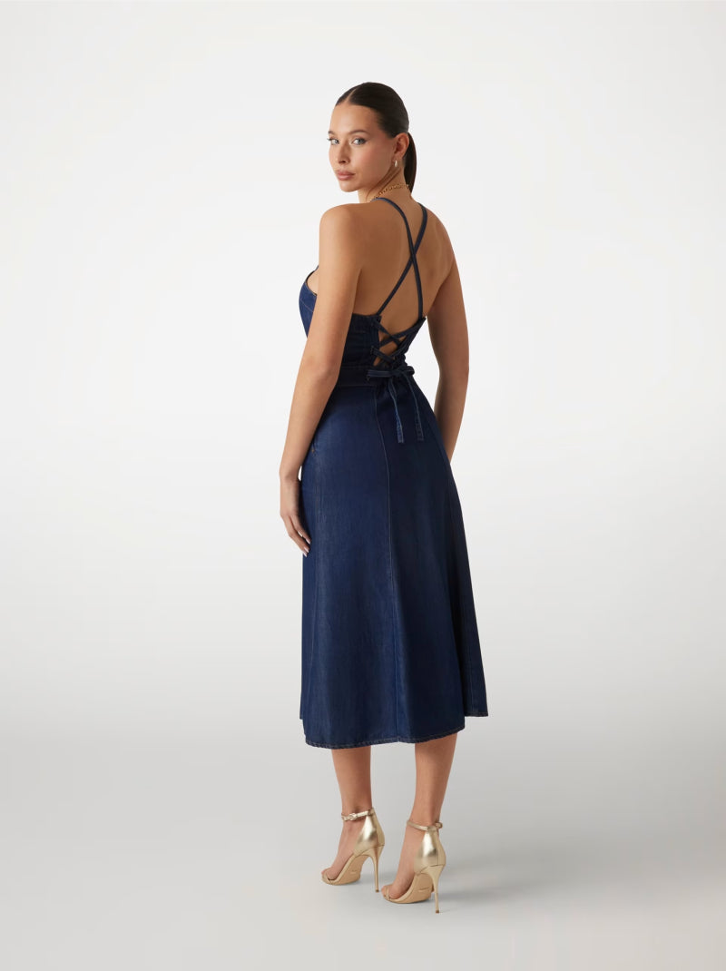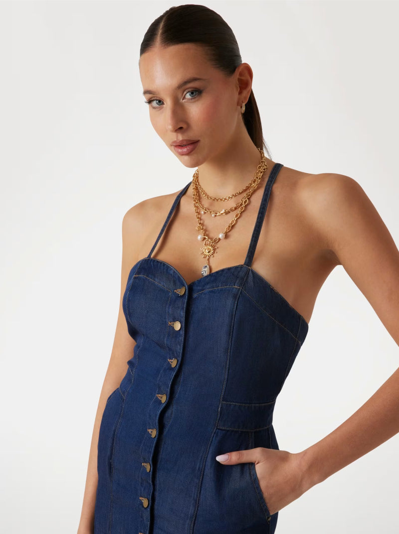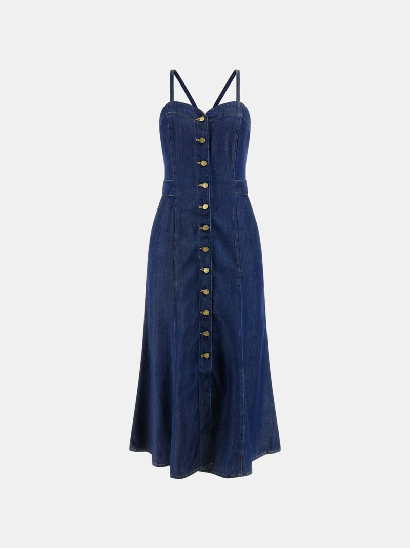 สัมผัสความคลาสสิกเหนือกาลเวลากับเดรสยีนส์สายเดี่ยวความยาวระดับกลางจาก GUESS รุ่นนี้ มาพร้อมดีไซน์คอรูปหัวใจที่ช่วยเสริมลุคให้ดูมีโครงชัดเจน เข้ารูปช่วงลำตัวและบานเล็กน้อยช่วงปลายกระโปรงเพื่อการเคลื่อนไหวที่พลิ้วไหว เพิ่มกลิ่นอายวินเทจด้วยกระดุมเรียงตลอดแนวด้านหน้า ด้านหลังโดดเด่นด้วยสายไขว้และดีเทลผูกแบบลูกไม้ ช่วยให้ปรับความกระชับได้ตามต้องการ สวมใส่ได้ทั้งกลางวันและกลางคืน เป็นเดรสที่ลงตัวระหว่างความเท่ของเดนิมและดีไซน์ที่หรูหราน่าหลงใหล เหมาะสำหรับฤดูร้อนเป็นอย่างยิ่ง