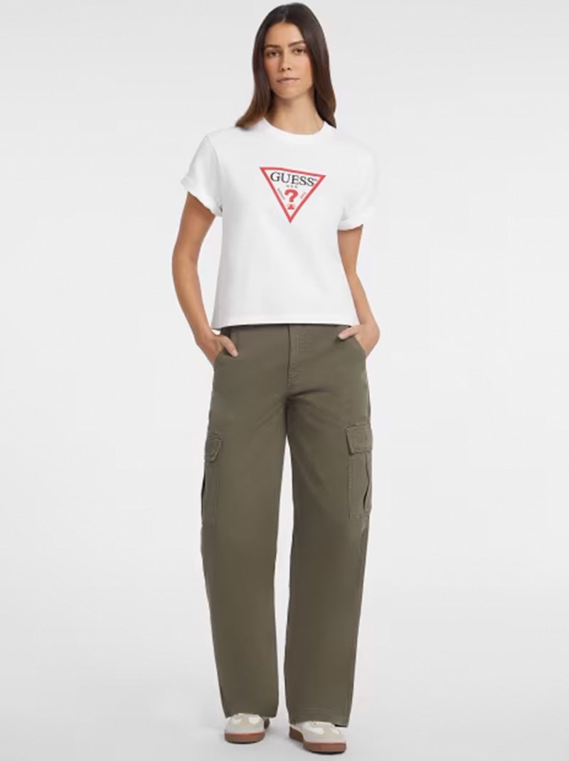 เสื้อยืดทรงบ็อกซี่ โลโก้ไอคอนิกสามเหลี่ยมสีแดงที่หน้าอก ทรงครอป ผลิตจากคอตตอนออร์แกนิก 100%