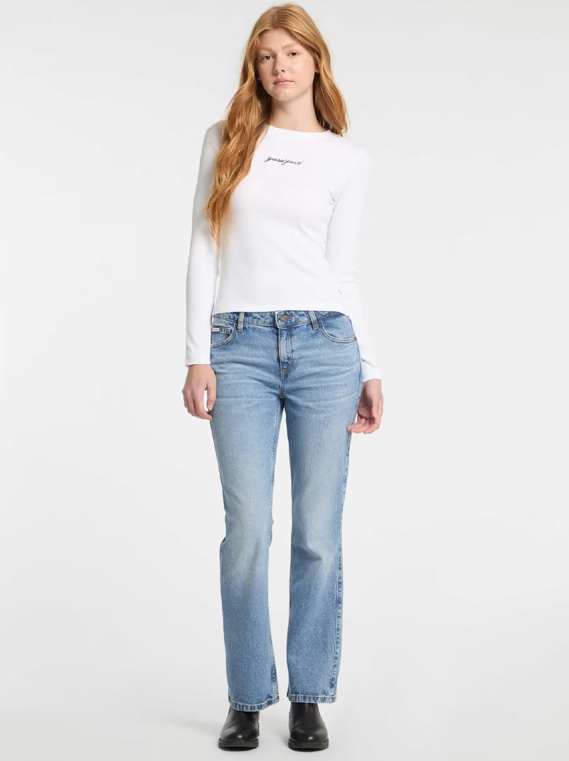 ลุคคลาสสิกสุดเท่แต่แฝงไปด้วยความผ่อนคลาย กางเกงยีนส์ยืดให้ทรงพอดีตัว ทรงบูทคัทเพิ่มความเก๋ไก๋ที่สะโพก ดีไซน์กระเป๋าห้าช่องที่ใช้งานได้จริงและติดซิปกระดุมทำให้เป็นไอเท็มคู่ใจ