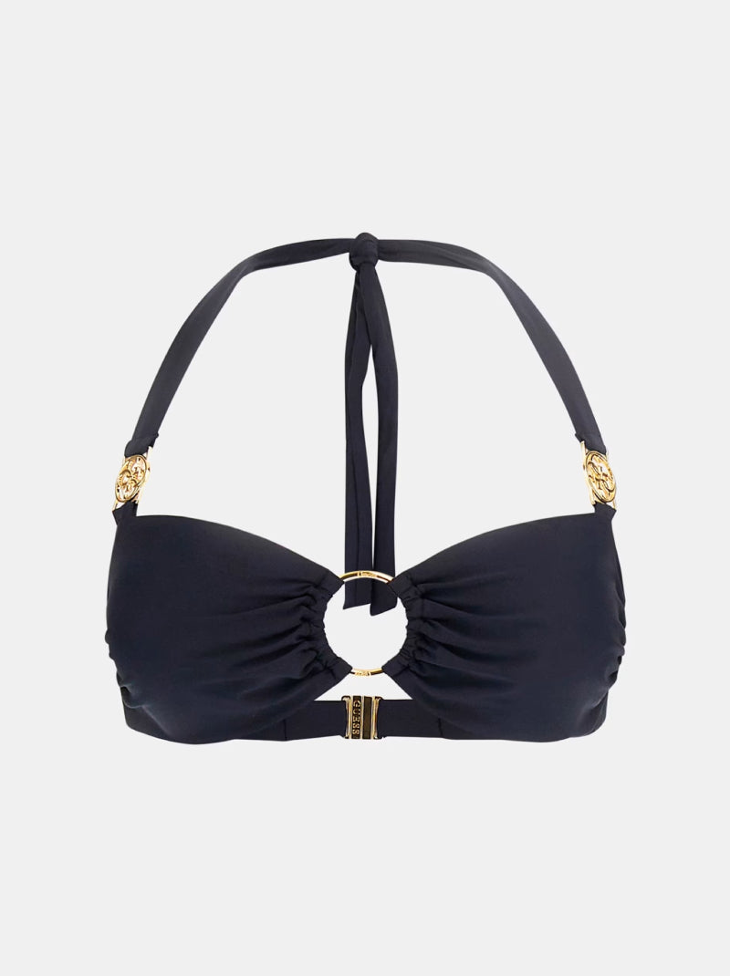 เติมความเซ็กซี่และเก๋ให้กับตู้ว่ายน้ำของคุณด้วย เสื้อท่อนบน Ring Bandeau Bikini Top จาก GUESS สีดำ ดีไซน์แบบสายบ่าคาดตัว เพิ่มลูกเล่นด้วยแหวน O‑ring กลางอก ที่ช่วยดึงผ้าให้เกิดดีเทลหยักเล็กน้อย เพิ่มความเพรียวและมีมิติมากขึ้น มาพร้อมสายคล้องคอแบบถอดได้และสายผูกด้านหลัง ปรับสไตล์ได้ตามใจ ใส่ง่ายและกระชับตัว เหมาะกับการพักผ่อนริมทะเลด้วยลุคที่โดดเด่นแต่เรียบหรูไม่ซ้ำใคร