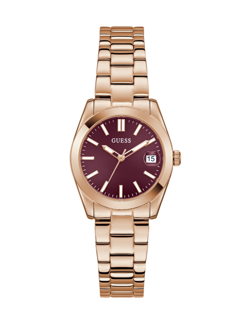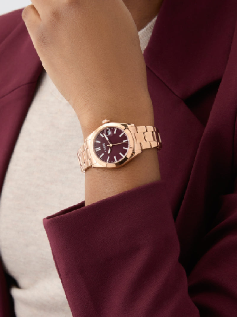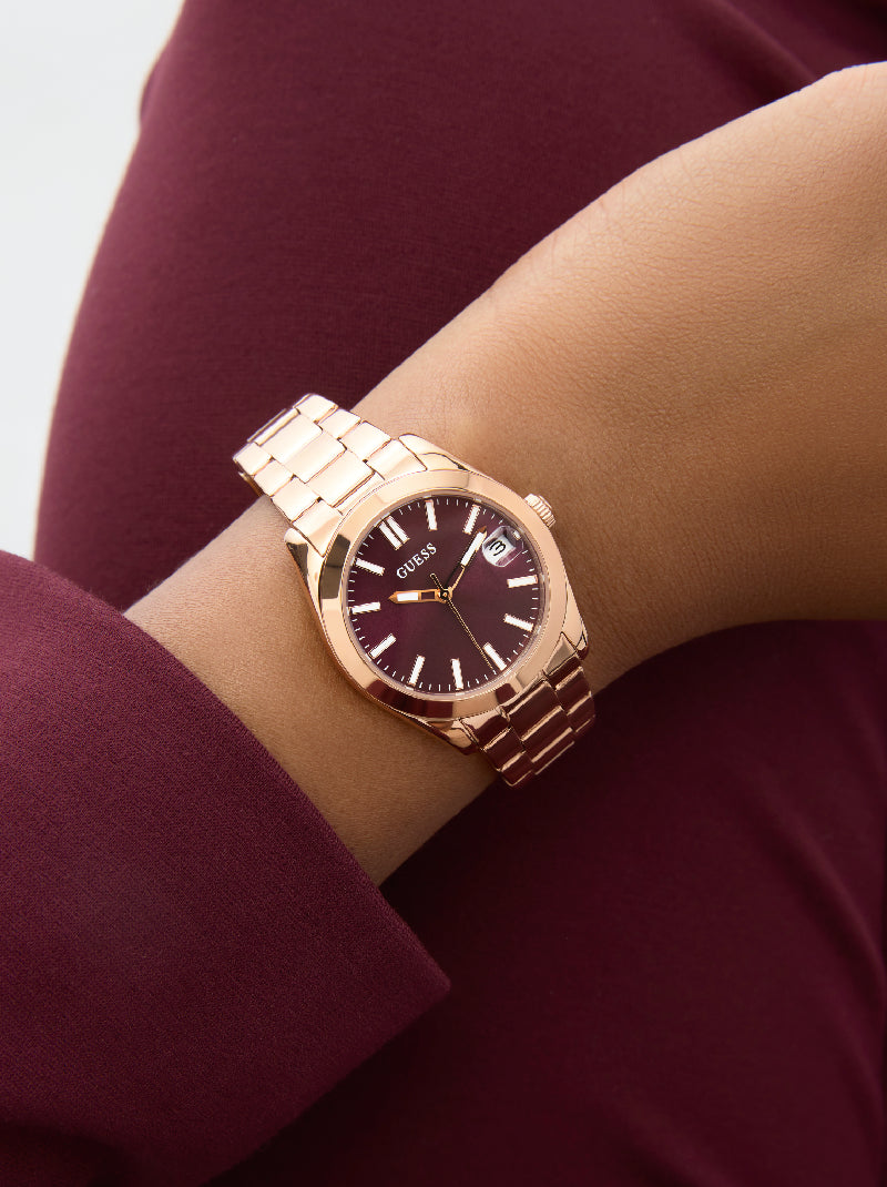 เติมเต็มความหรูหราในทุกวันด้วยนาฬิกาอนาล็อกโทนโรสโกลด์จาก GUESS ที่โดดเด่นด้วยกรอบขอบเรียบเงาและหน้าปัดสีเบอร์กันดีที่แฝงไว้ซึ่งความสง่างาม สายนาฬิกาแบบลิ้งก์ผลิตจากเหล็กรีไซเคิลส่งสัญญาณถึงความมีสไตล์และใส่ใจสิ่งแวดล้อม พร้อมหน้าต่างแสดงวันที่ ขนาดตัวเรือน 32 มม. นี่คือชิ้นเอกที่ผสานแฟชั่นและฟังก์ชันไว้อย่างลงตัว