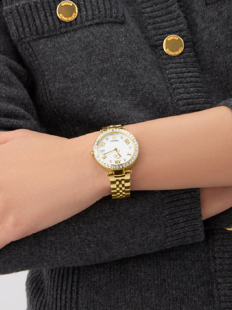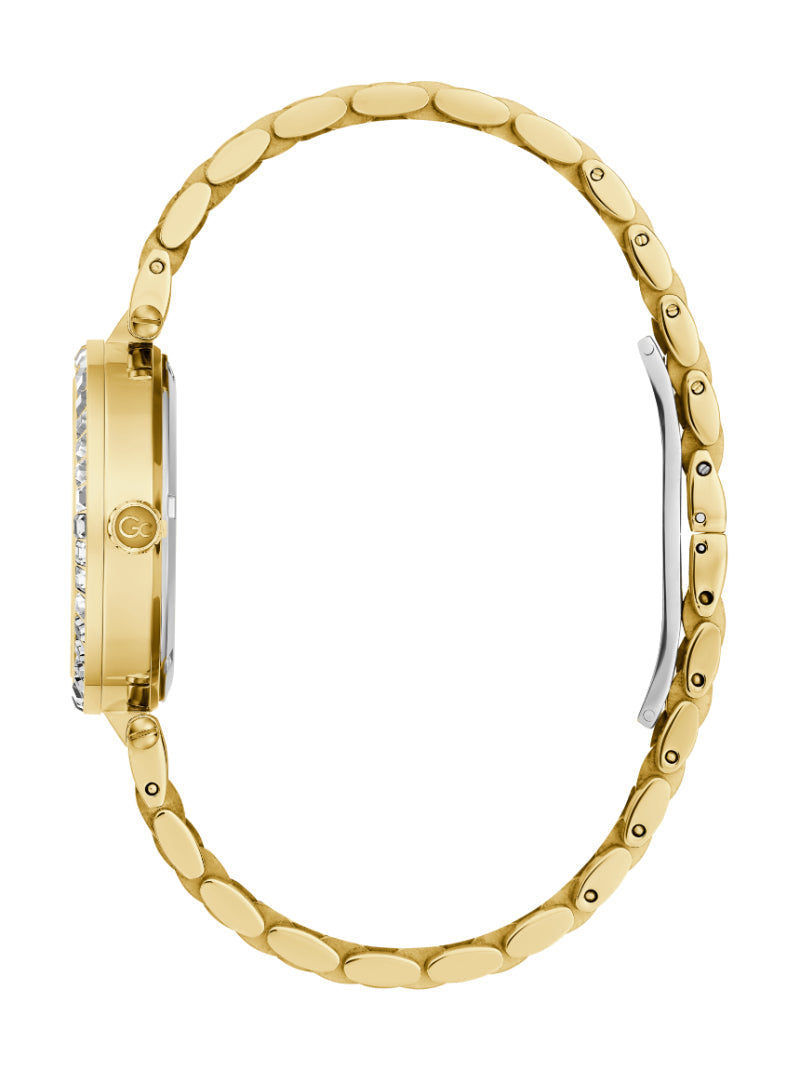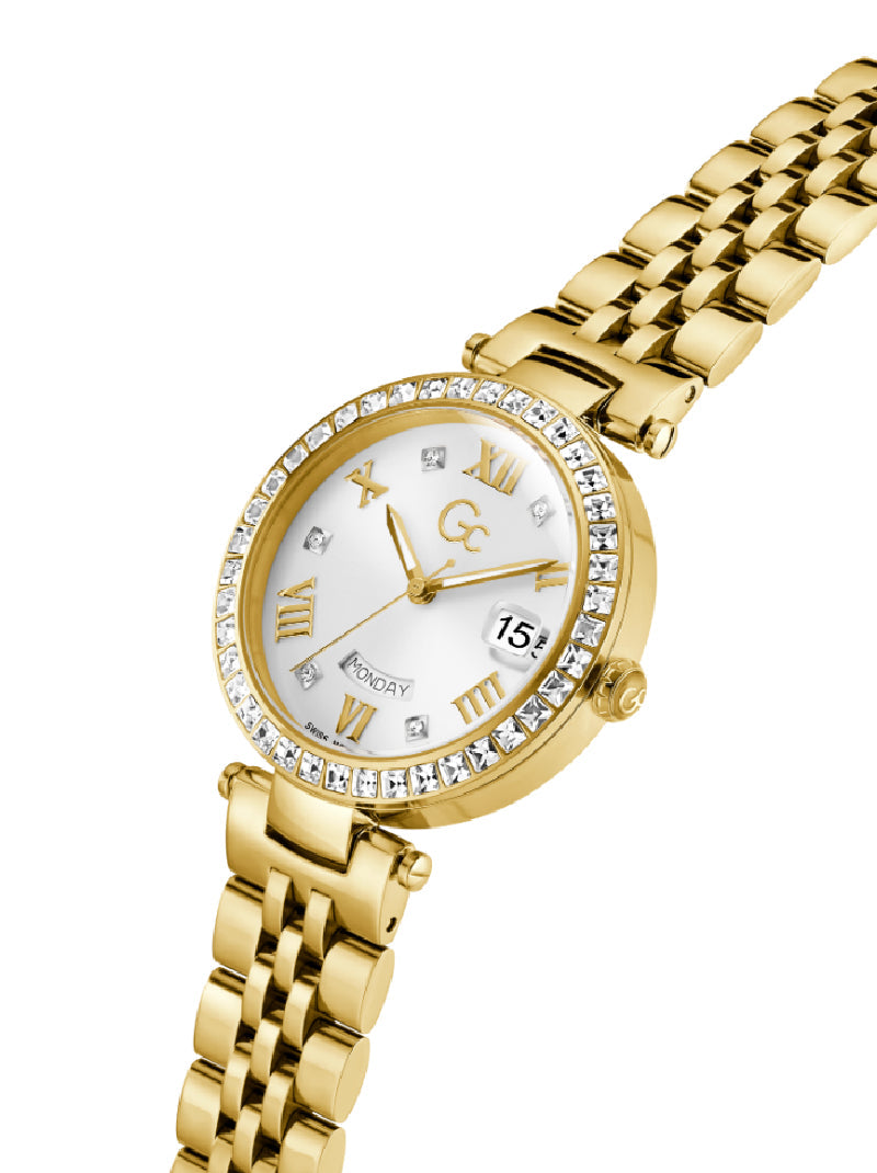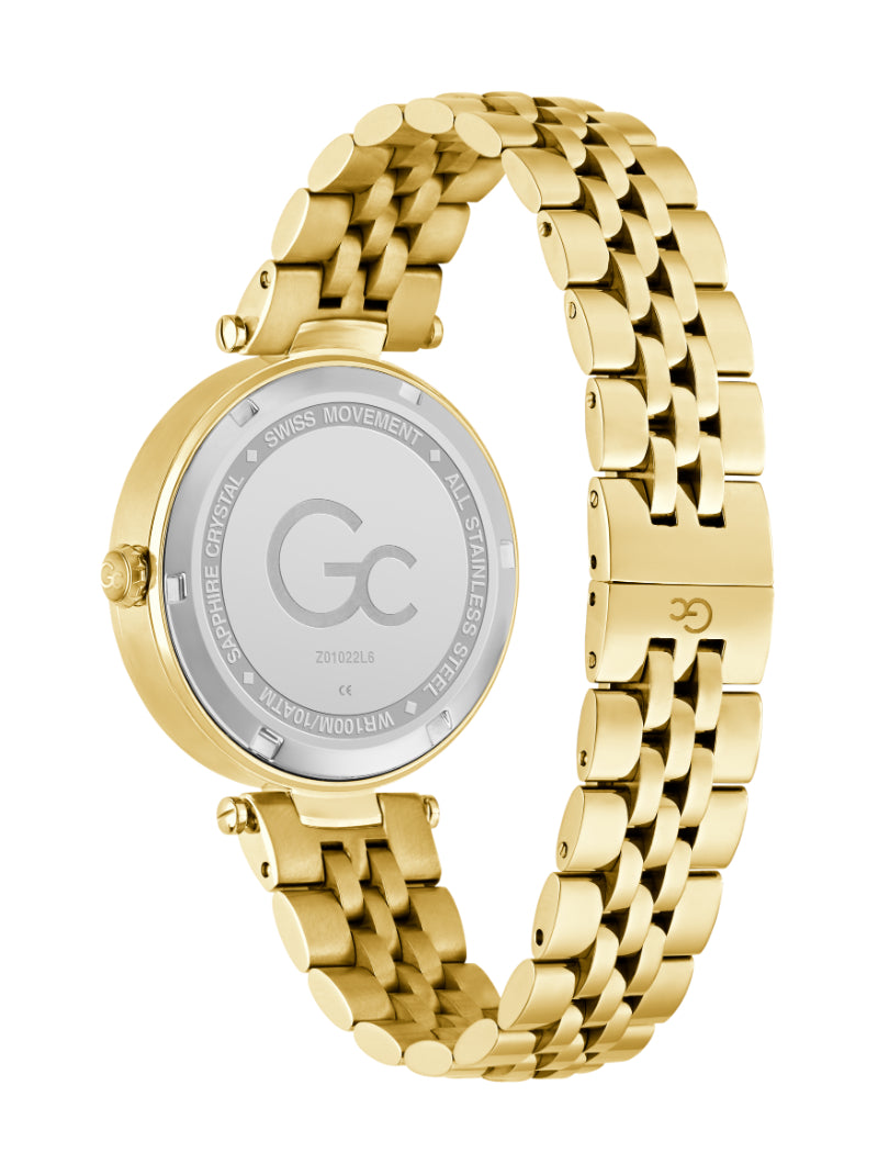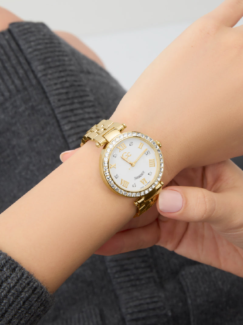 Gc Flair Crystal ผสานความหรูหราโดดเด่นเข้ากับความเที่ยงตรงเหนือกาลเวลา ตัวเรือนทรงกลมขนาด 34 มม. ผลิตจากสแตนเลสสตีล 316L อย่างประณีต เปล่งประกายแวววาวด้วยการชุบทองคำเหลืองขัดเงา ประดับด้วยคริสตัลแวววาว รังสรรค์เป็นนาฬิกาที่โดดเด่นสะดุดตา สายนาฬิกาเข้าชุดกันที่ยึดด้วยหัวเข็มขัดแบบไร้รอยต่อ มอบความหรูหราอย่างเหนือระดับบนข้อมือ
