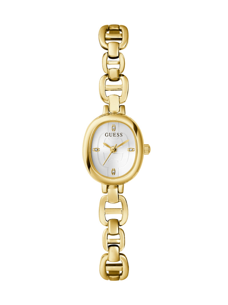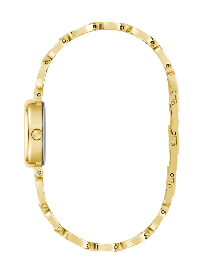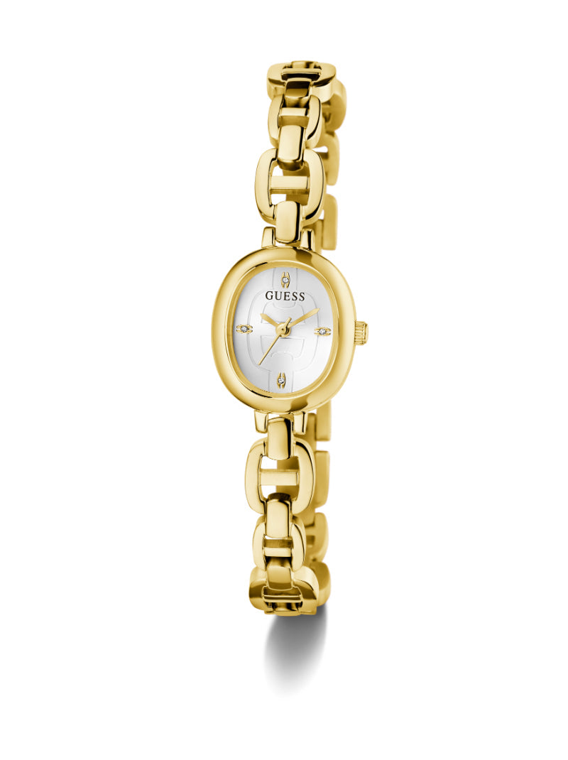 นาฬิกา GUESS โดดเด่นด้วยตัวเรือนและสายทองทำจากสเตนเลสรีไซเคิล หน้าปัดสีขาวขนาด 21 มม. มอบความหรูหราและคลาสสิก เหมาะสำหรับผู้หญิงที่ชื่นชอบความสง่างามและสไตล์เรียบง่าย