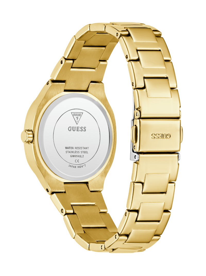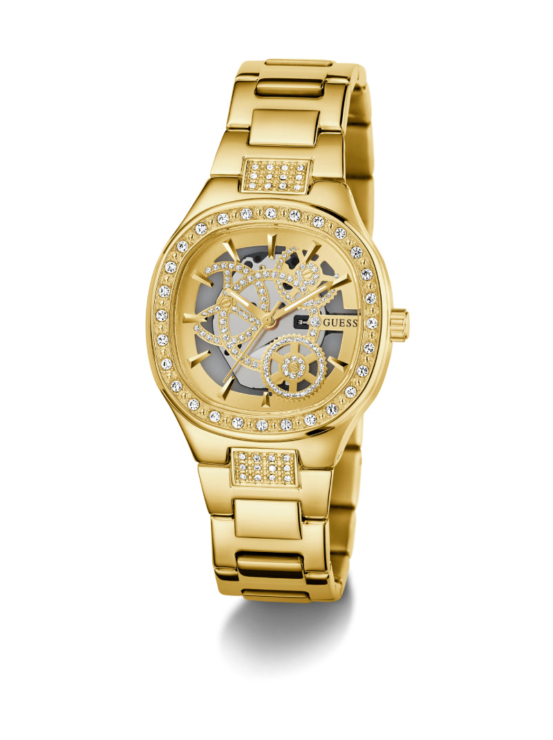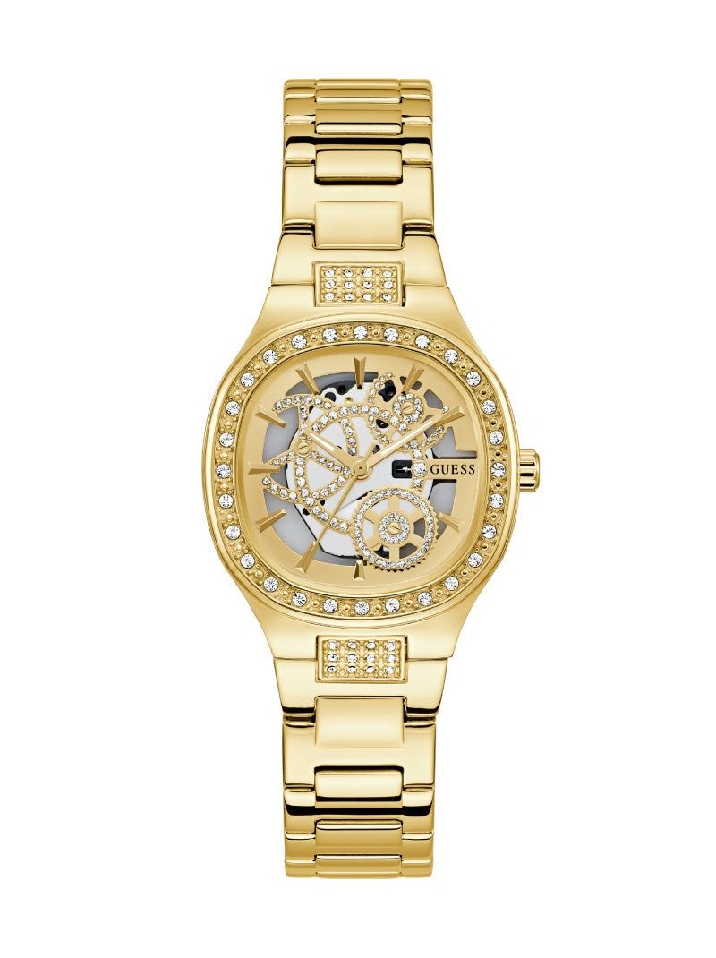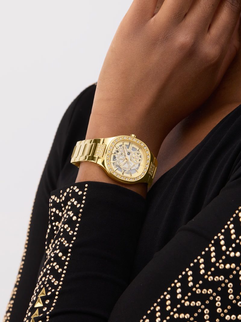 เปล่งประกายความหรูหราไปกับนาฬิกา GUESS โทนสีทองสุดลักชัวรี ตัวเรือนและสายสแตนเลสสตีลสีทองให้ความรู้สึกหรูหราสง่างาม ตกแต่งด้วยคริสตัลทั้งบนขอบและภายในหน้าปัดเพื่อความระยิบระยับที่ไม่เหมือนใคร ดีไซน์สเกเลตันเผยให้เห็นรายละเอียดการสร้างสรรค์อันประณีต เหมาะสำหรับผู้ที่ชื่นชอบแฟชั่นและต้องการเครื่องประดับที่ทั้งแข็งแรง ทนทาน และโดดเด่น