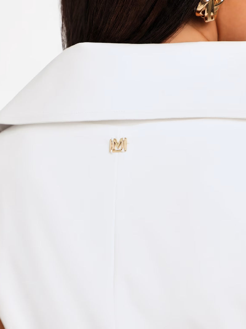 A refined blazer dress crafted from a linen-blend slub fabric, combining timeless elegance with a modern edge. Featuring a wide notched lapel, sleeveless design, and a form-fitting pencil skirt that flatters the silhouette, it is finished with front pockets and a detachable adjustable belt for a tailored touch. The double-breasted button closure adds a sophisticated blazer-inspired detail. Made from organic cotton blended with polyester and elastane, this piece ensures comfort while supporting sustainable choices. Perfect for elevating both professional and special occasion looks with confidence and style.