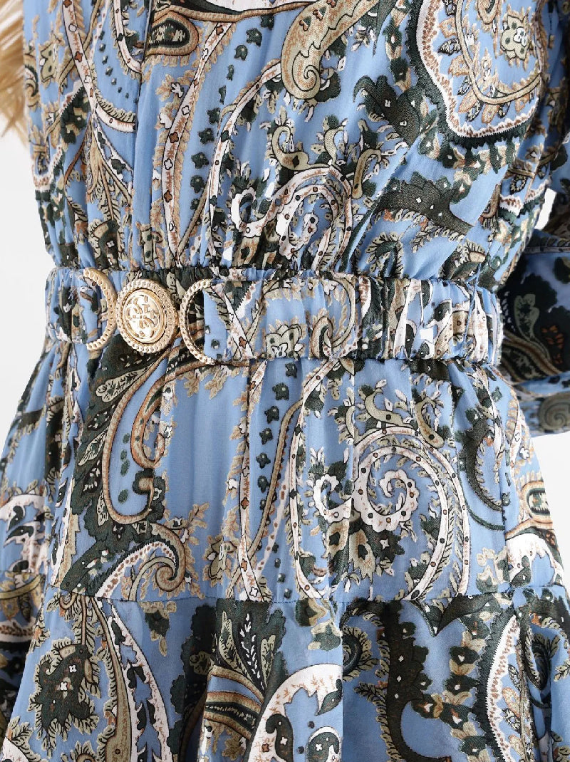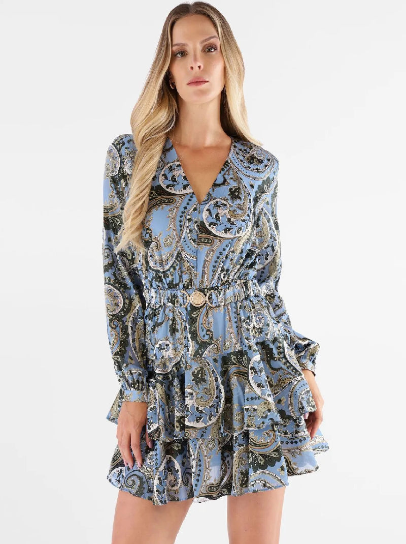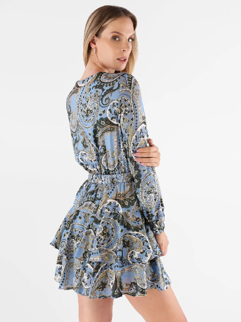 Step into sophistication with this viscose-blend mini dress. The classic V-neck and long sleeves deliver timeless elegance. The flounced hemline adds charming movement. The all-over paisley print makes it truly eye-catching. Perfect for an exquisite evening out.