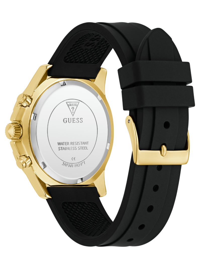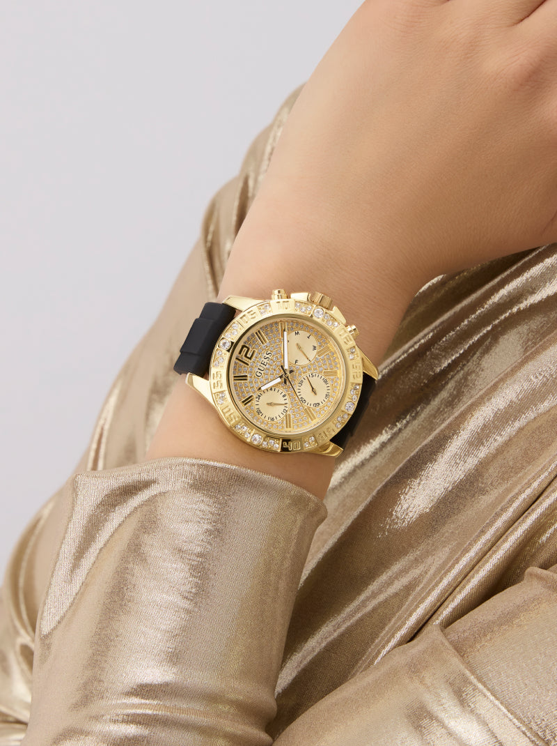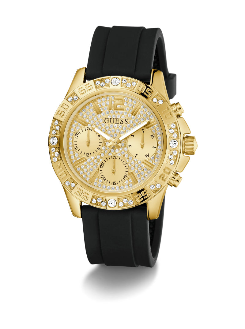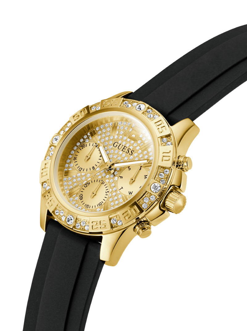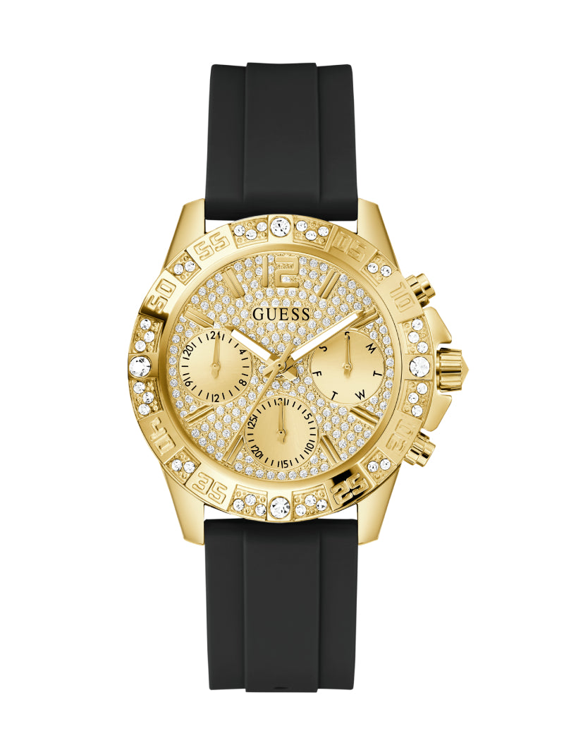 Make a bold statement with this luxurious GUESS watch designed to capture attention. The gold-tone case is lavishly encrusted with sparkling crystals, while the sleek black silicone strap adds a modern contrast, ensuring comfort for everyday wear. The multifunction dial not only delivers a glamorous touch but also provides practicality with day, date, and 24-hour sub-dials. Perfect for those who embrace style with confidence, this timepiece reflects a fearless fashion attitude that transitions seamlessly from day to night.