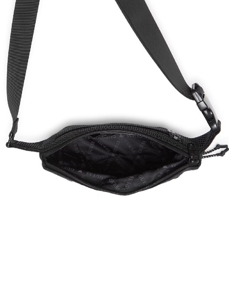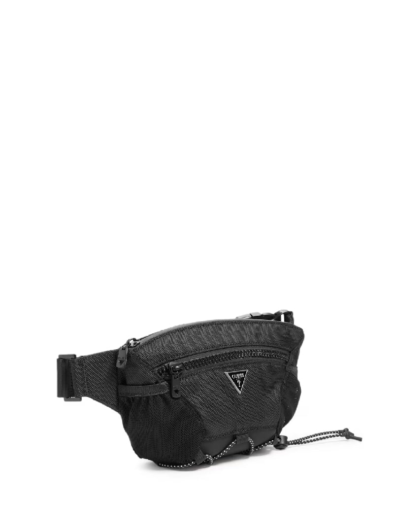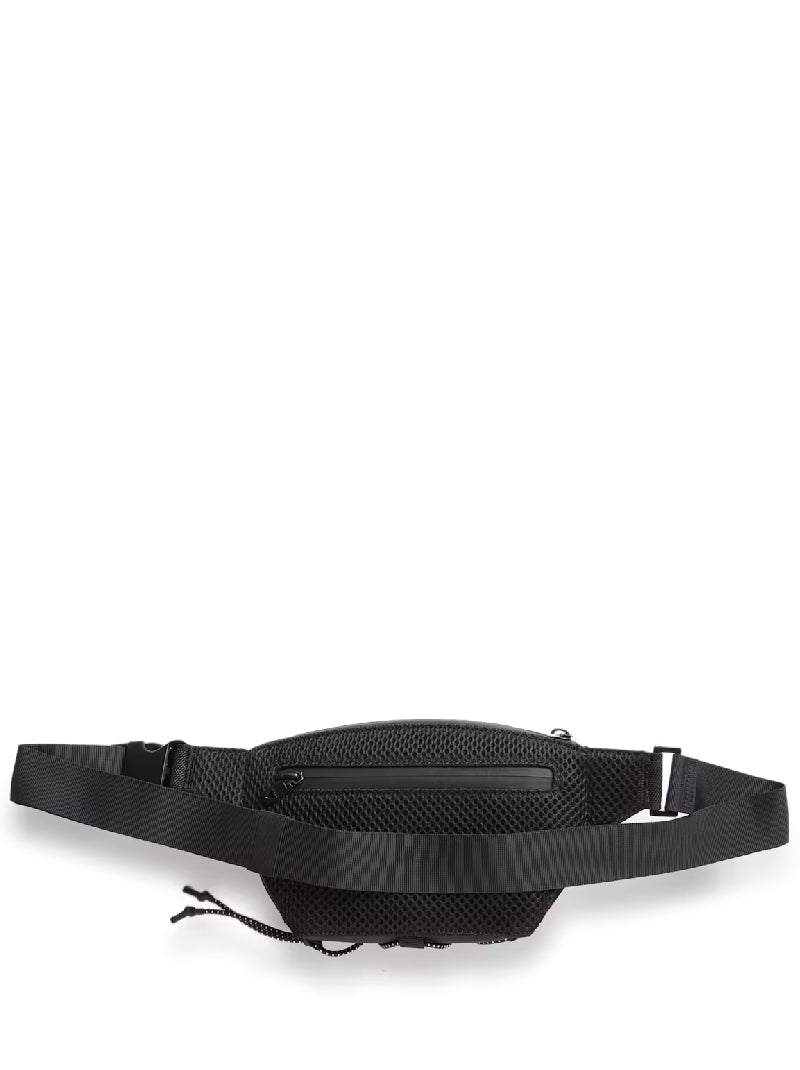 This black nylon waist bag combines modern design with practical functionality. Accented with faux leather trim, black-tone hardware, and a front triangular logo, it adds a stylish edge to any outfit. The bottom features an elastic strap with a dotted pattern for extra flexibility, while exterior zip pockets, mesh slip compartments, and organized interior sections lined with fabric offer versatile storage. Finished with a top zip closure and adjustable strap, the bag ensures convenience and comfort.it’s perfect for daily activities and on-the-go lifestyles.