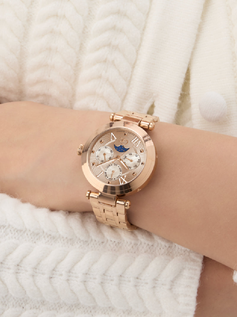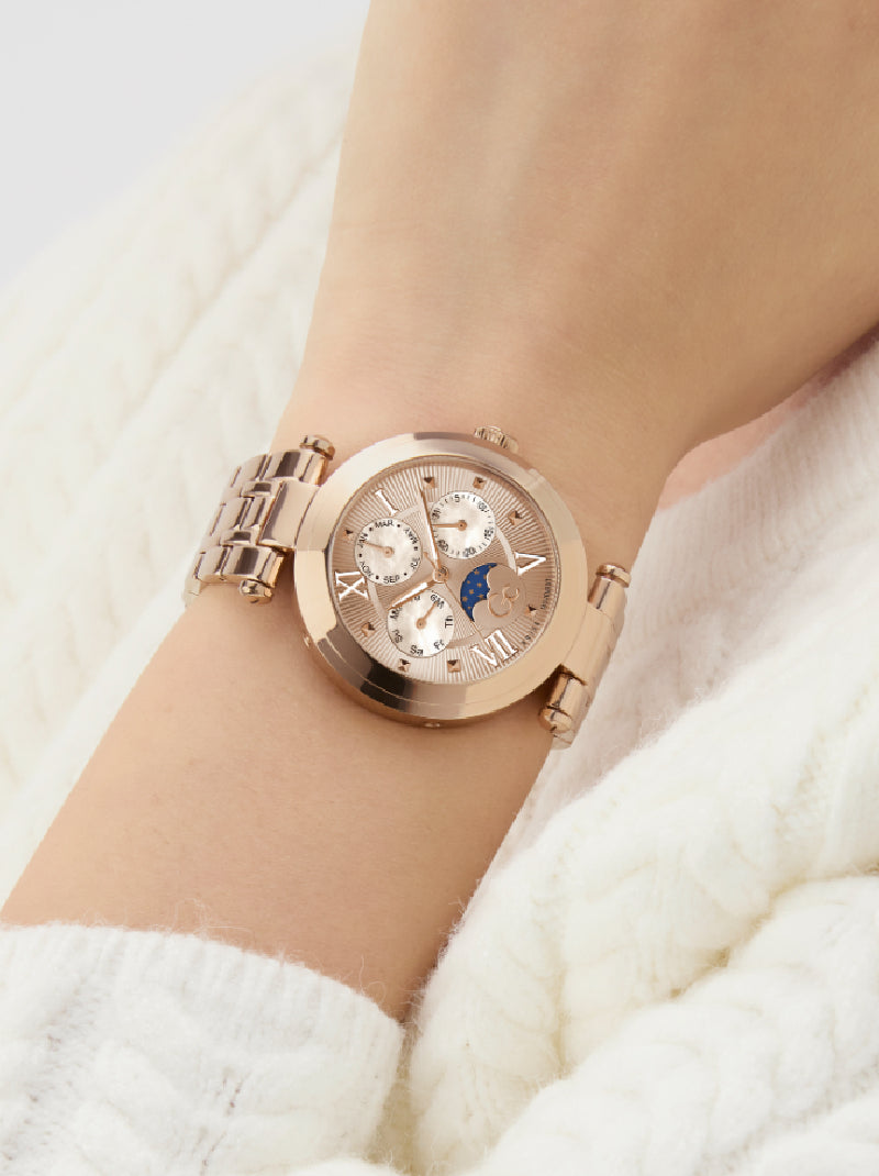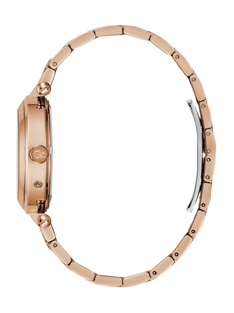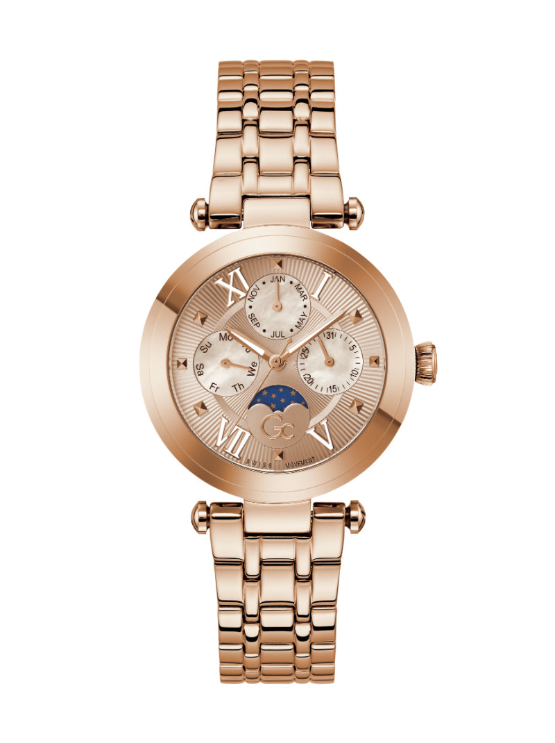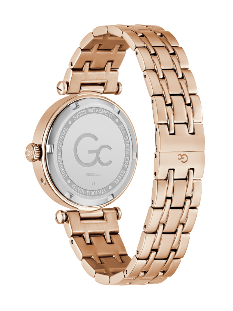 The Gc TopChic brings together modern elegance and horological artistry in a striking, fashion-forward silhouette. Its 36.5mm round case is crafted from polished rose gold plating over 316L stainless steel which offers bold contrast and radiant presence. A domed sapphire crystal ensures exceptional clarity and long-lasting resilience.