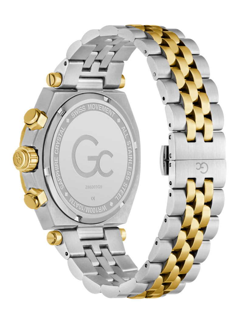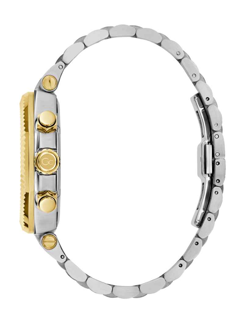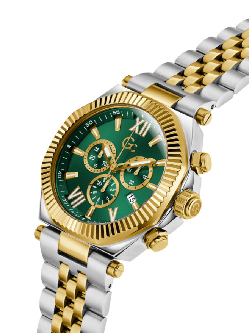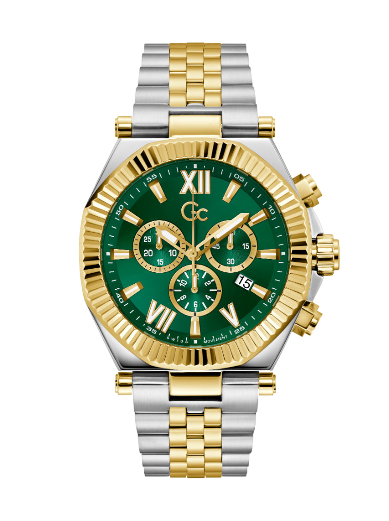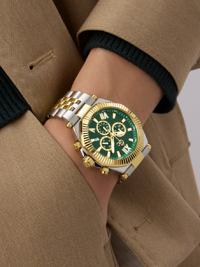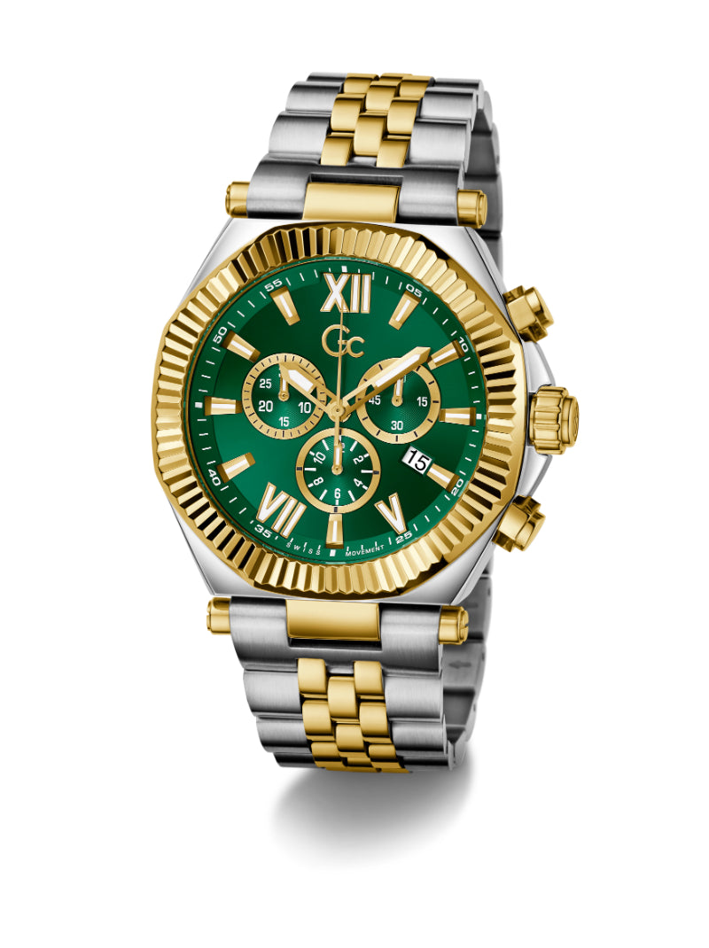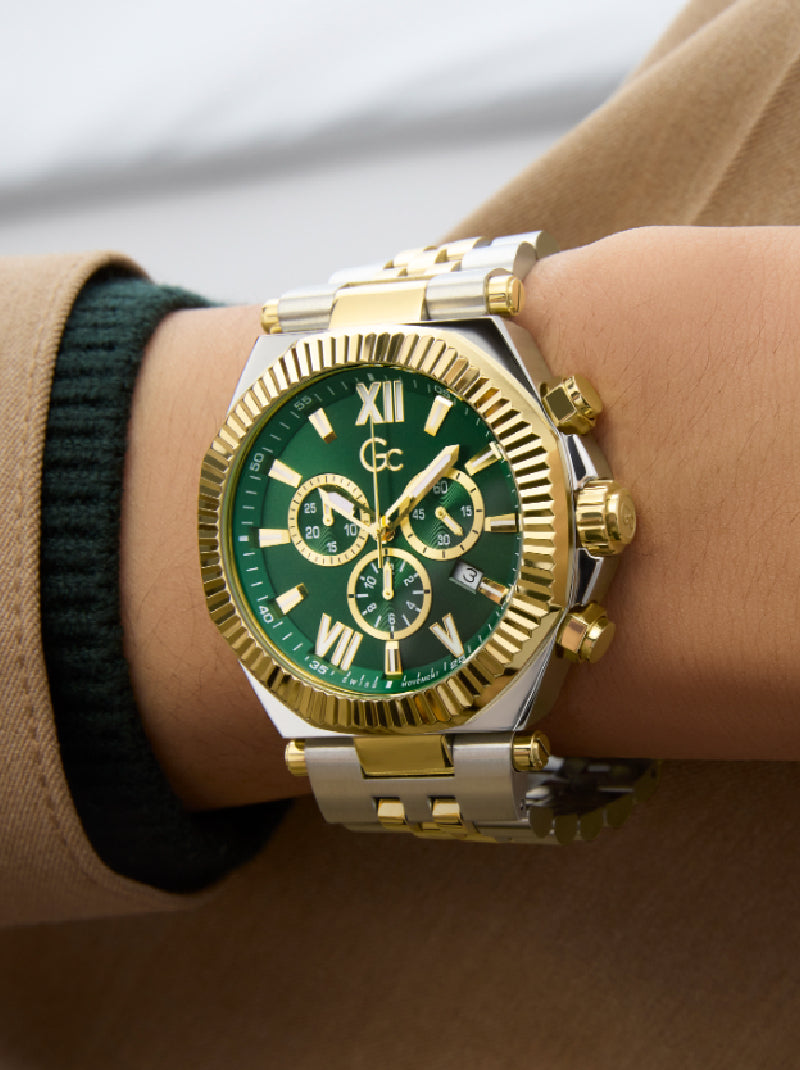 The Gc Atlas Chrono strikes a commanding presence with its sculptural blend of polished silver and gold plating across a bold 44mm case and integrated bracelet. Its brushed and polished finishes play with light and contrast, while the rich green textured dial adds a touch of daring sophistication.