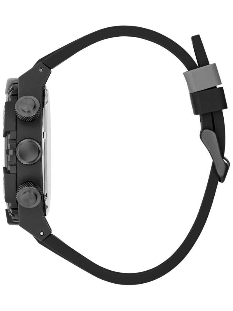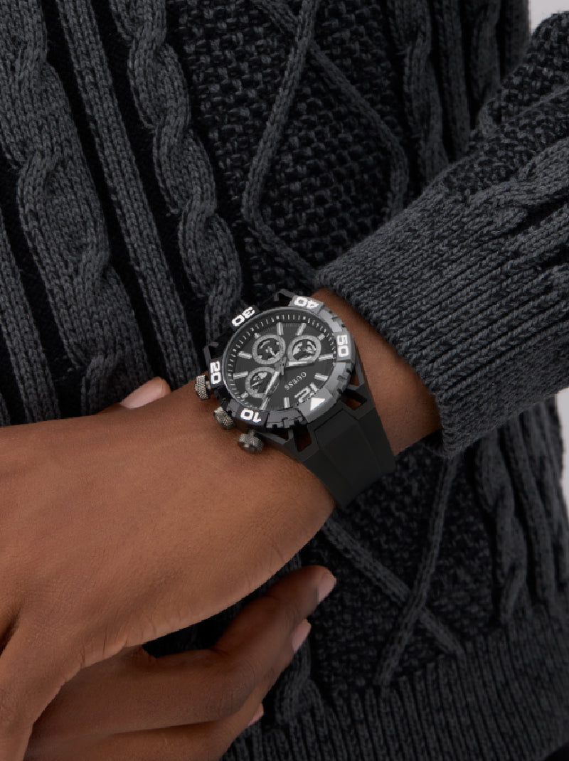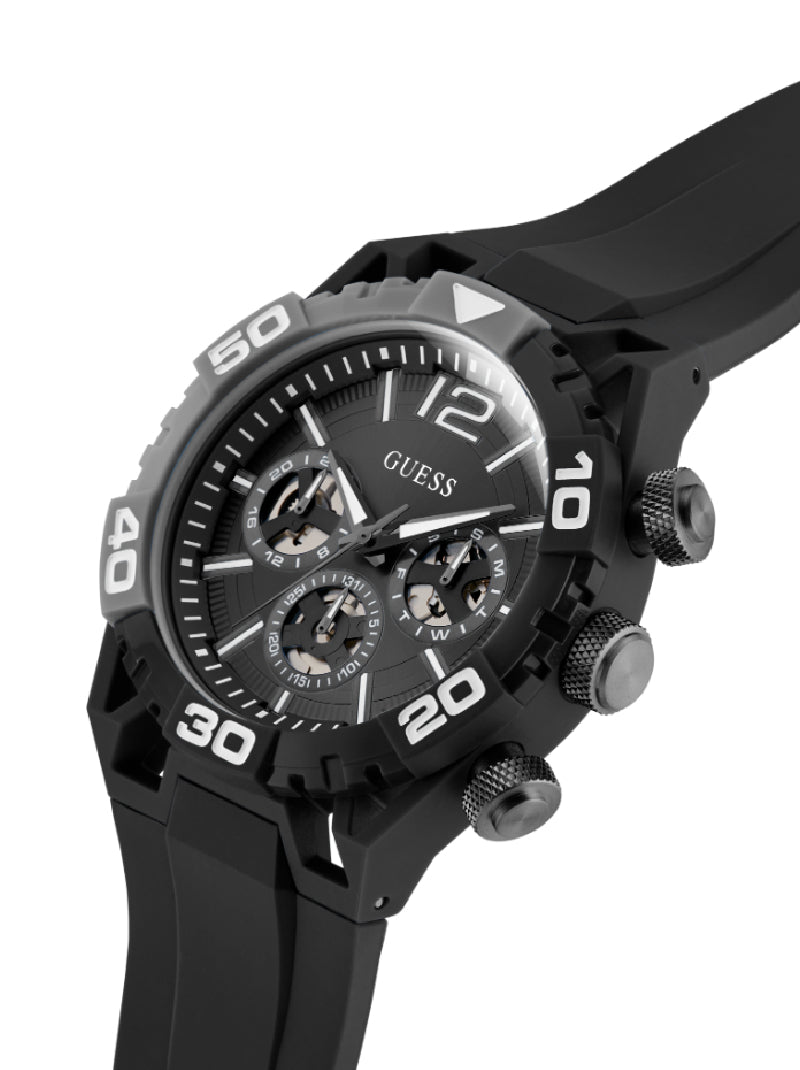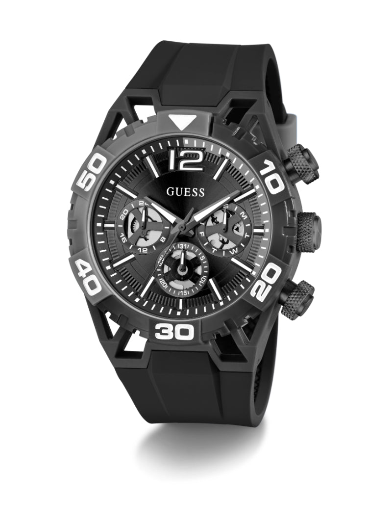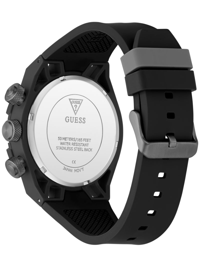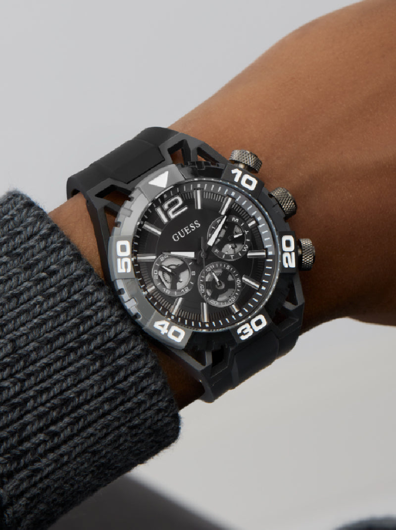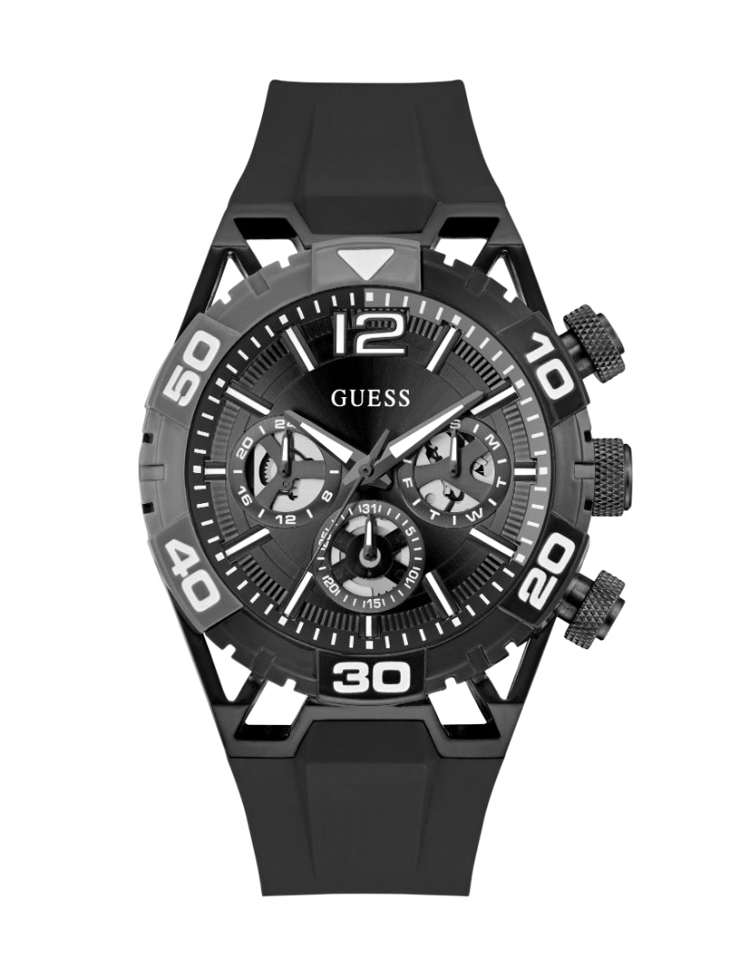 The GUESS features a bold 46 mm case and a sleek grey rubber strap, combining sporty aesthetics with refined elegance to bring a confident and distinguished presence to your wrist.