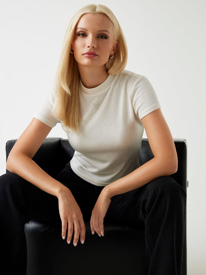 Step into timeless charm with our viscose-blend jersey top. The playful mock neck and short sleeves add dynamic appeal. Enjoy optimal comfort in the regular fit. An understated rhinestone triangle logo adds a touch of luxury. Perfect for eco-conscious fashion enthusiasts.