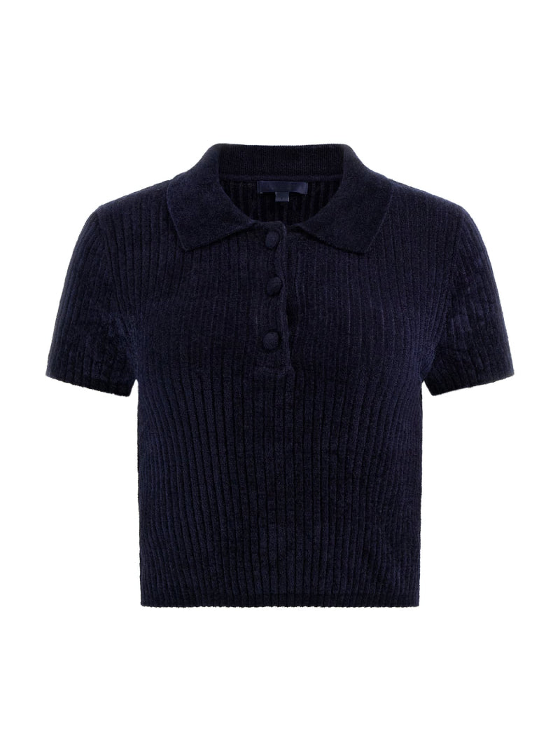 The “Mona” chenille crop polo by GUESS offers a sleek, streamlined fit in timeless black. With its plush chenille texture, clean folded collar, short sleeves and cropped length that subtly reveals your waist, it strikes the perfect balance between sporty ease and elevated sophistication. Ideal for transitioning from relaxed days to stylish evenings.