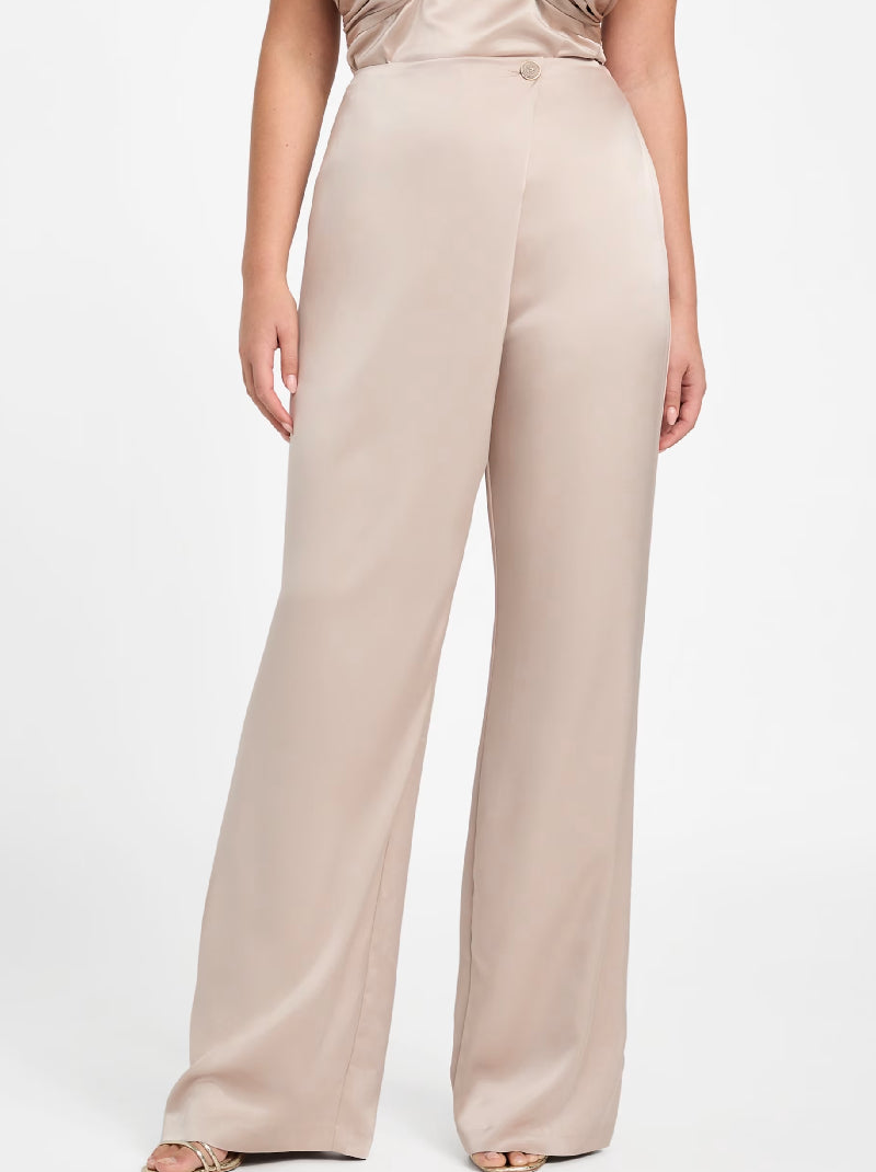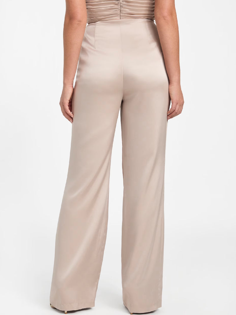 Exude elegance with these woven satin trousers designed to move with effortless grace. Featuring a unique layered waistband with a single-button and side-zip closure, this piece offers a subtle yet refined detail. The ultra-high waist flatters the silhouette while the wide-leg cut elongates the frame for a sophisticated finish. Crafted from a luxurious blend of acetate and polyester, the fabric drapes beautifully with a soft, fluid touch. Perfect for refined occasions or elevating your everyday chic.