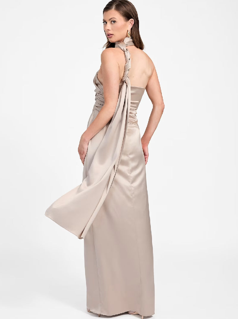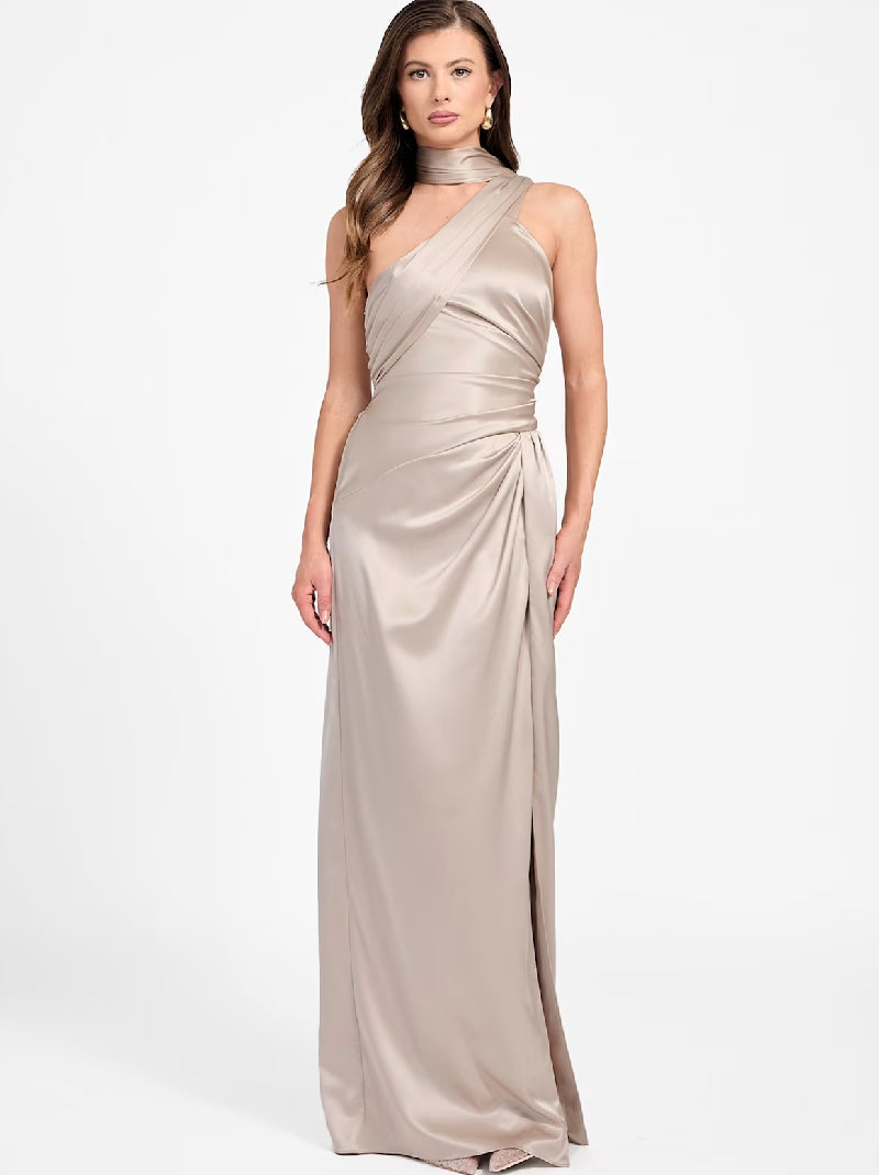 An exquisite satin gown that radiates luxury and timeless elegance. Designed with an asymmetrical V-neckline and a one-shoulder silhouette, the bodice features delicate pleats and ruching for a refined touch. The flowing tulip-shaped skirt is complemented by a dramatic Watteau train, creating a graceful, show-stopping effect. Finished with a discreet side zip, this gown is crafted from a lustrous blend of acetate and polyester, offering a smooth and fluid drape. Perfect for unforgettable evenings and special occasions.