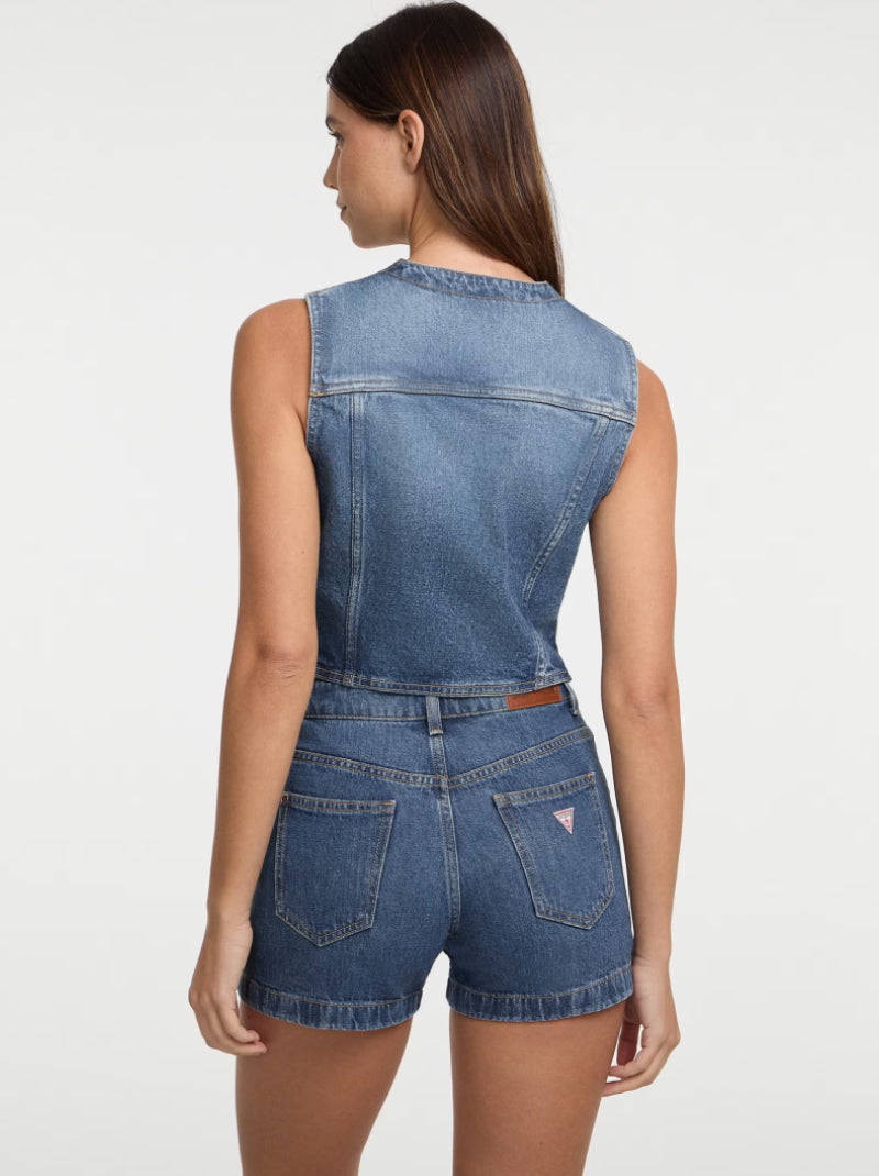 Take your denim look to the next level with this Eco Denim Vest from GUESS Jeans. Featuring a sleeveless design with a structured silhouette, this cropped vest offers a contemporary edge while honoring classic denim heritage. Complete with a pointed collar, front flap pockets, and button-down closure, it’s perfect for layering over tanks, tees, or dresses. Crafted with sustainability in mind, this piece uses eco-conscious denim to reduce environmental impact—so you can look good and feel good.