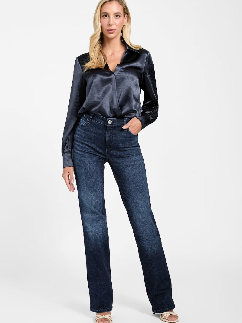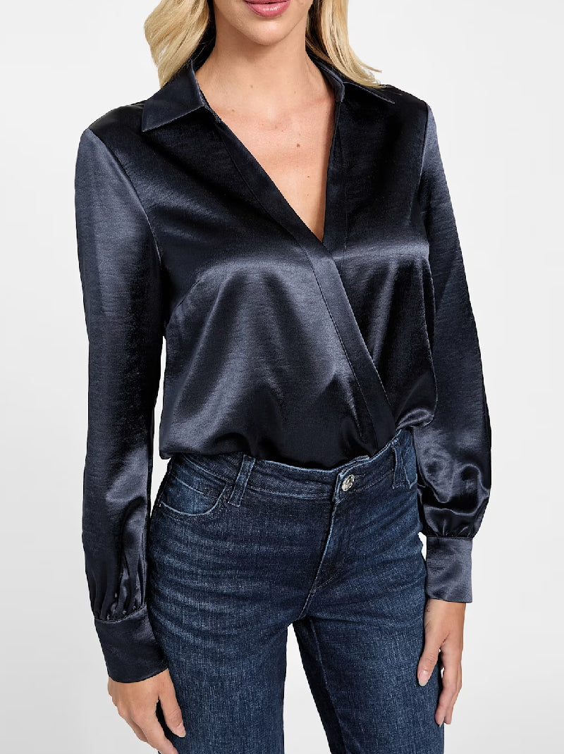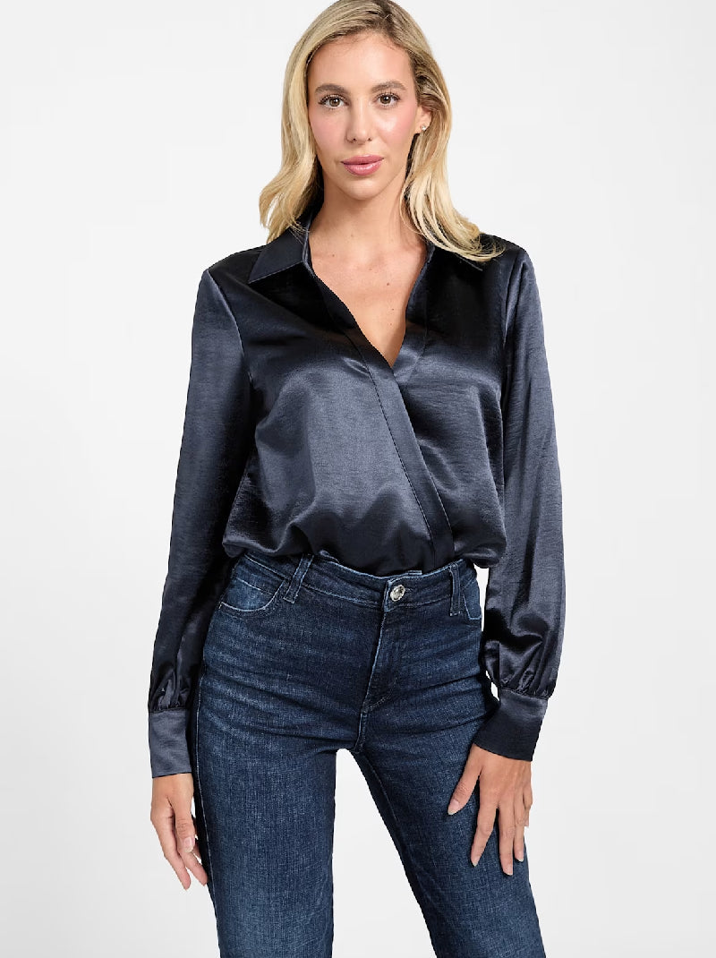 Enhance your wardrobe with the “Ec Leah” satin bodysuit by GUESS, rendered in a rich blue hue for elegant impact. The deep V‑neckline and cleverly concealed straps deliver a sleek, refined silhouette while the satin finish drapes effortlessly along the body. Whether for daytime sophistication or evening allure, this piece stands out with quiet confidence.