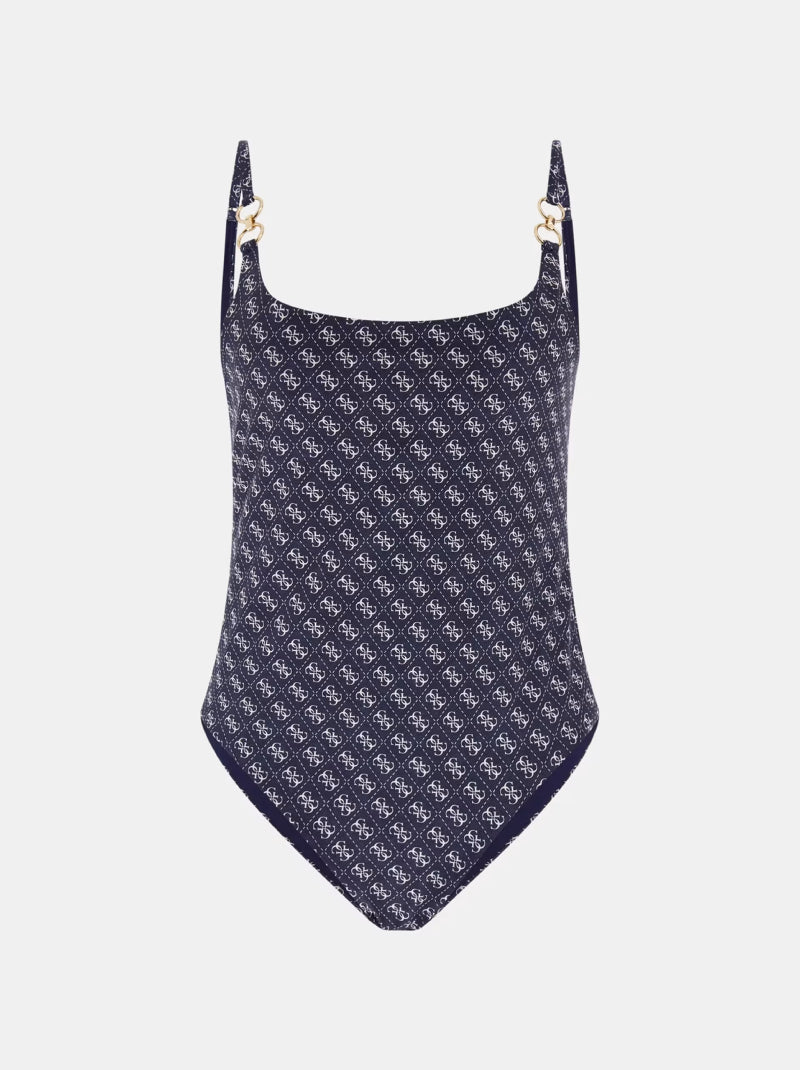 Make a bold poolside statement with the GUESS 4G Logo One-Piece Swimsuit in a refined beige tone. Featuring an all-over 4G monogram print, this sleek design boasts a flattering scoop neckline and open back for a modern, elegant silhouette. The high-cut legs enhance the figure, while the signature GUESS charm adds a luxurious touch. Perfect for beach lounging or a stylish dip in the pool.