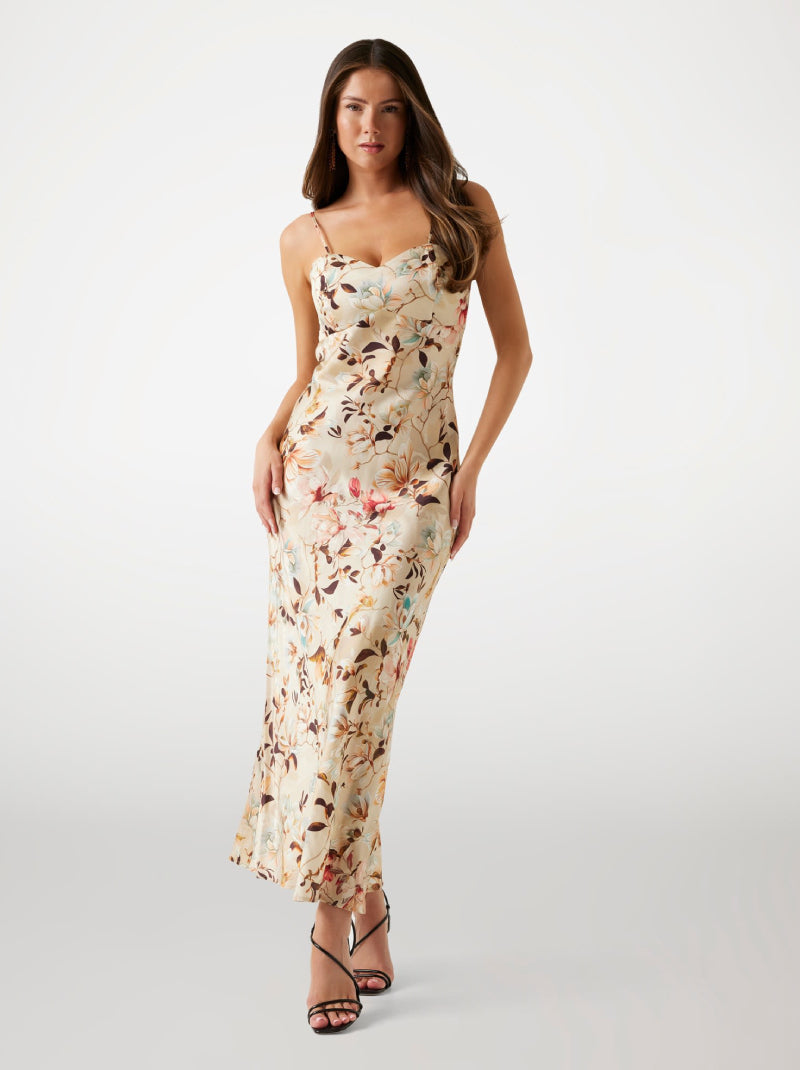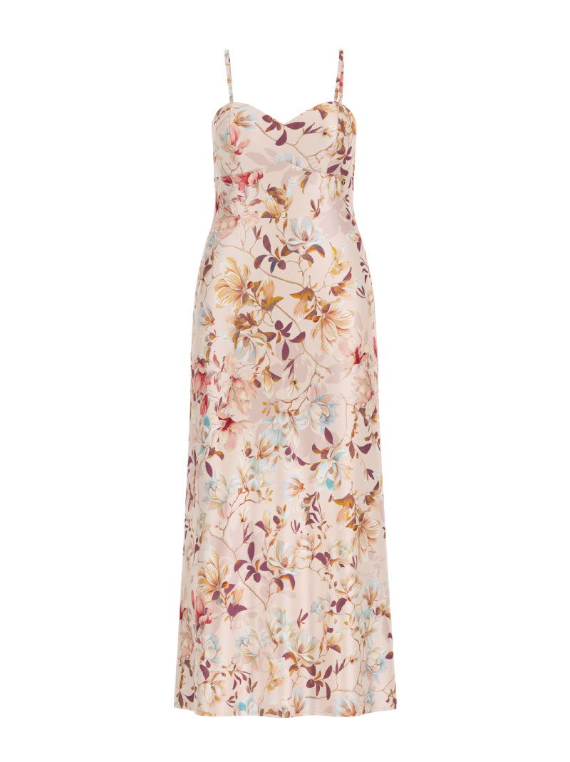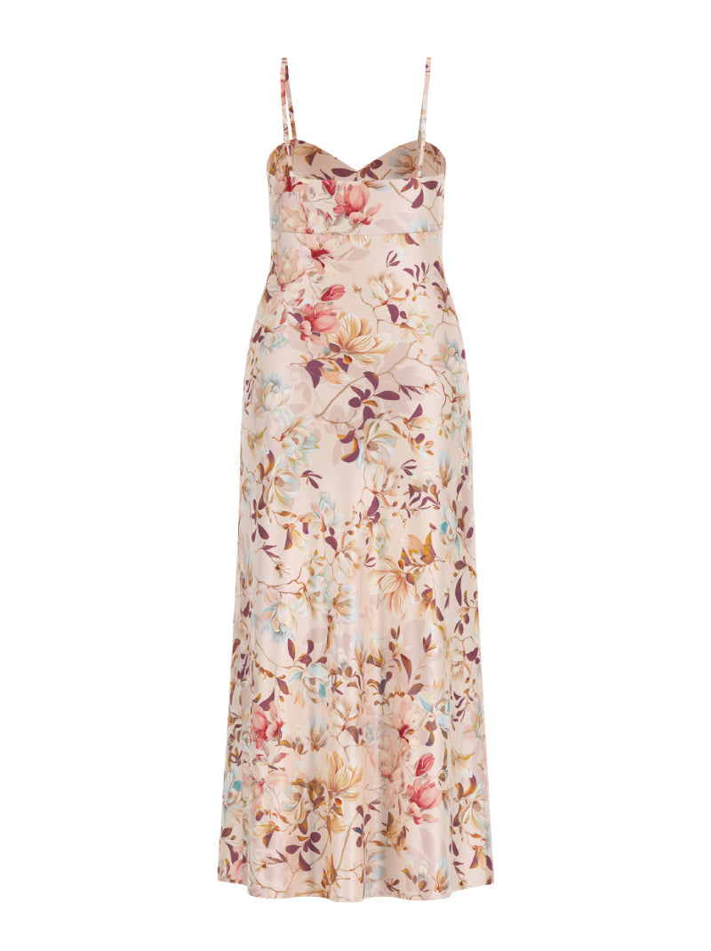 Step into effortless elegance with the GUESS Floral Print Slip Dress. This flowy midi-length dress features delicate spaghetti straps, a V-neckline, and a flattering bias-cut silhouette that skims the body with graceful ease. Adorned with an all-over romantic floral print, it’s perfect for summer brunches, date nights, or vacation escapes. Lightweight and feminine, this slip dress is a timeless wardrobe essential that brings effortless charm to every occasion.