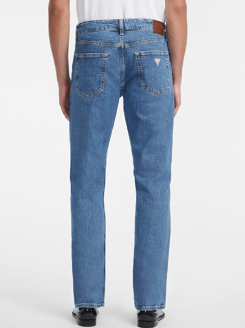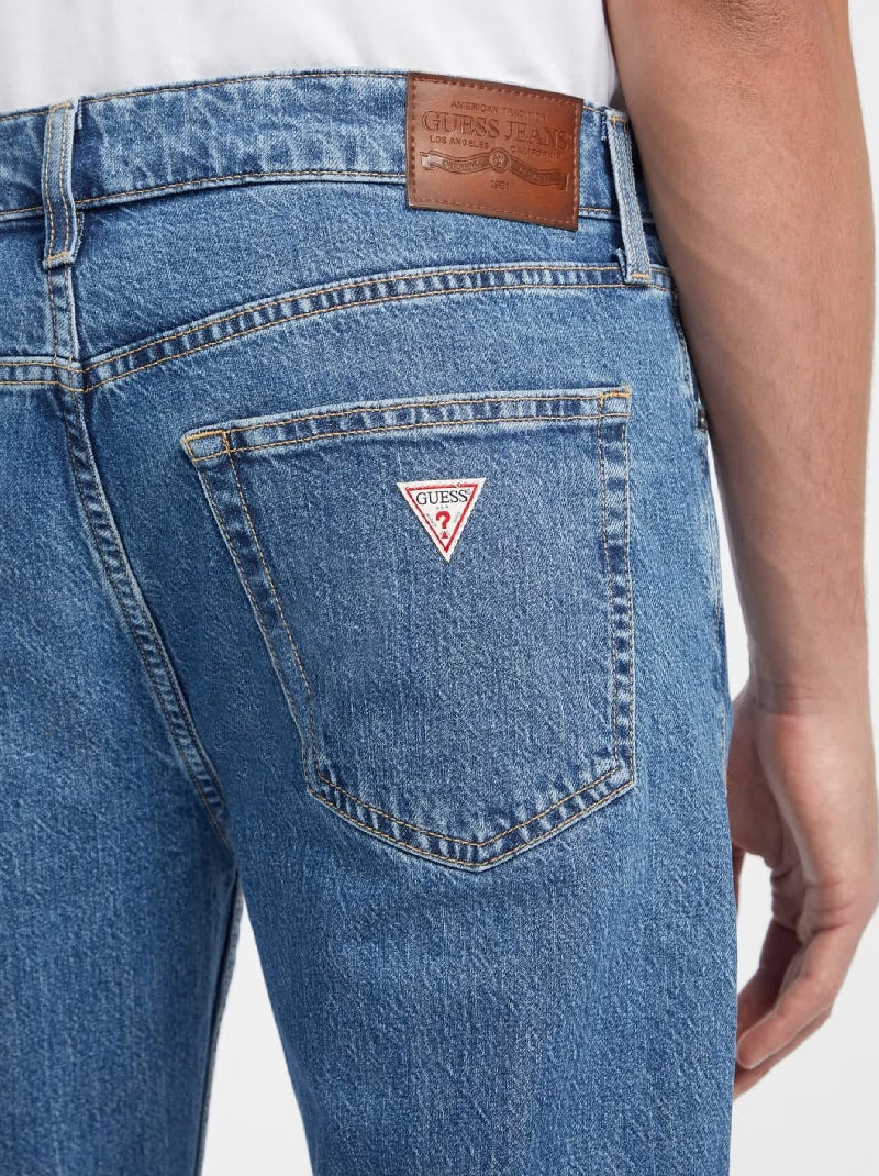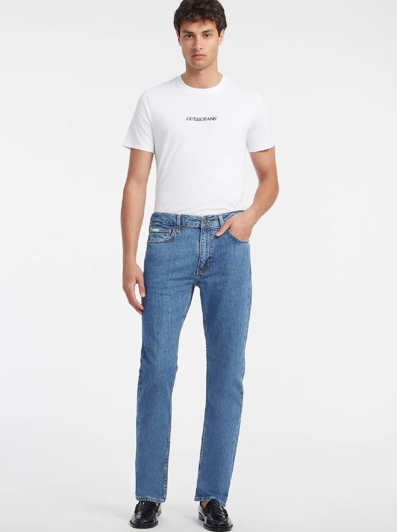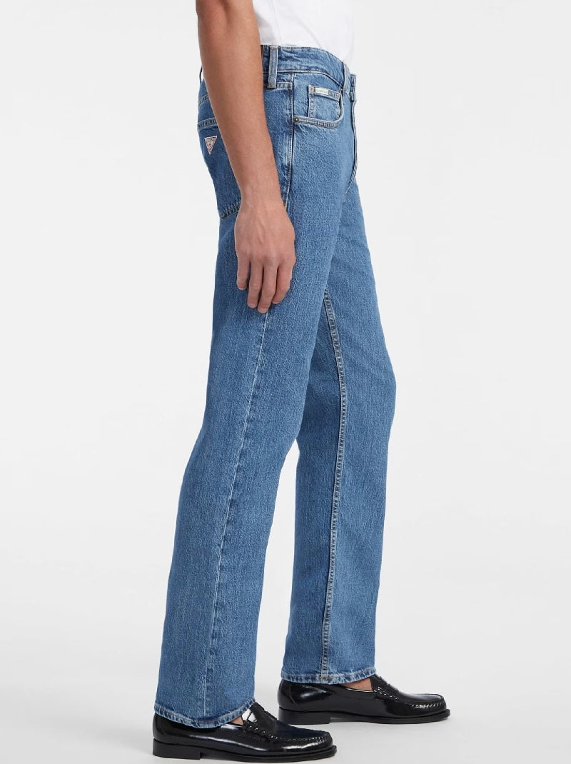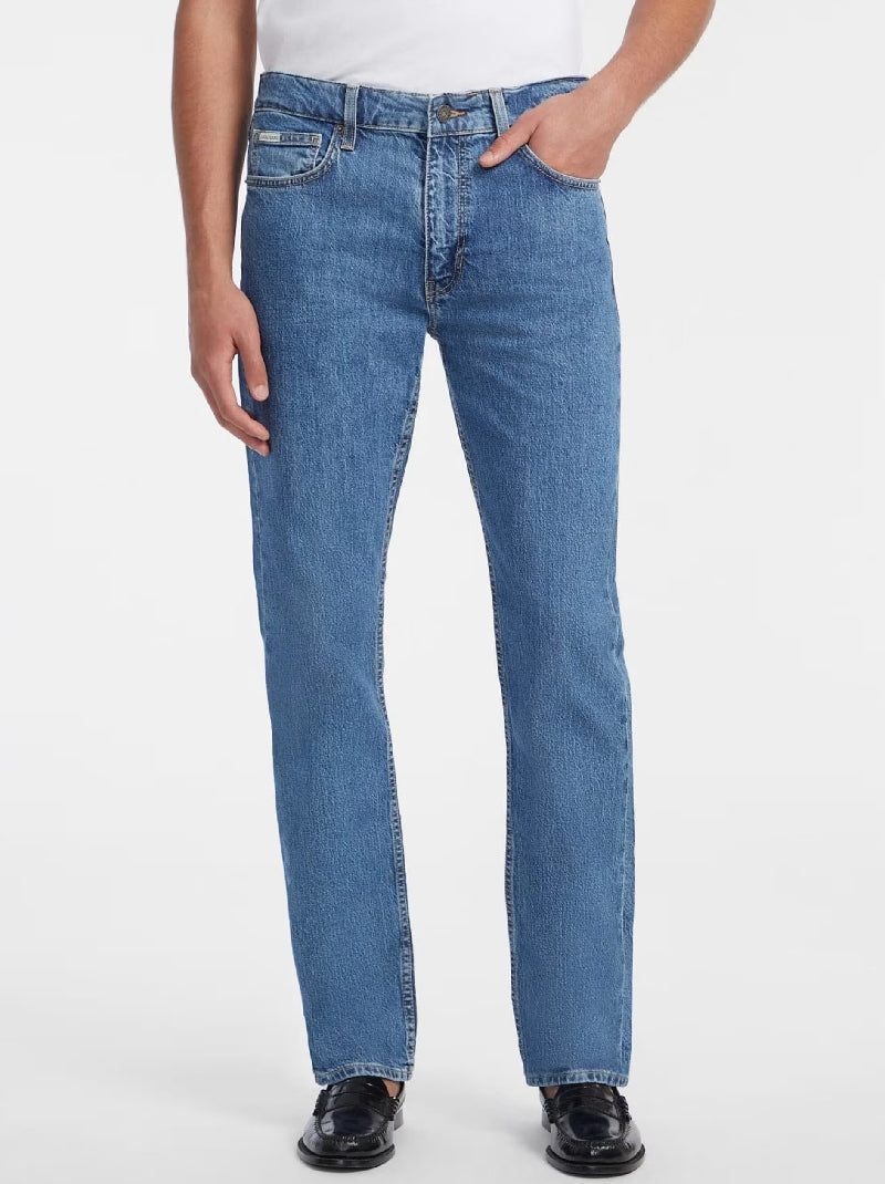 Understated flair meets relaxed vibe. Stretch denim with five-pocket design gives slim and straight fit at the hips. Zip and button closure add ease. Unique look from artistic indigo wash.