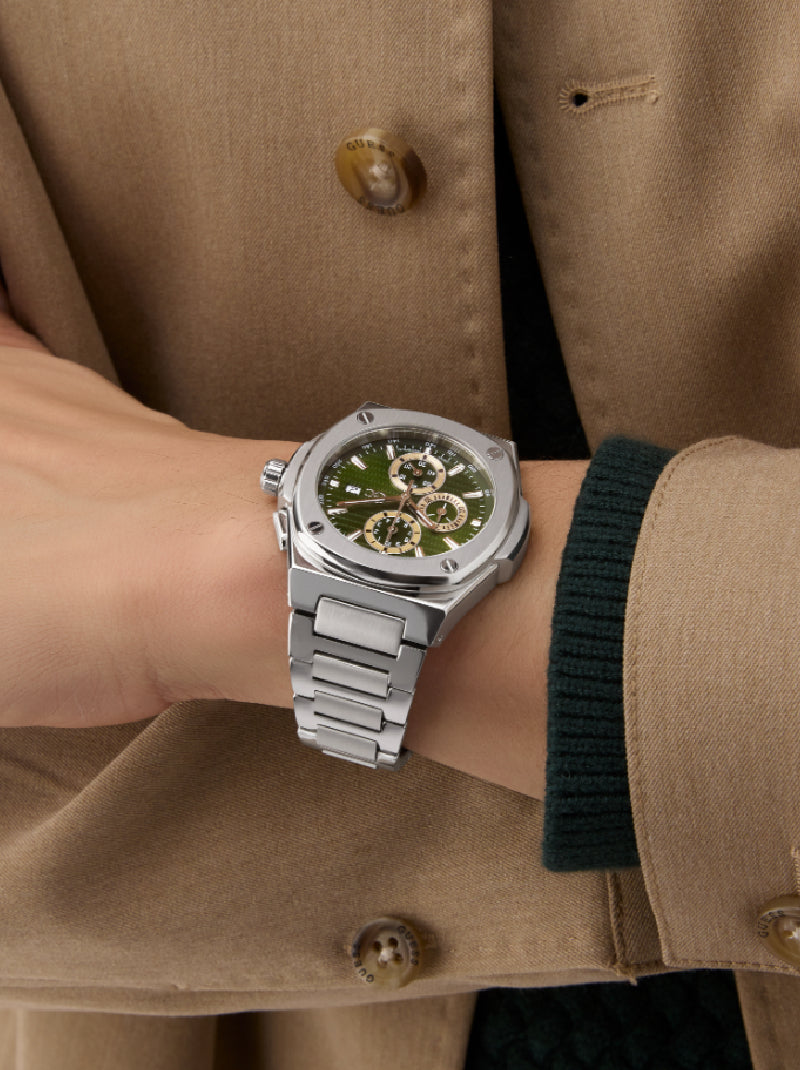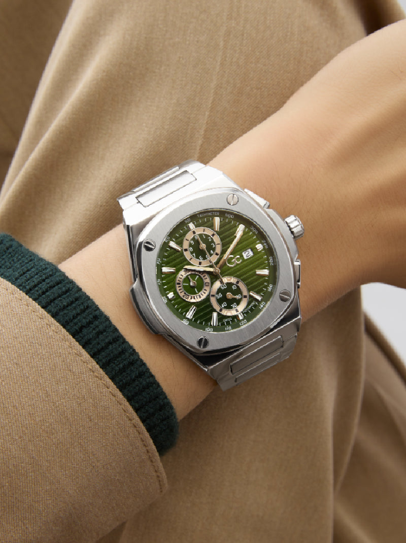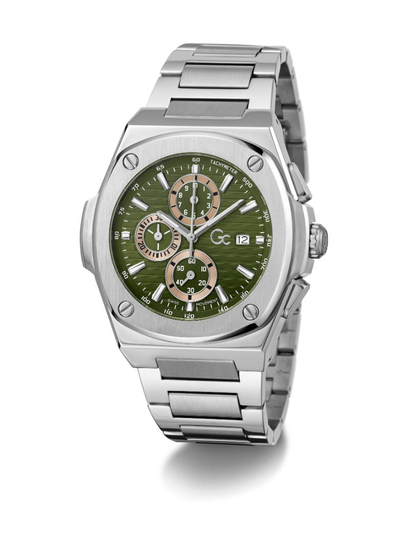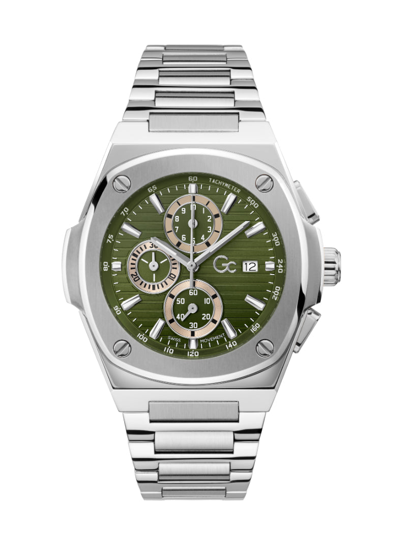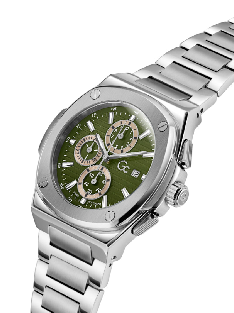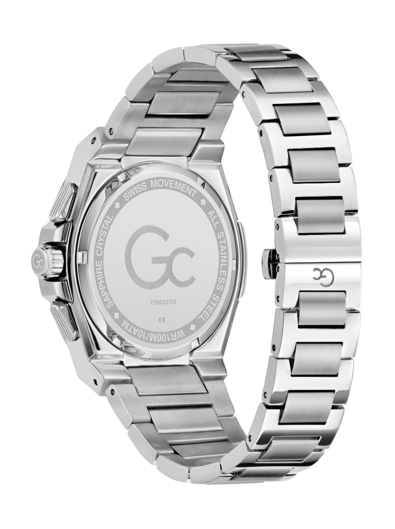 The Gc Coussin Shape Chrono is a daring expression of strength and sophistication that merges luxe styling with high-performance precision. Its distinctive 44mm coussin-shaped case is expertly finished in a mix of polished and brushed 316L stainless steel for a powerful statement on the wrist. The solid-link bracelet with a dual pusher deployment clasp, engineered for both comfort and confidence, completes the look.