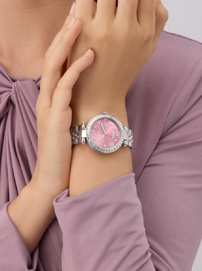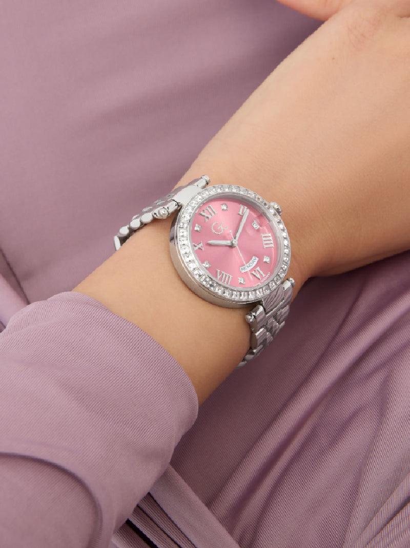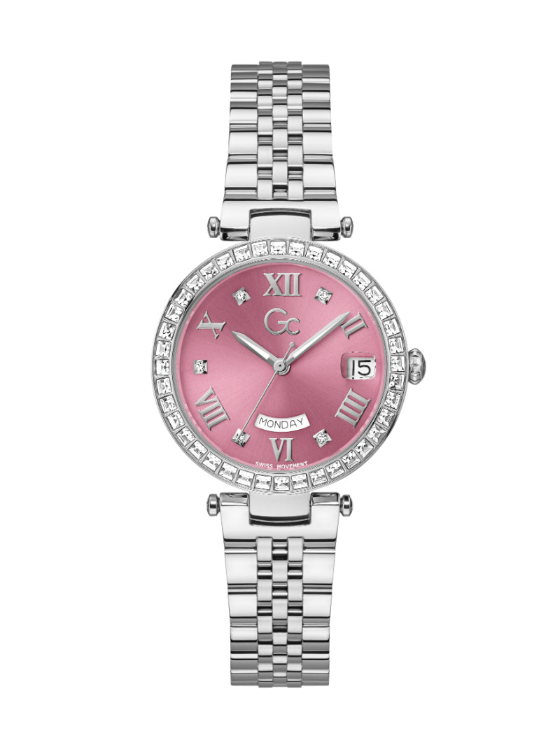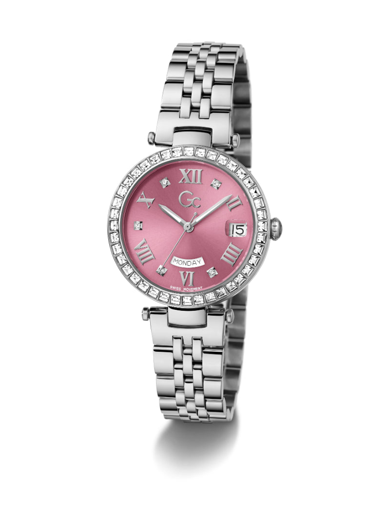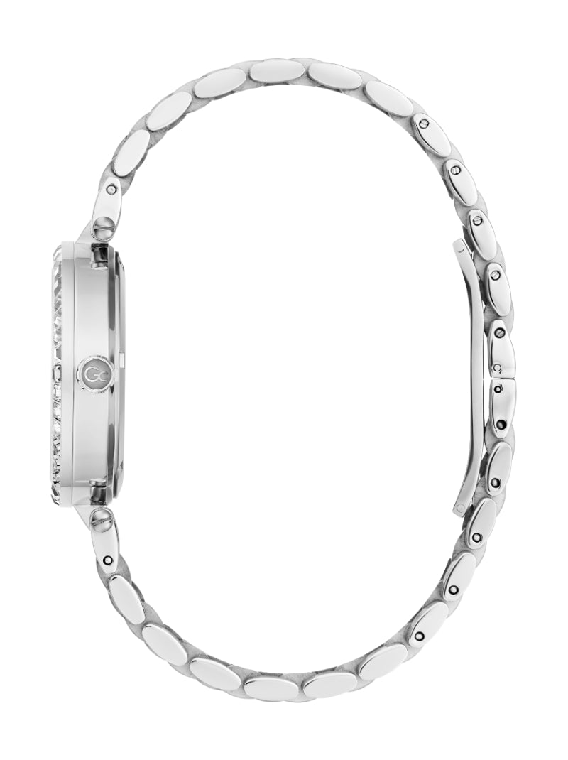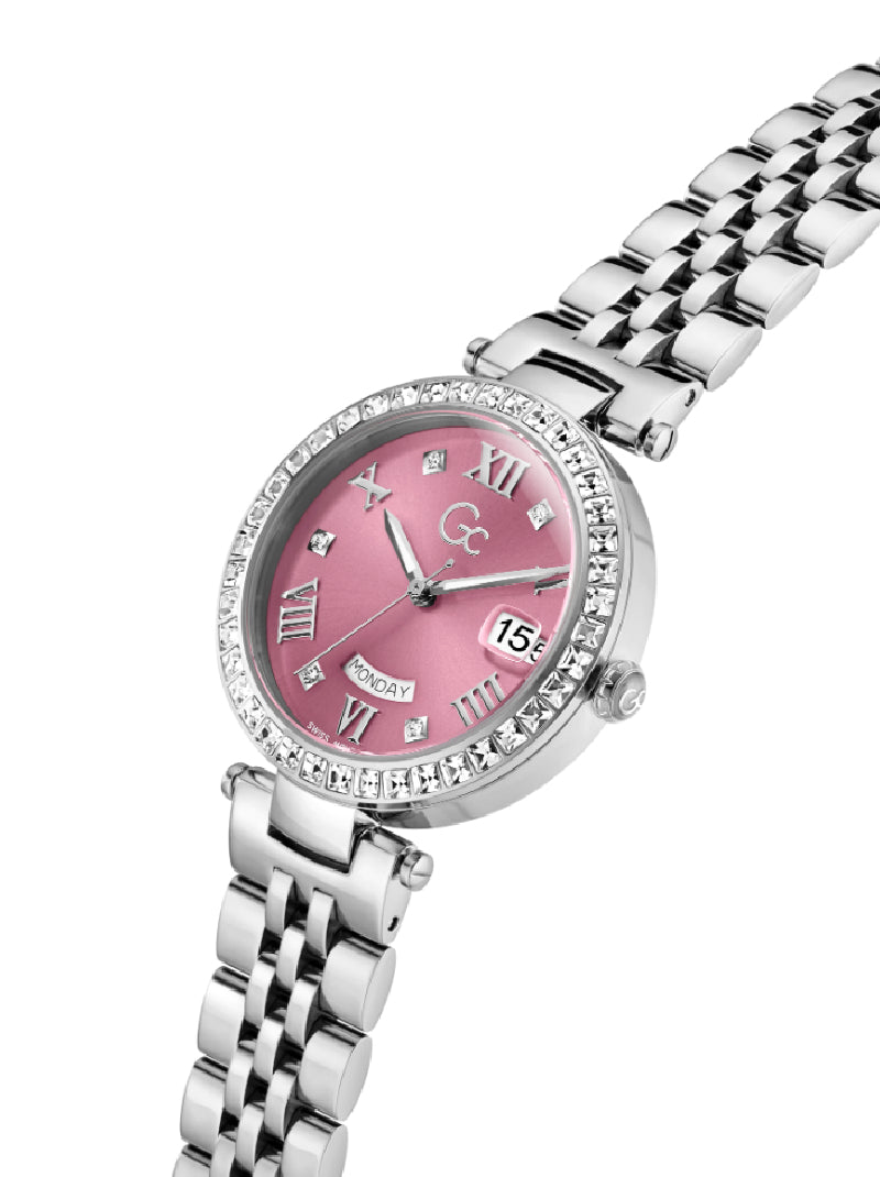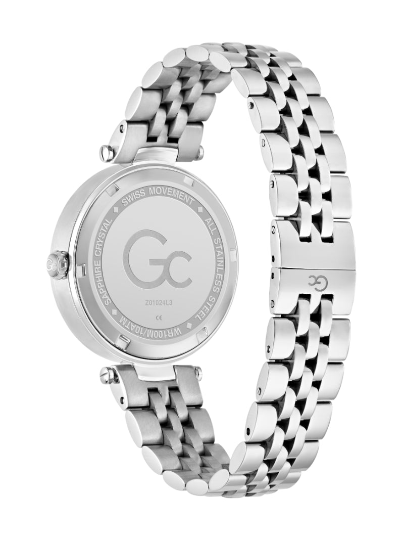 The Gc Flair Crystal blends bold glamor with timeless precision. Its 34mm round case, impeccably crafted from 316L stainless steel, shines in polished silver finish and is adorned with dazzling crystal accents transforming it into a true statement piece. The matching bracelet secured by a seamless deployment buckle continues the luxe styling for a flawless finish on the wrist.