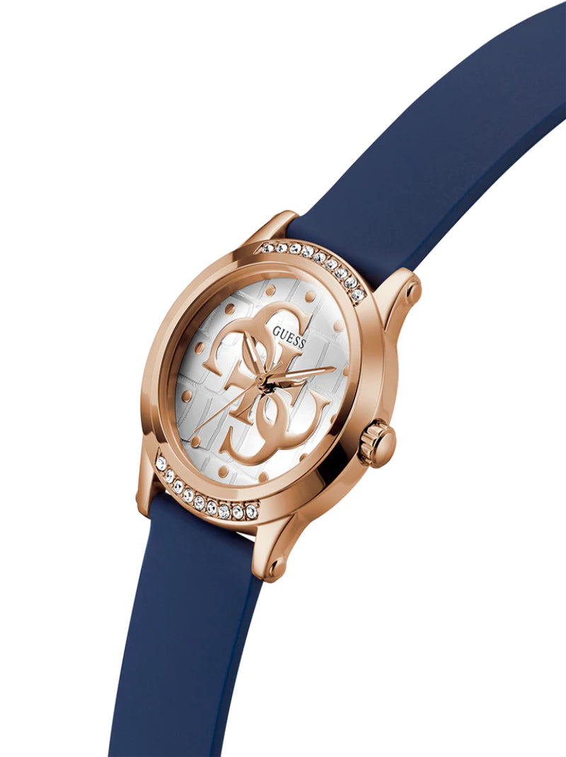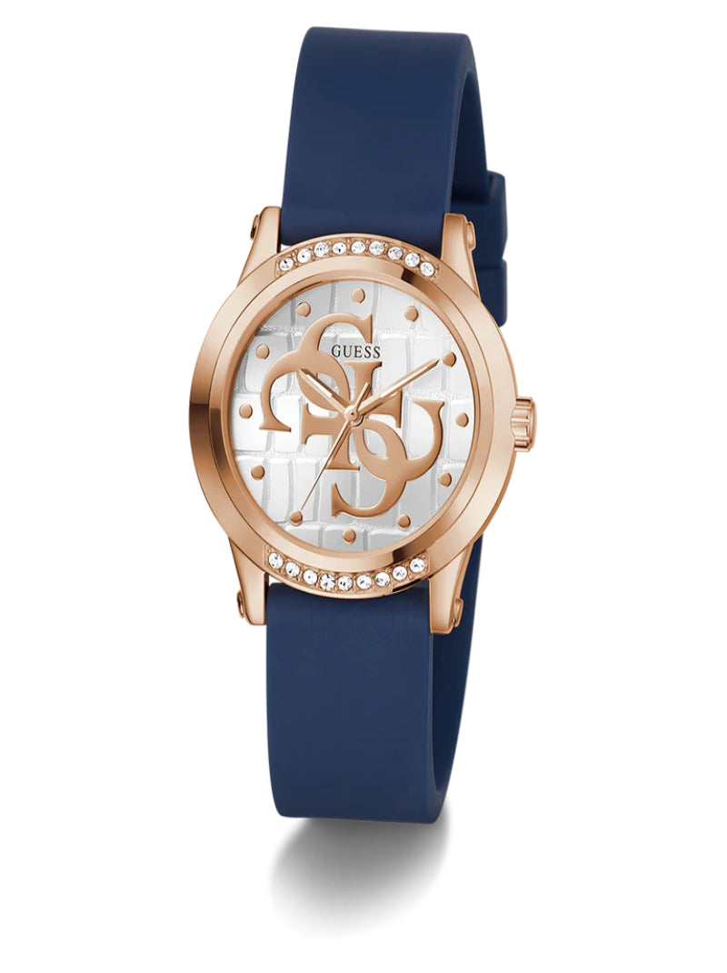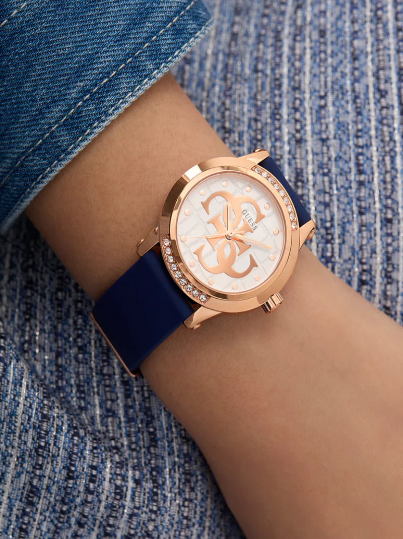 The GUESS Ladies Blue Rose Gold-Tone Analog Watch is an elegant and eye-catching timepiece that blends modern style with timeless luxury. Featuring a vibrant blue dial and rose gold-tone accents, this watch offers a stunning contrast that enhances its sophisticated look. The classic analog display ensures easy timekeeping, while the high-quality materials provide durability and a polished finish. Whether for formal occasions or casual wear, this watch adds a refined touch to any outfit, making it the perfect accessory for the modern woman.