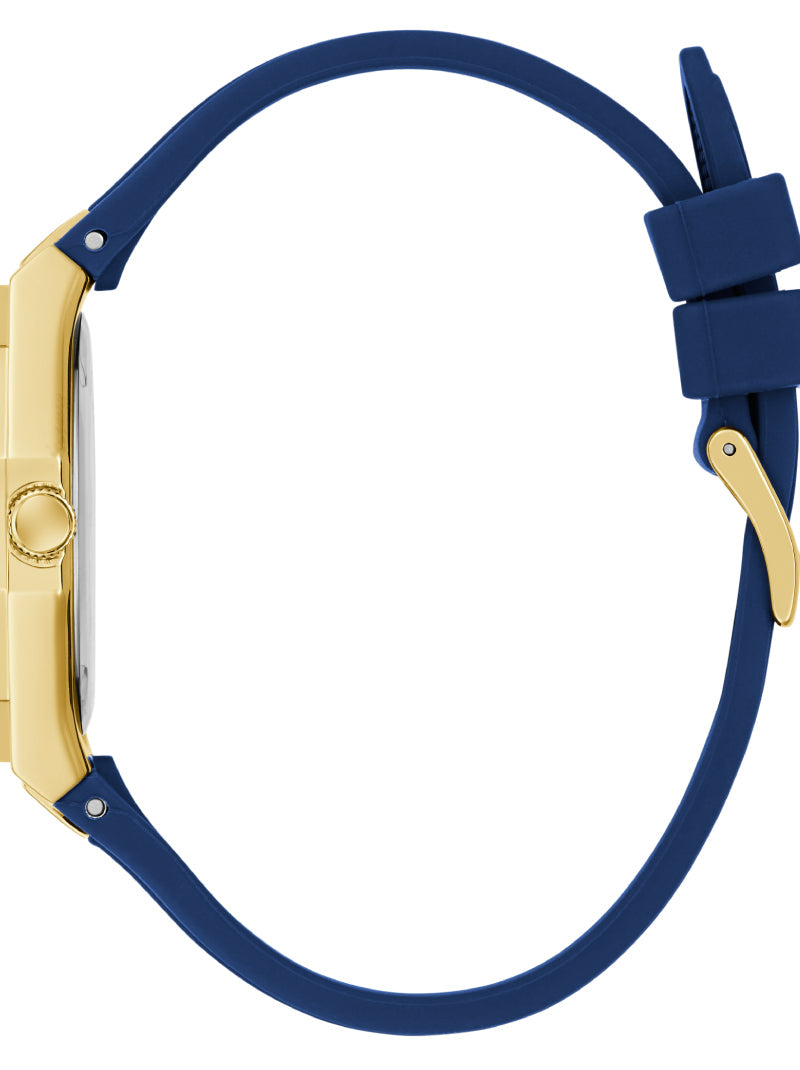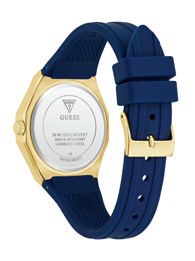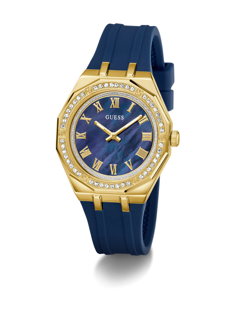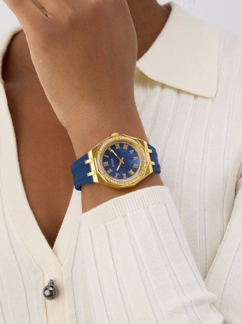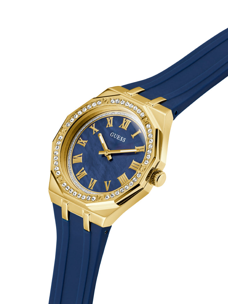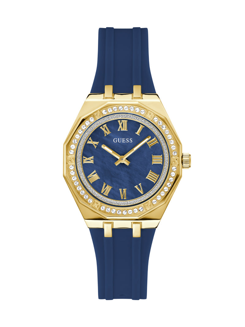 Add a bold touch to your wrist with this striking GUESS women’s watch. Featuring a radiant gold-tone case adorned with sparkling crystals, the deep blue dial is complemented by Roman numeral indexes for a classic yet modern vibe. Paired with a comfortable blue silicone strap, this watch brings together luxury and everyday wearability in one perfect accessory.