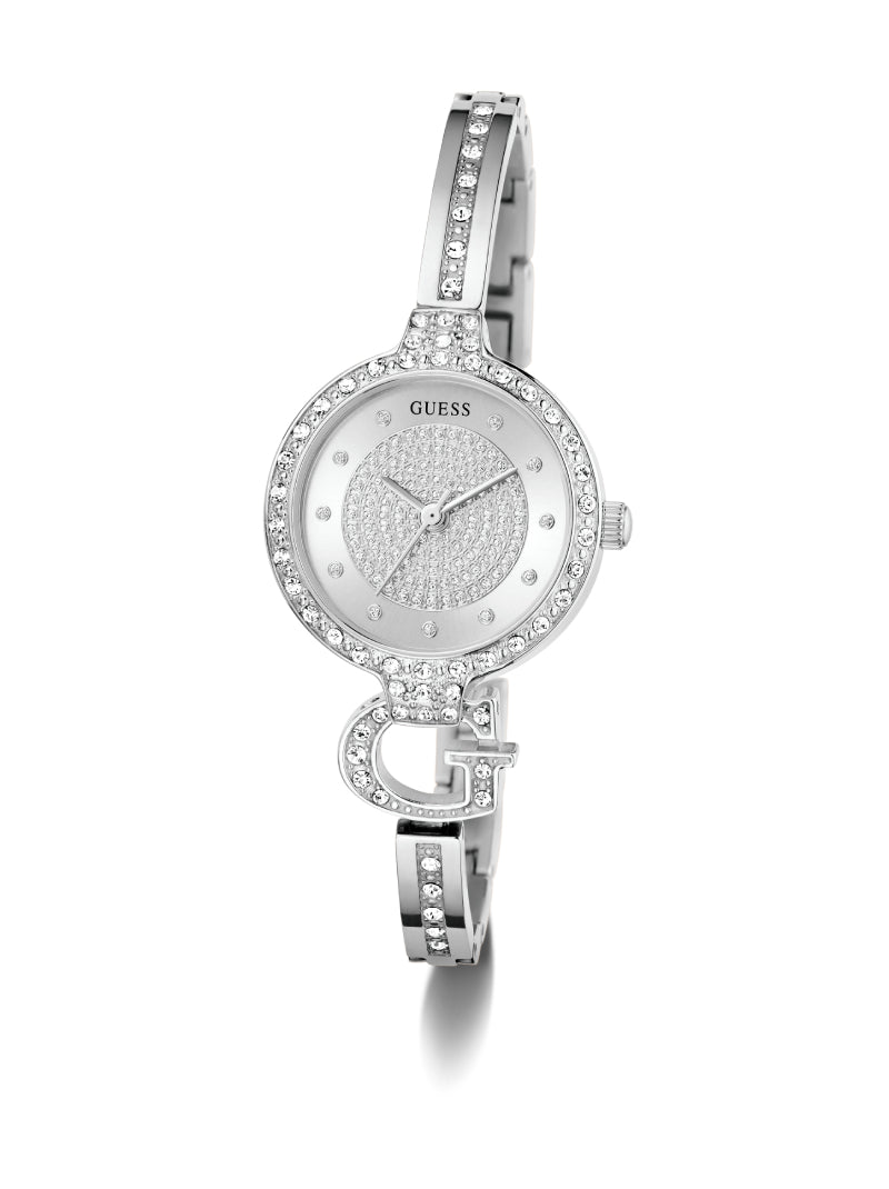 Shimmer in style with this GUESS women’s watch in polished silver-tone stainless steel. The round dial is fully embellished with sparkling crystals, complemented by a crystal-studded bezel and bracelet. Featuring the signature “G” logo charm on the case, this timepiece doubles as both a watch and a statement jewelry piece.