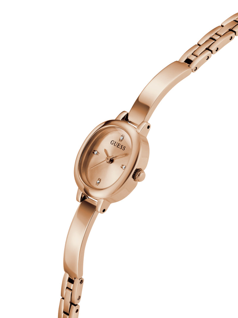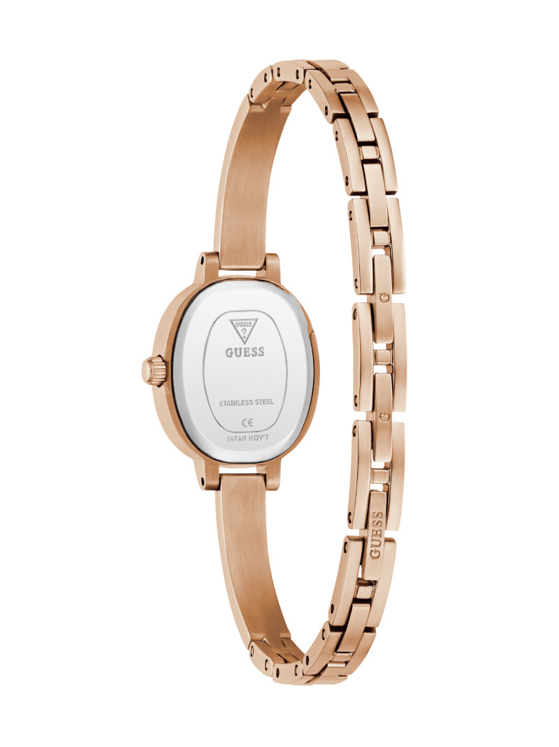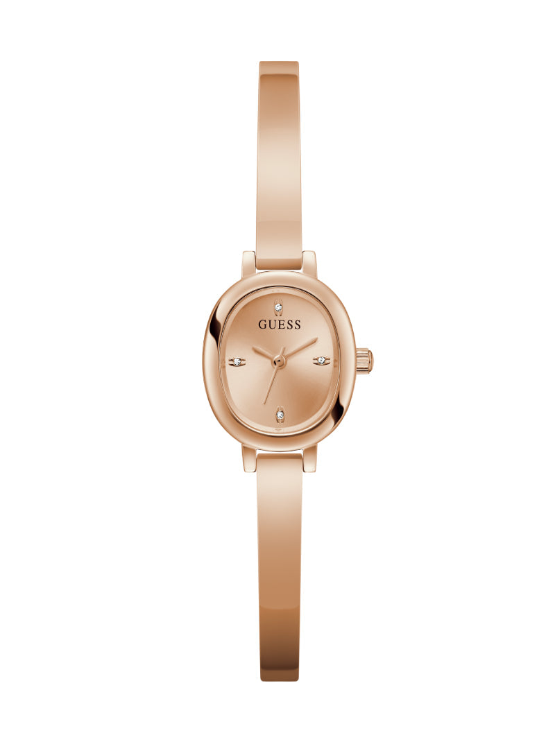 Minimalist yet luxurious, this GUESS women’s watch showcases a rose gold-tone oval case with subtle crystal accents. The matching rose gold bangle bracelet enhances its jewelry-inspired look, making it not just a timepiece but also a sophisticated accessory that elevates any outfit, from daily wear to evening glamour.