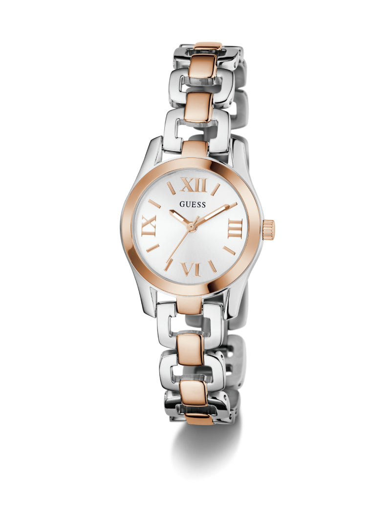 Classic meets contemporary in this two-tone GUESS women’s watch. The silver-tone stainless-steel bracelet is highlighted with rose gold-tone accents, while the sunray silver dial with Roman numeral markers exudes sophistication. This versatile piece blends seamlessly with both casual and dressy looks, making it a must-have in any collection.