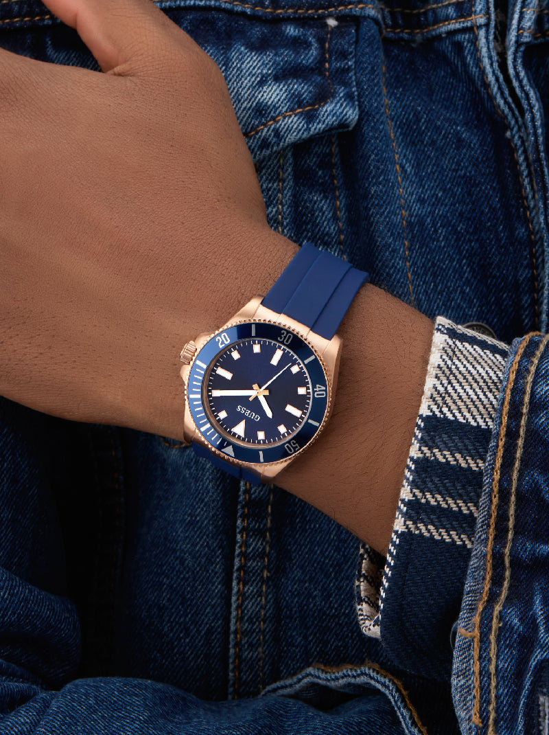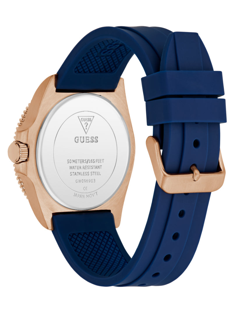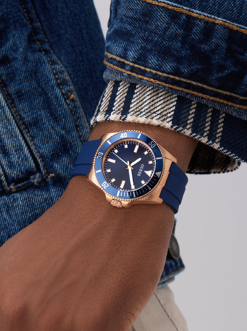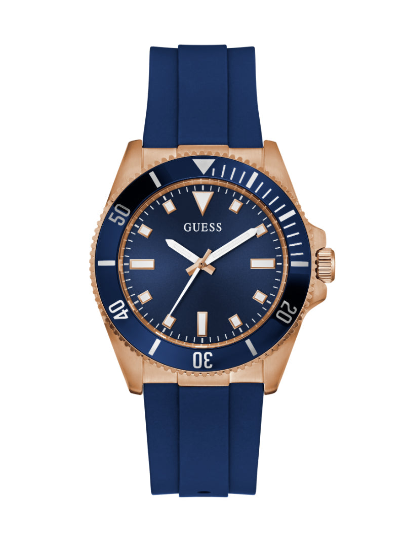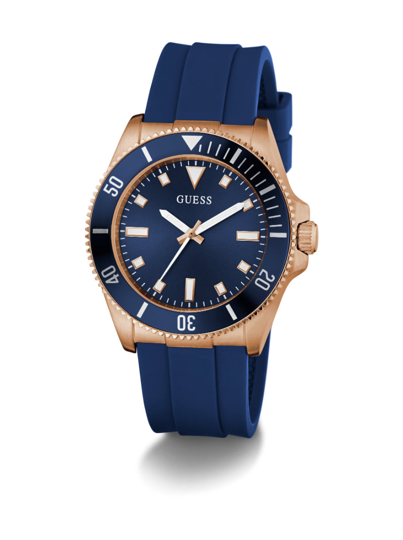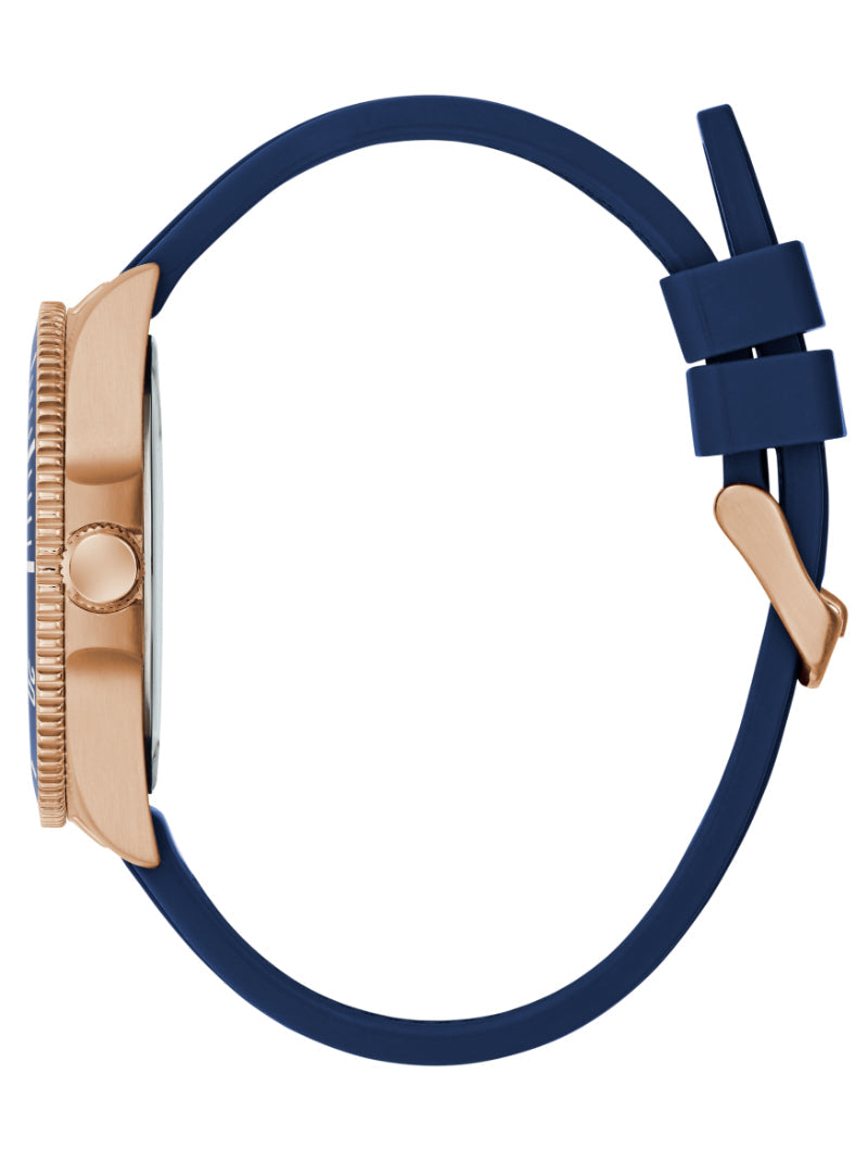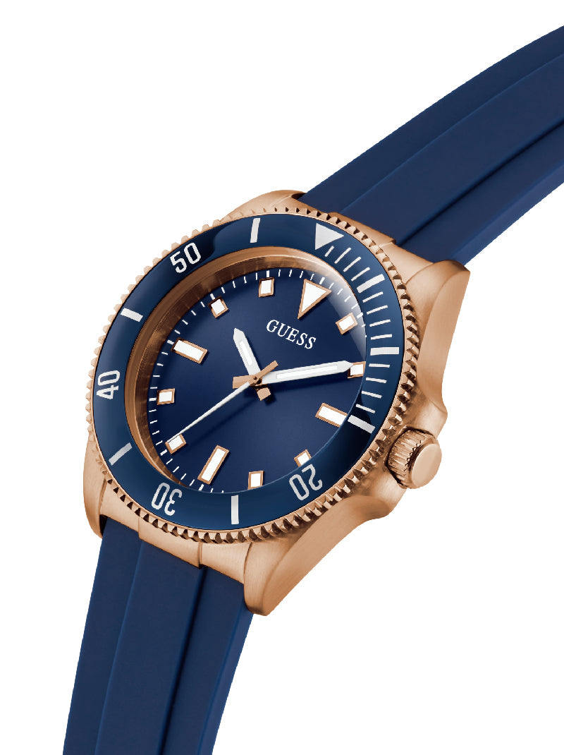 Elevate your look with the striking blend of rose gold-tone and bold blue in this analog watch from GUESS. The warm gleam of the rose-gold case complements the deep blue seconds bezel and dial, while the comfortable blue silicone strap adds a modern sporty edge. With a sizeable 41 mm case diameter , this watch brings both stylish flair and everyday durability.