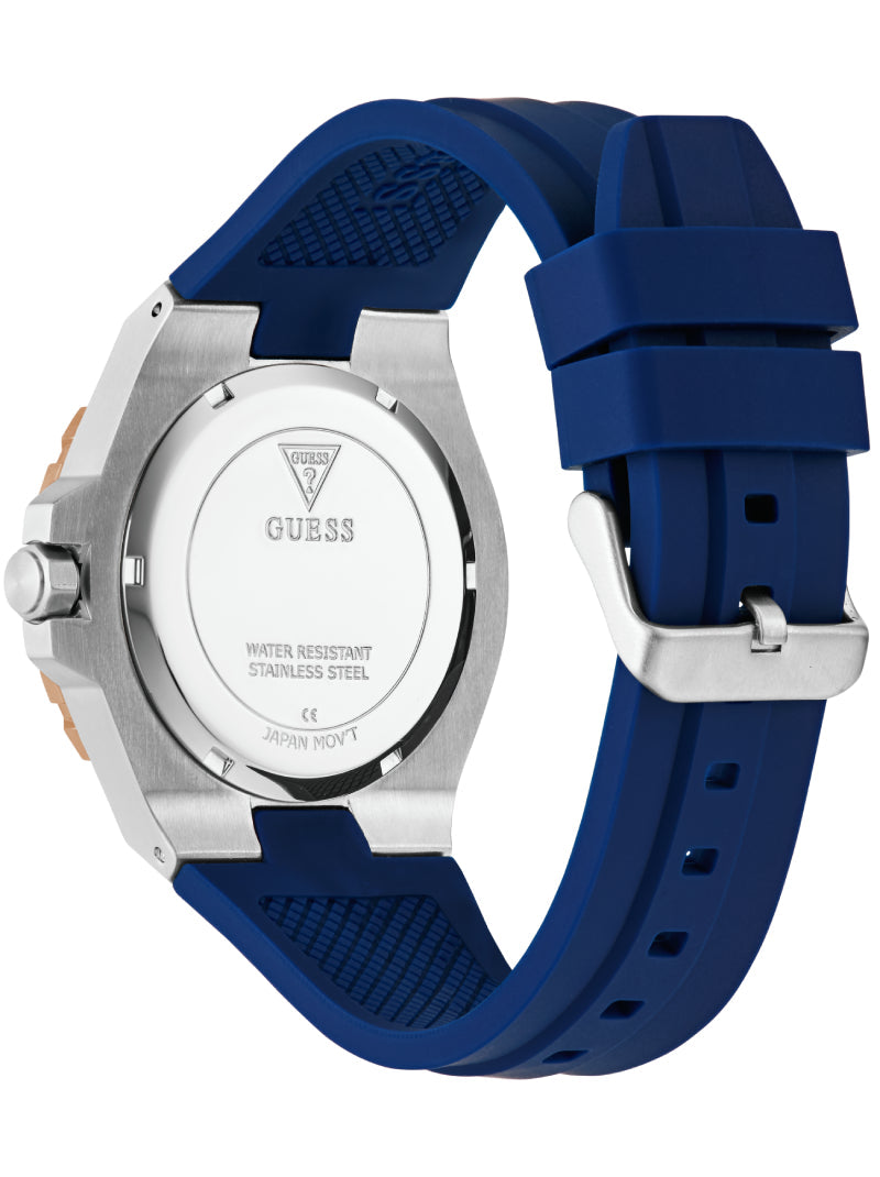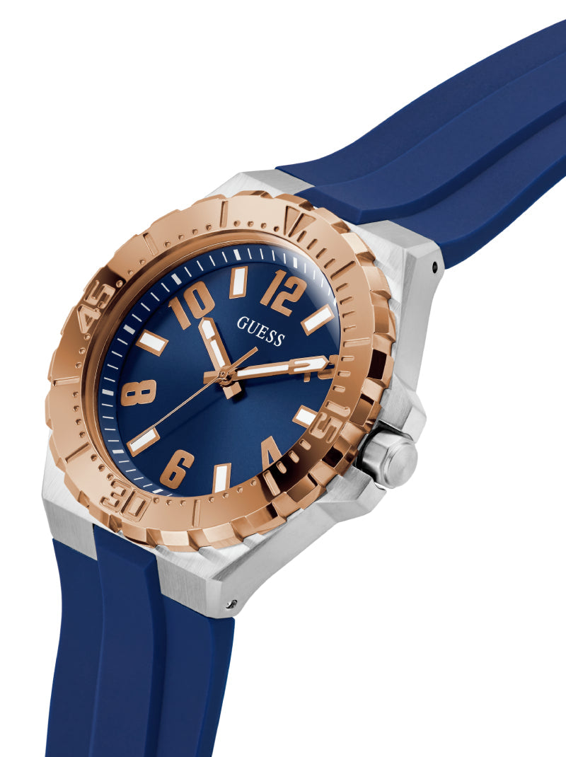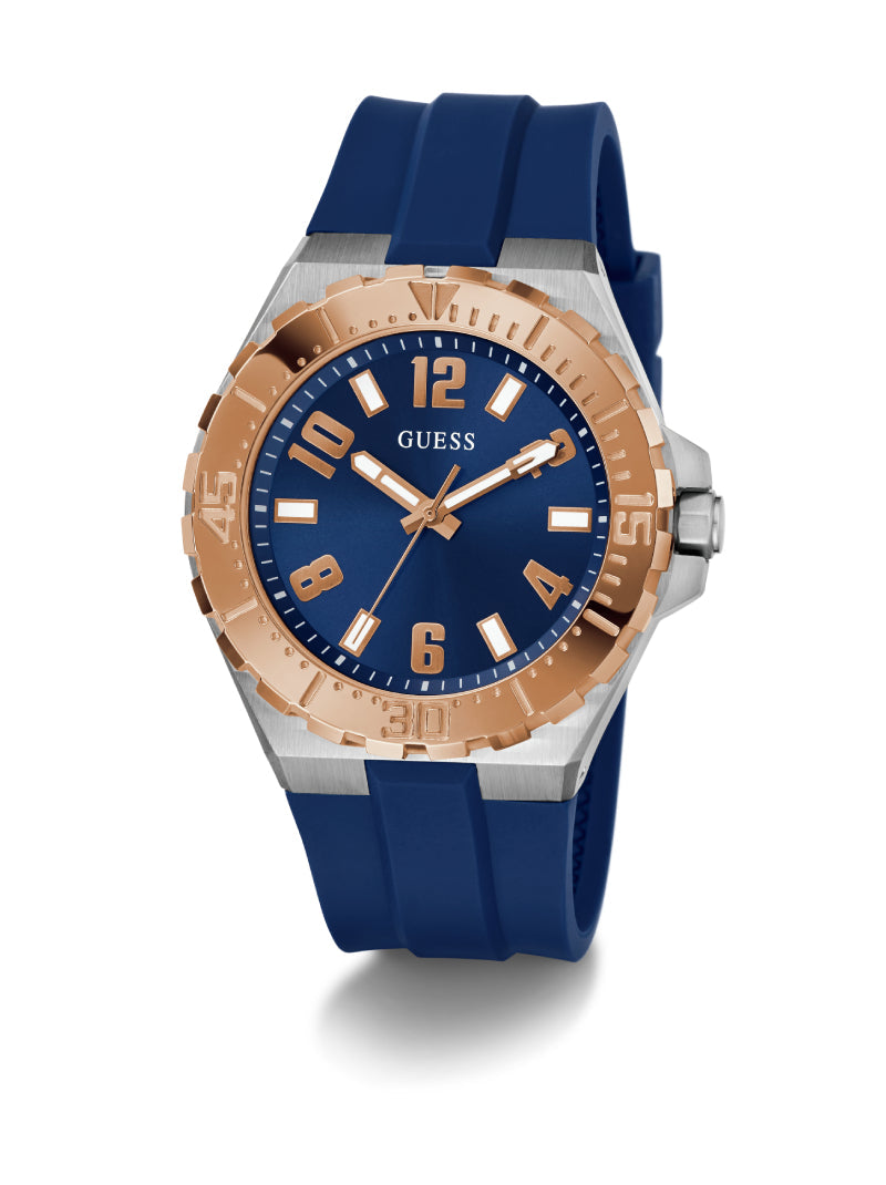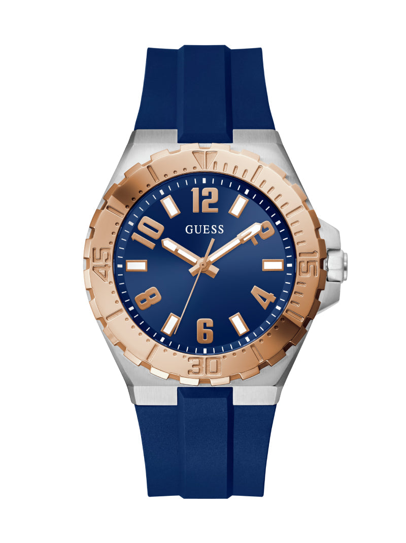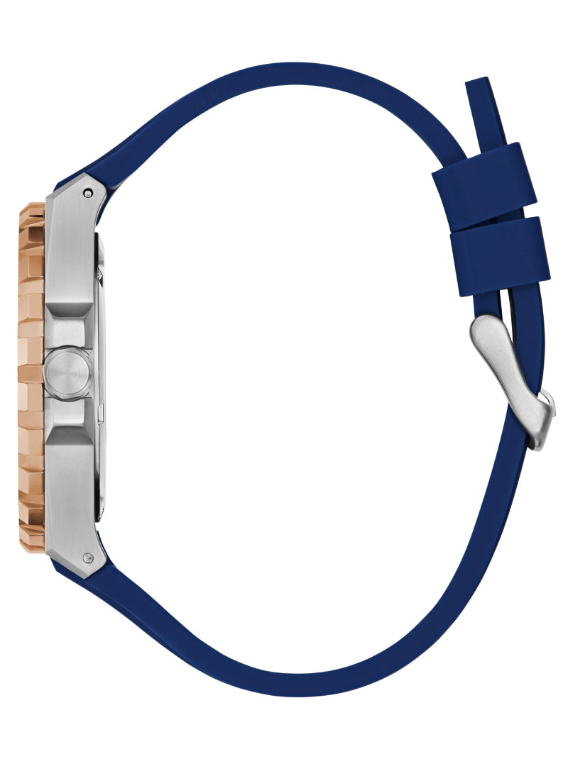 Elevate your sporty style with this GUESS watch featuring a bold blue silicone strap and a striking rose gold-tone bezel. The deep blue dial with luminous indexes ensures easy readability, while the durable stainless steel case brings a touch of sophistication. Perfect for everyday wear with a sporty yet refined edge.
