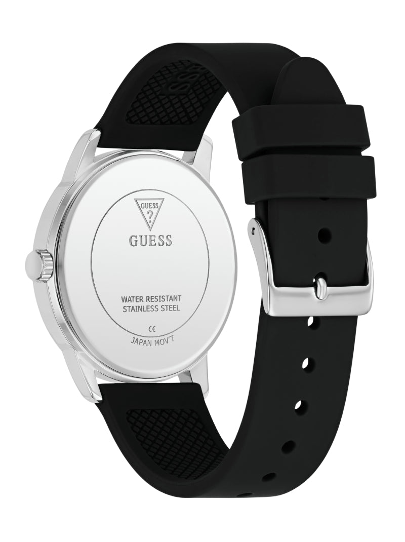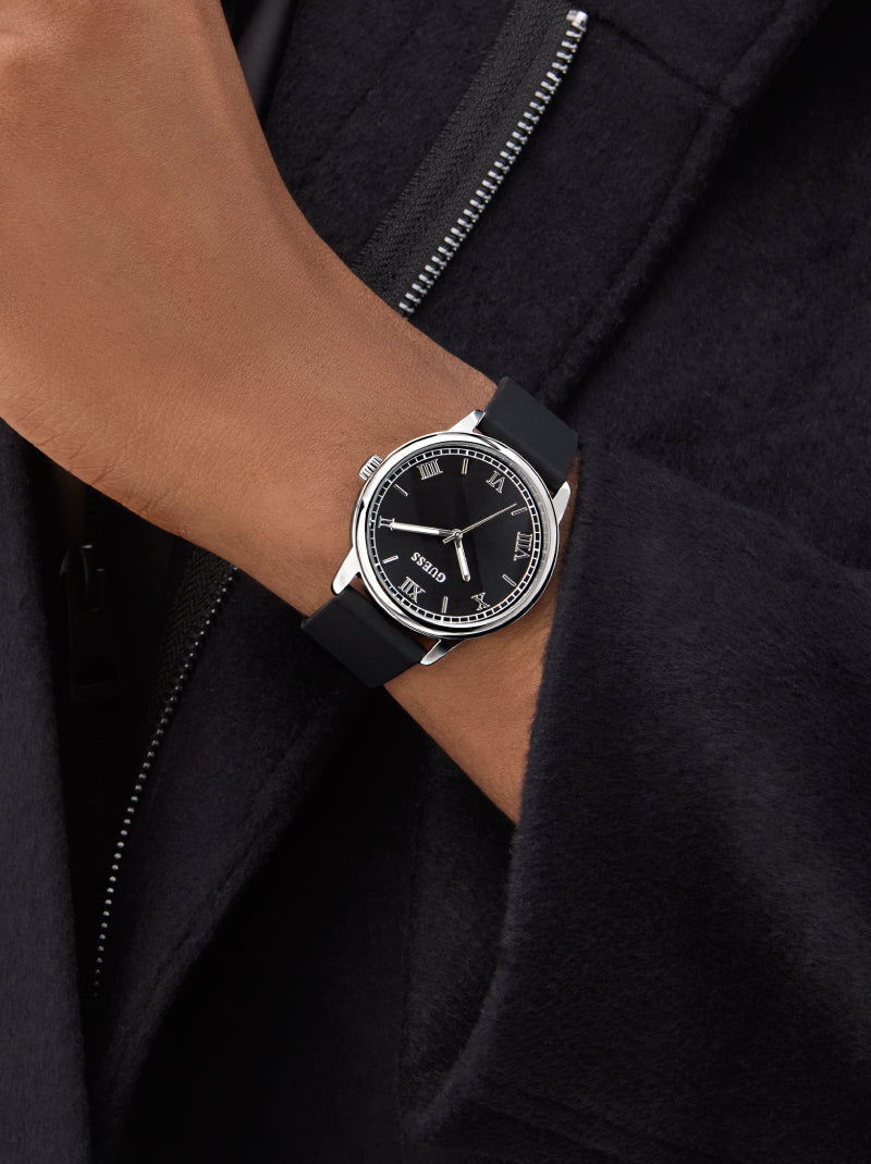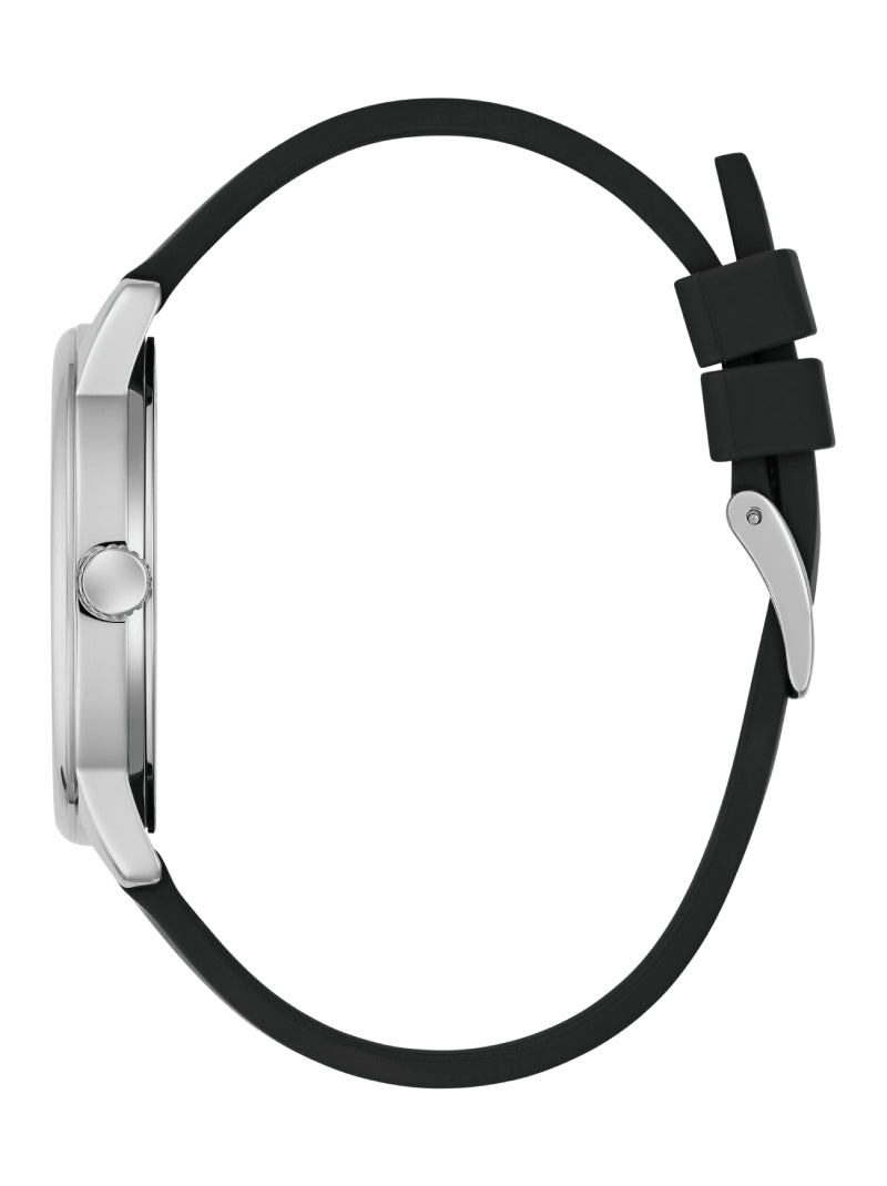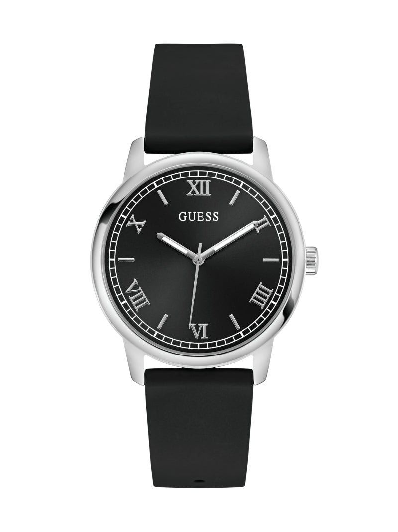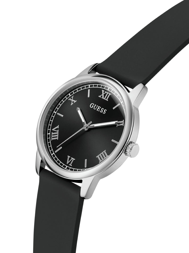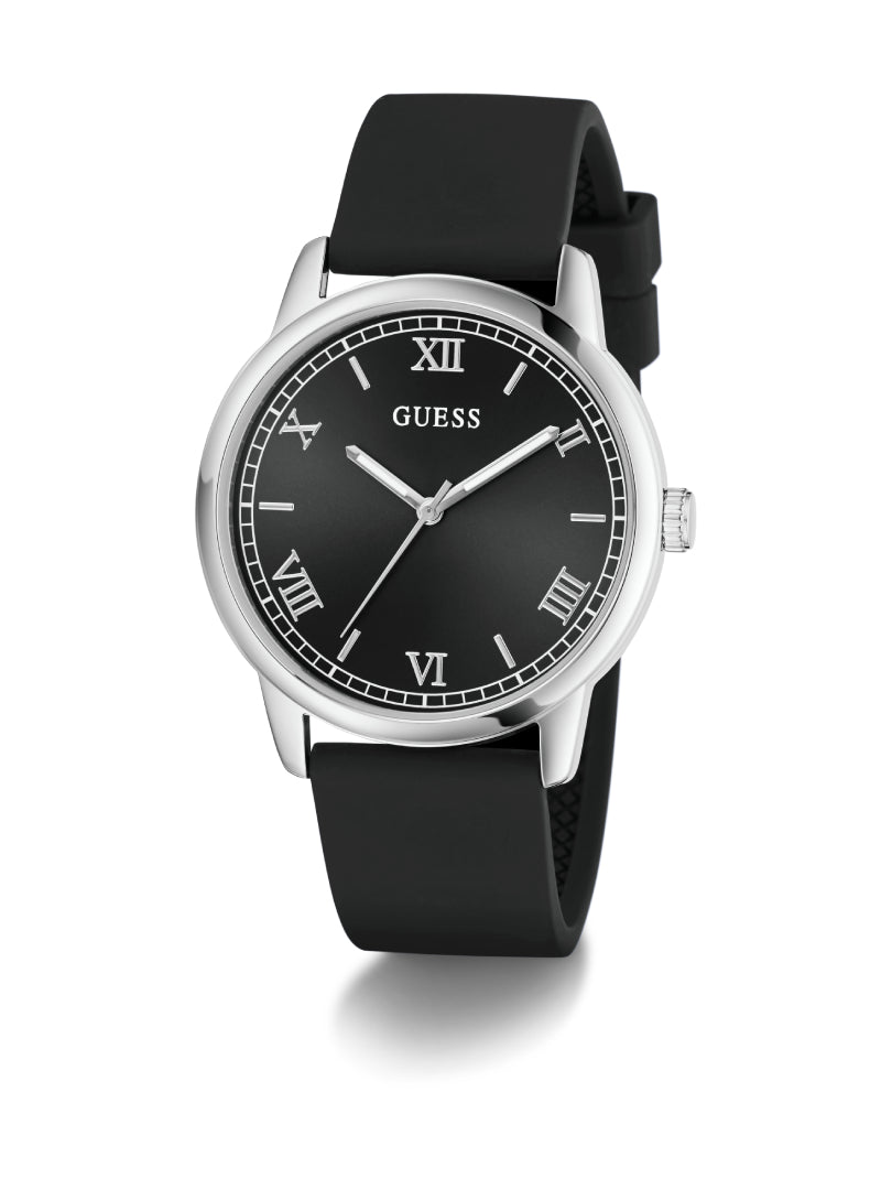 This GUESS watch highlights timeless sophistication with its black dial, silver-tone Roman numeral markers, and a polished stainless-steel case. The durable black silicone strap ensures comfort and modern practicality, making it the perfect everyday watch with a refined edge.