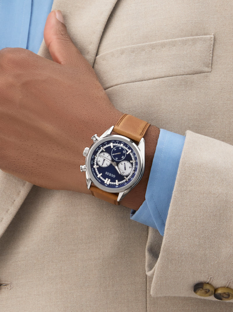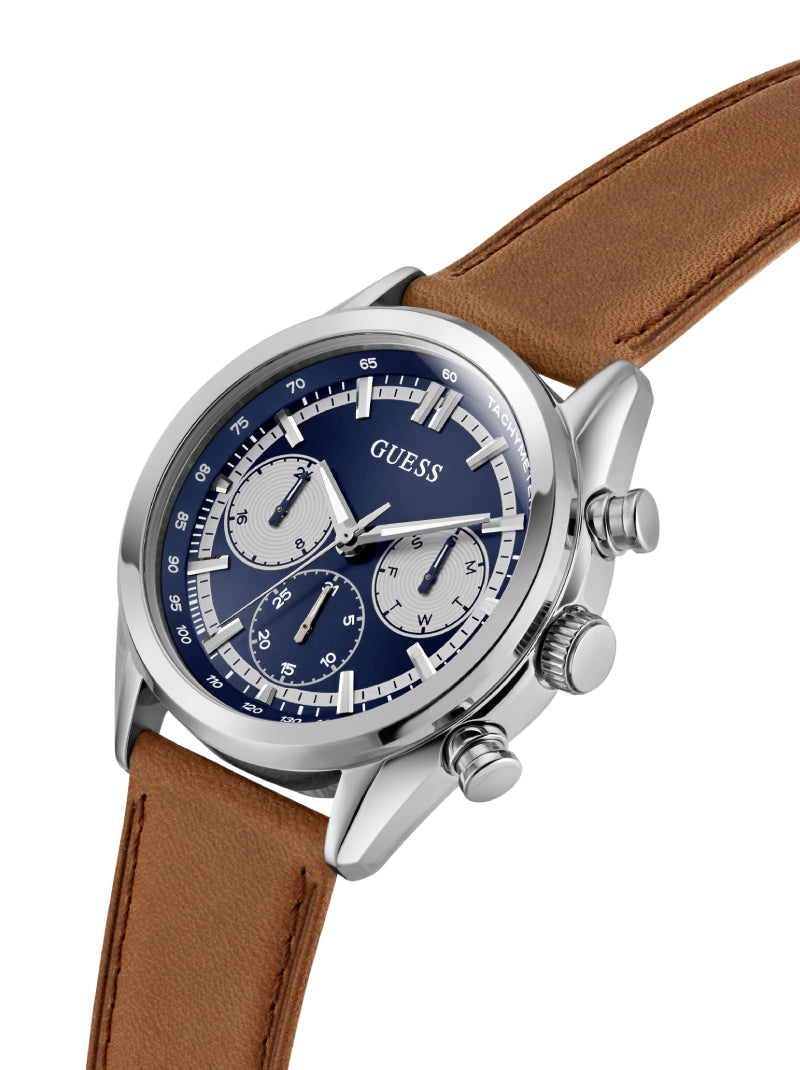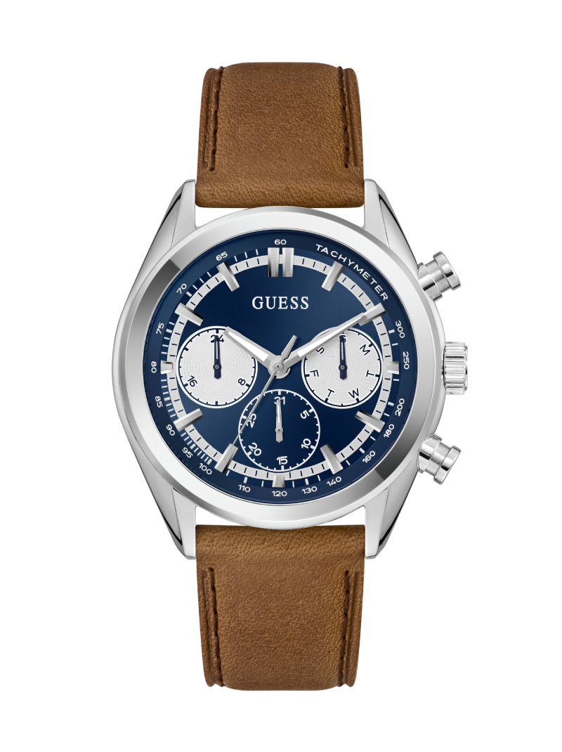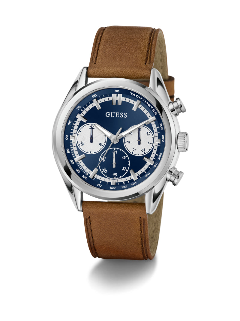 Elevate your everyday style with this sophisticated GUESS chronograph watch. Featuring a deep navy blue dial accented with three multifunction sub-dials, this timepiece combines precision with bold design. The polished stainless-steel case adds a refined edge, while the genuine brown leather strap ensures comfort and timeless appeal. Perfect for both casual wear and formal occasions, this watch embodies modern masculinity with classic charm.