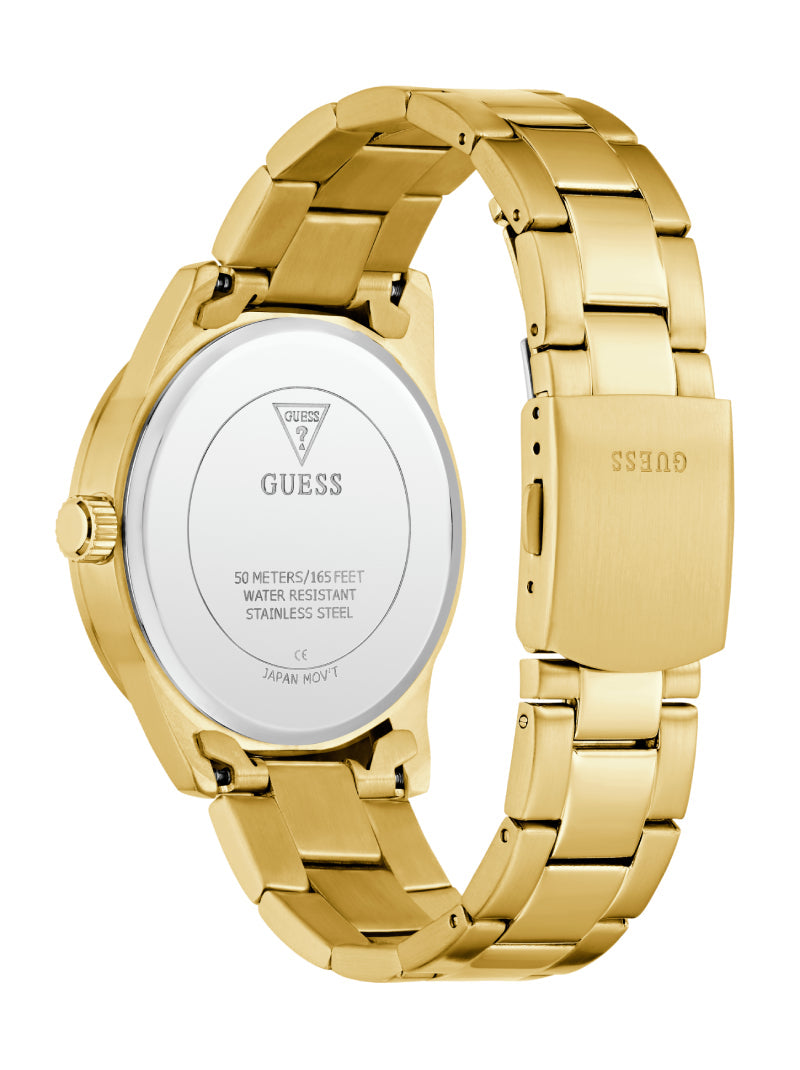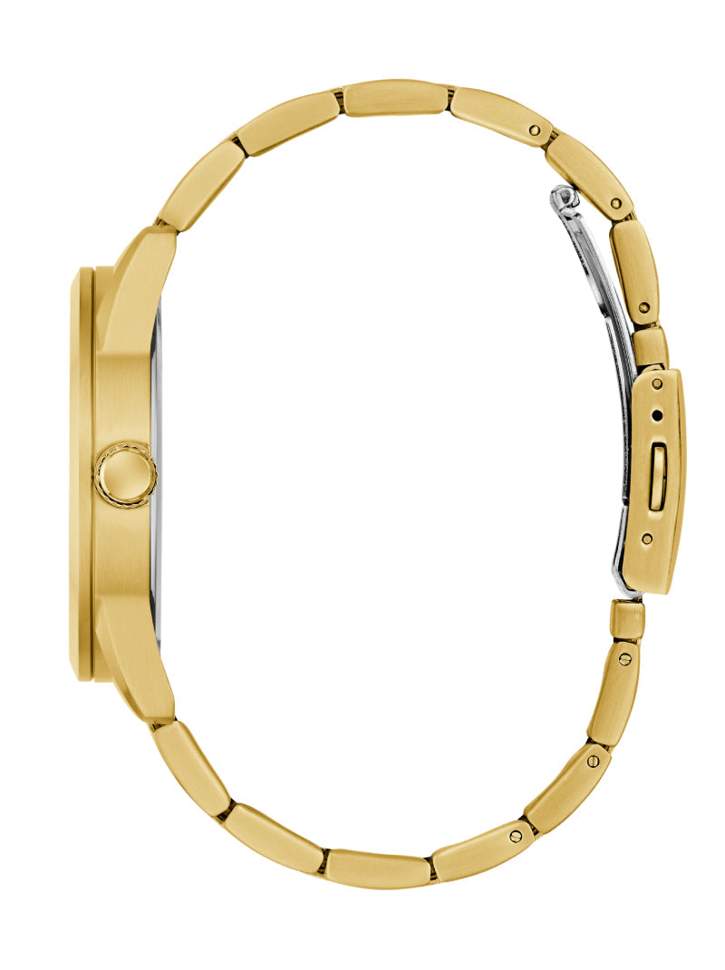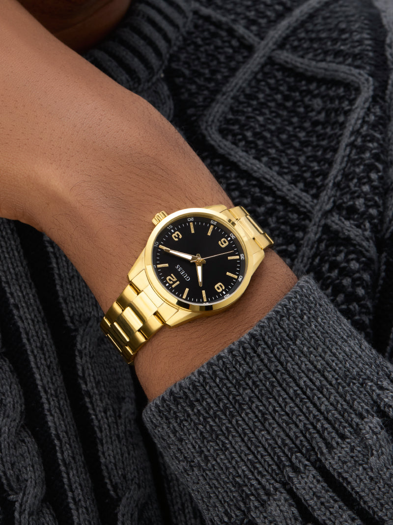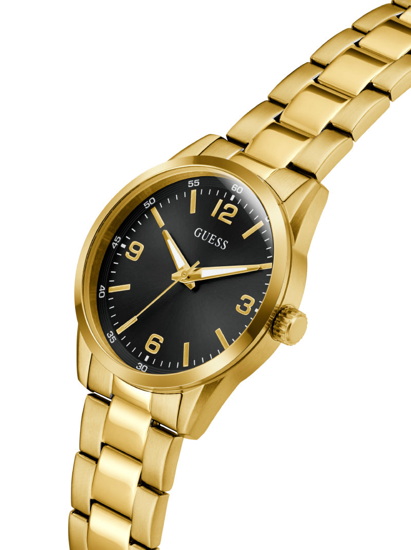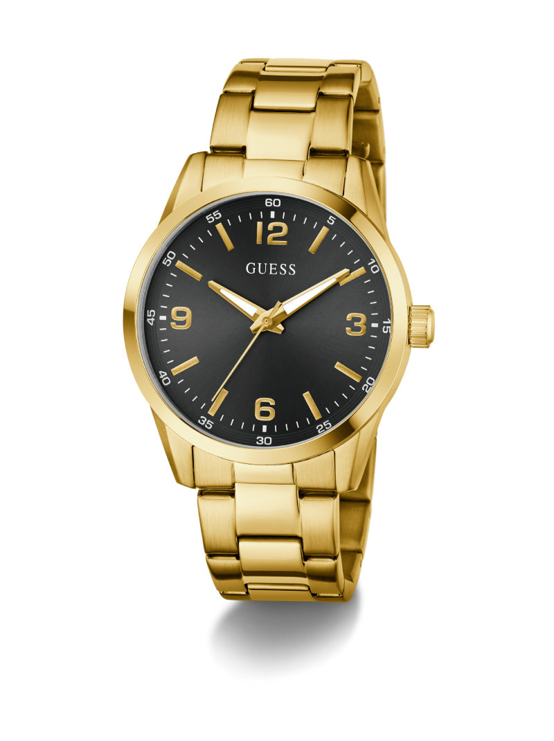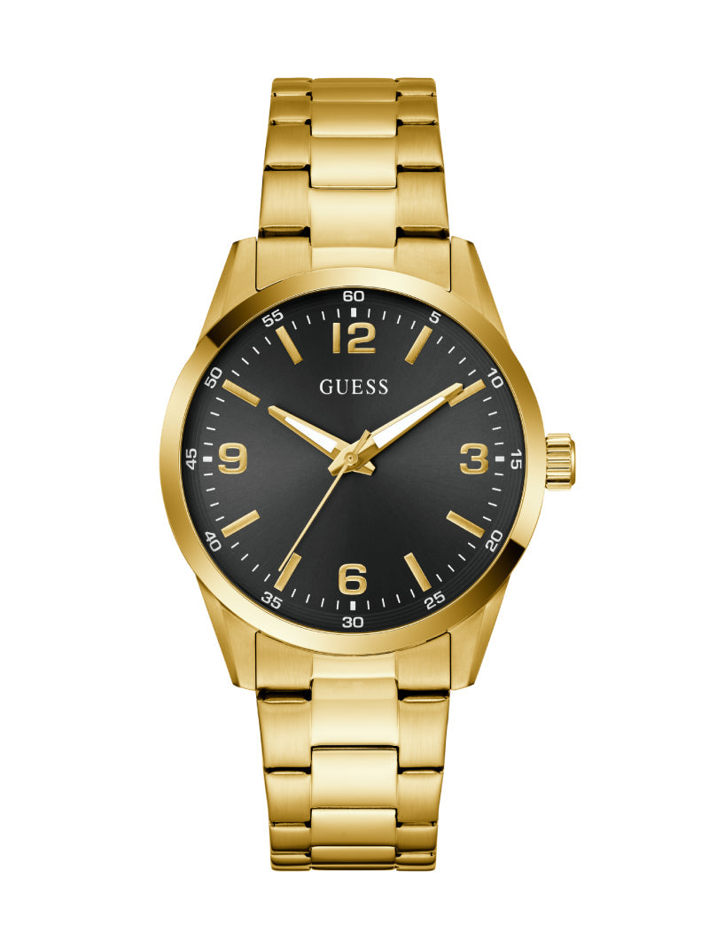 This GUESS timepiece features a striking gold-tone stainless steel bracelet paired with a sleek black dial. Its minimalist design is enhanced with luminous hands and bold numeral markers, creating a perfect balance between elegance and functionality. A versatile accessory that complements both formal and casual looks, making it an essential piece for every modern gentleman.