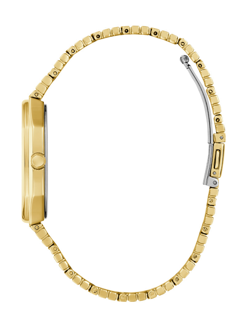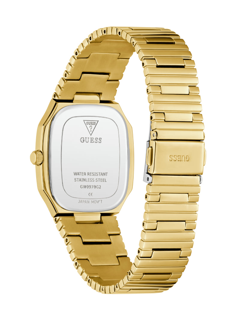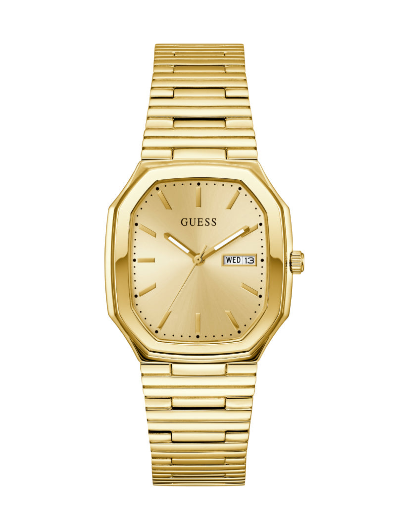 The Guess Gold Tone watch features a bold geometric case design with a sleek gold finish, creating a sophisticated yet statement-making look. Its minimal black-accented dial with a day-date function adds practicality while maintaining modern elegance. The flexible gold-tone bracelet ensures comfort and style, making it the perfect accessory for both daily wear and special occasions.