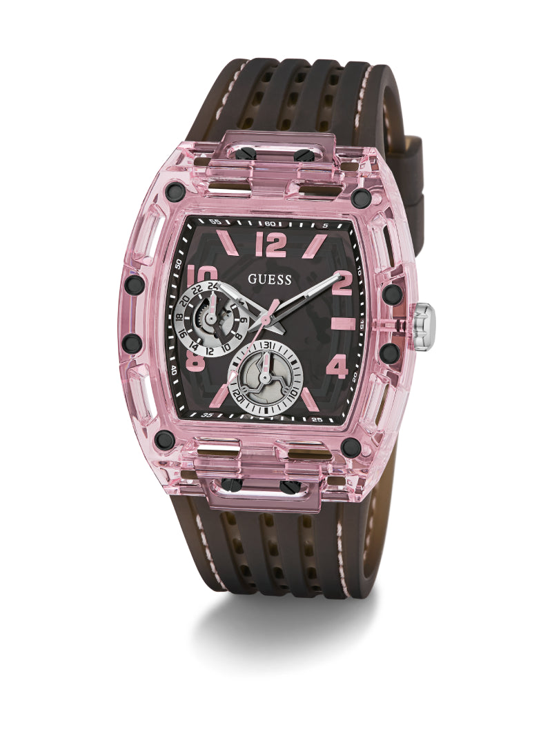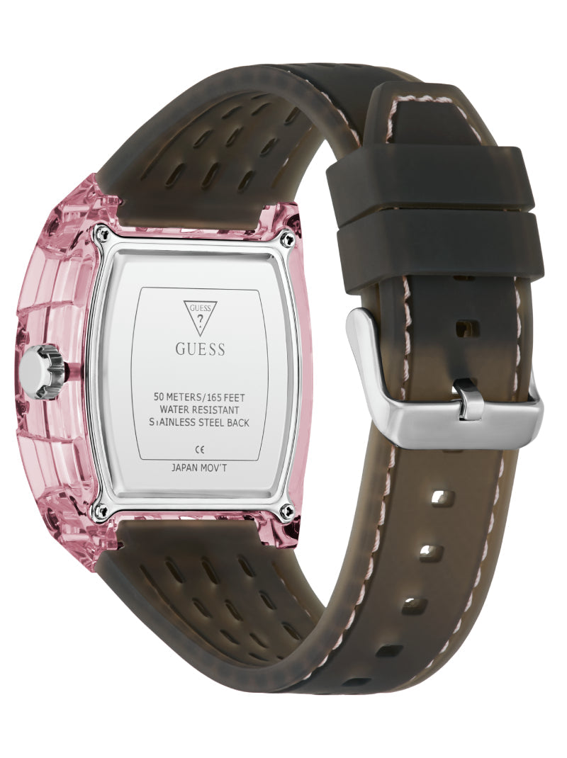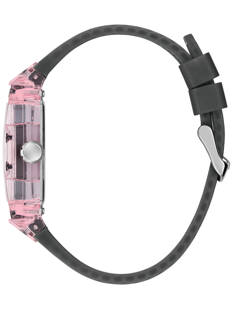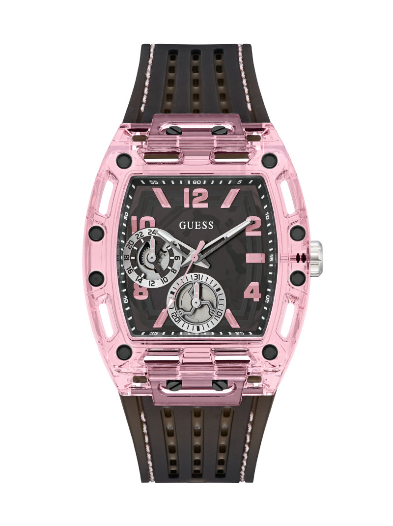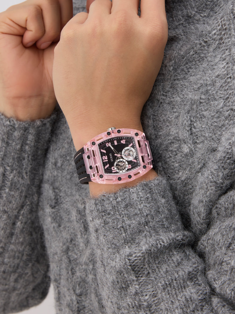 Make a fearless fashion statement with the GUESS Transparent Pink Sport Watch. Designed with a futuristic transparent pink case and bold black strap, this model exudes playful confidence. The multi-function dial with oversized numerals adds an edgy touch, while the durable silicone strap ensures comfort for everyday wear. This watch is perfect for trendsetters who love to mix fun, sporty, and modern elements in their style.