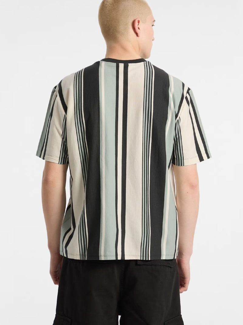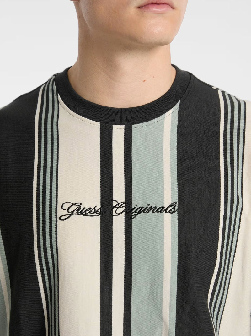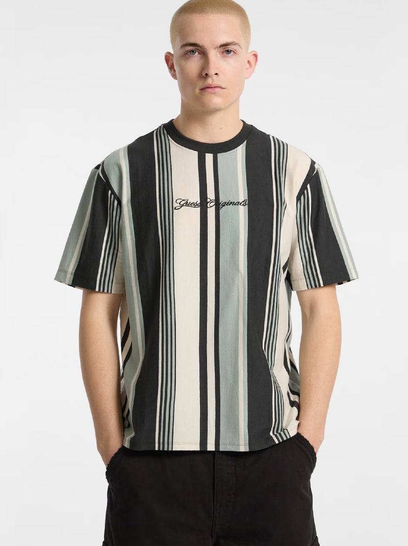 The vertical striped T-shirt is crafted from a 50/50 blend of cotton and organic cotton, offering a soft, comfortable, and eco-friendly feel. Featuring a crew neck, short sleeves, and a relaxed fit with standard length, it is accented with a subtle embroidered logo on the chest. This T-shirt provides a casual yet stylish look, perfect for everyday wear and easy to pair with jeans, shorts, or skirts.