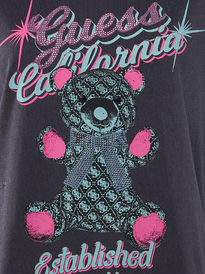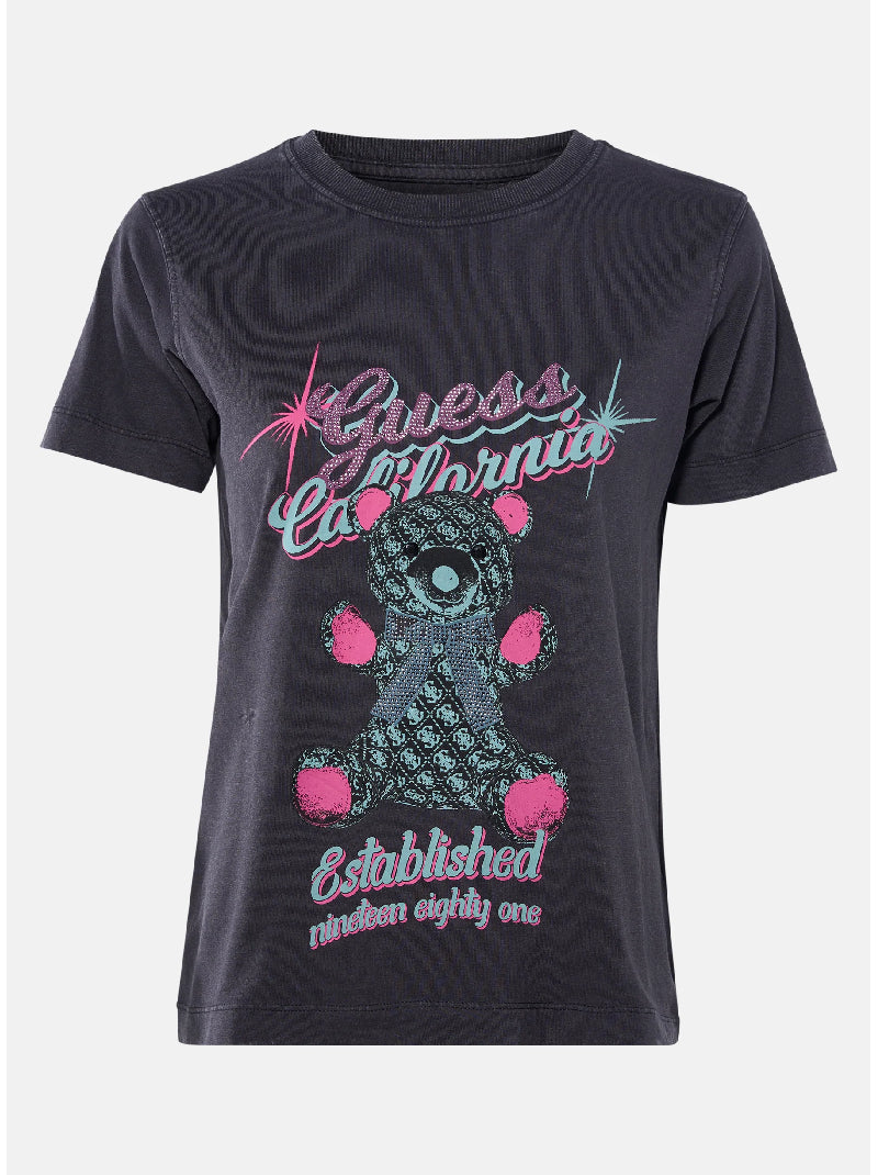 Elevate your everyday essentials with this Guess Printed T-Shirt in Jet Black, a timeless wardrobe staple crafted from soft, breathable cotton jersey for all-day comfort. Featuring short sleeves and a classic crew neckline, this tee is subtly enhanced with pearl and rhinestone accents that catch the light and add a refined touch to your casual look. Its versatile silhouette pairs effortlessly with jeans, skirts, or shorts, making it a chic and reliable choice for both laid-back and stylish outfits alike.