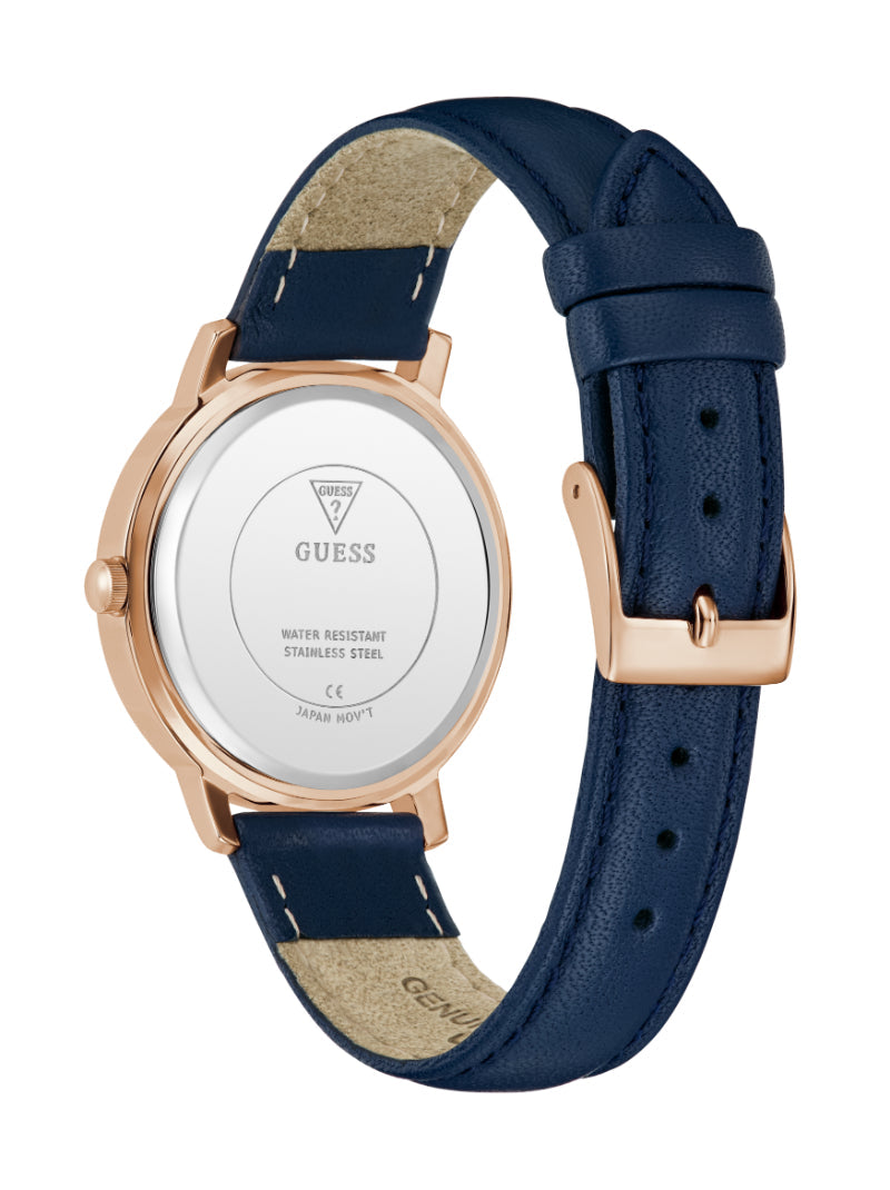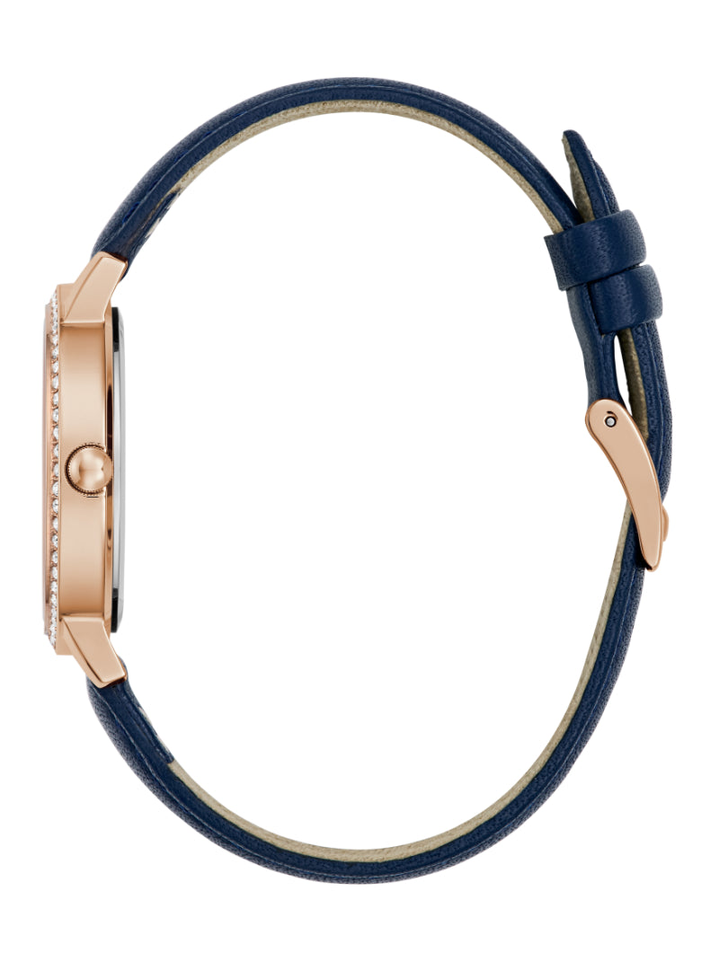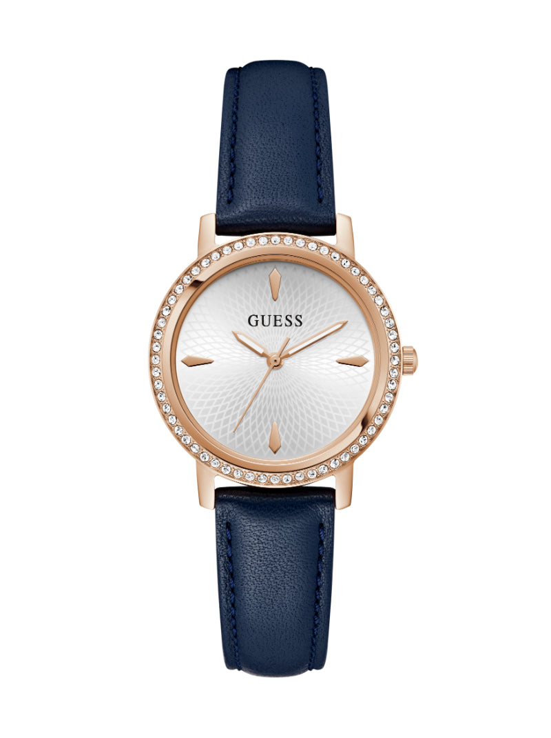 The GUESS features a rose gold recycled steel case paired with a 34 mm white dial and a blue genuine leather strap, offering a refined and elegant design perfect for women who appreciate modern style with distinctive charm.
