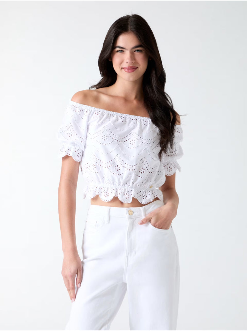 This off-shoulder eyelet top from GUESS brings a romantic touch to everyday styling, featuring delicate broderie detailing and a flattering silhouette that enhances the figure effortlessly. Designed with soft ruffle accents and a lightweight feel, it offers comfort and movement while adding a feminine, modern charm to any look.