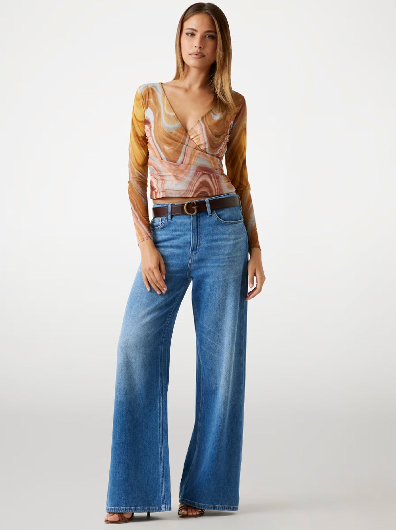 Step into modern elegance with this stretch mesh top. Its surplice neckline adds a sophisticated flair, perfect for evenings out. The all-over pattern ensures a stylish impression. Made with recycled components.