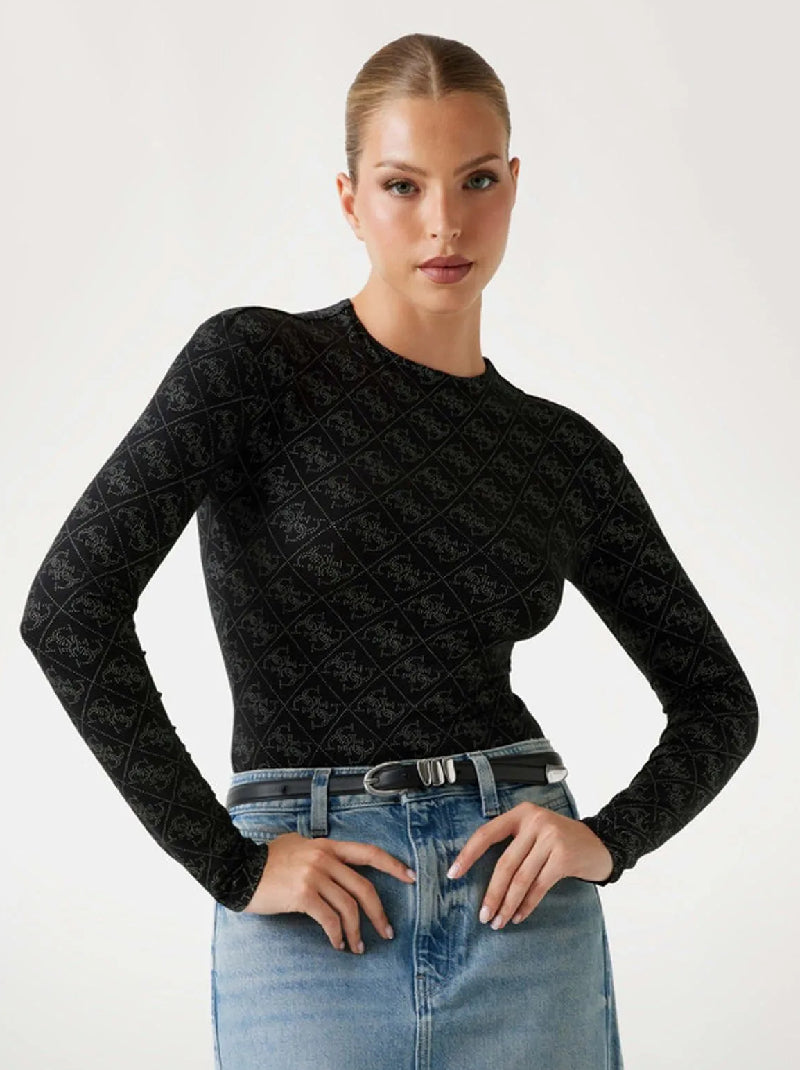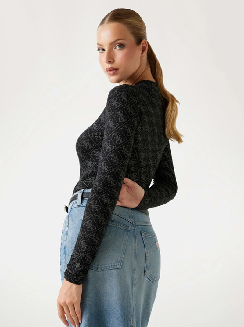 This sleek black bodysuit features an exquisitely crystal‑embellished “4G” logo design, delivering unmistakable luxury and confidence at first glance. Ideal for when you want all eyes on you in the most glamorous way.