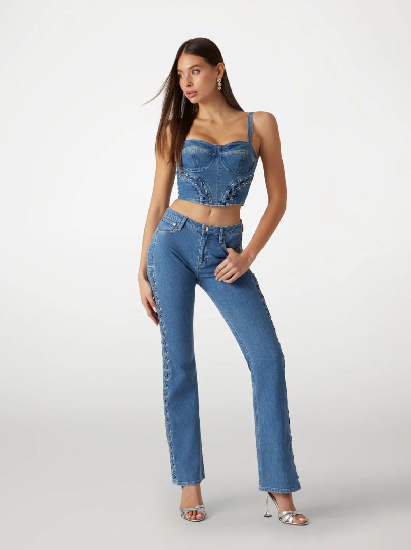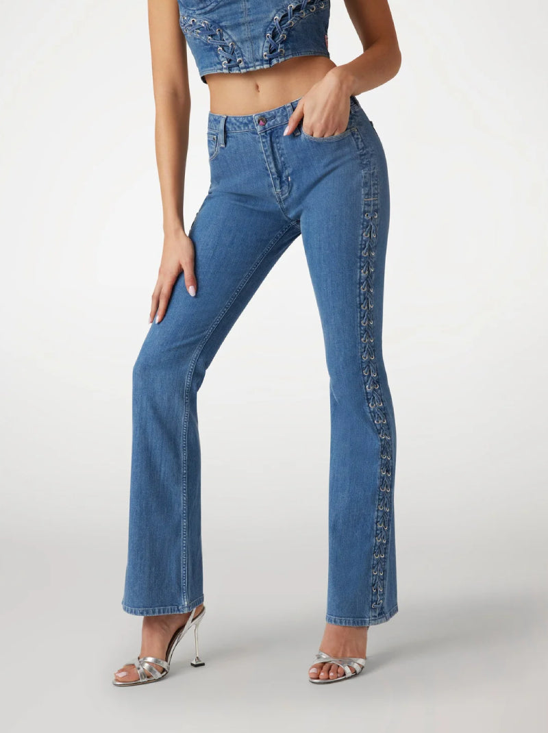 Amp up your denim look with the GUESS Sexy Flared Lace‑Up Jeans—a trend-forward piece perfect for modern fashion lovers. These mid-rise jeans feature a sleek slim fit through the hips and thighs, flaring out dramatically at the lower leg. Eye-catching lace‑up panels at the sides elevate the design with a refined edge. Detailed with classic five-pocket styling, a zip-fly closure, and the signature triangle logo at the back pocket, they blend timeless GUESS branding with bold contemporary flair.