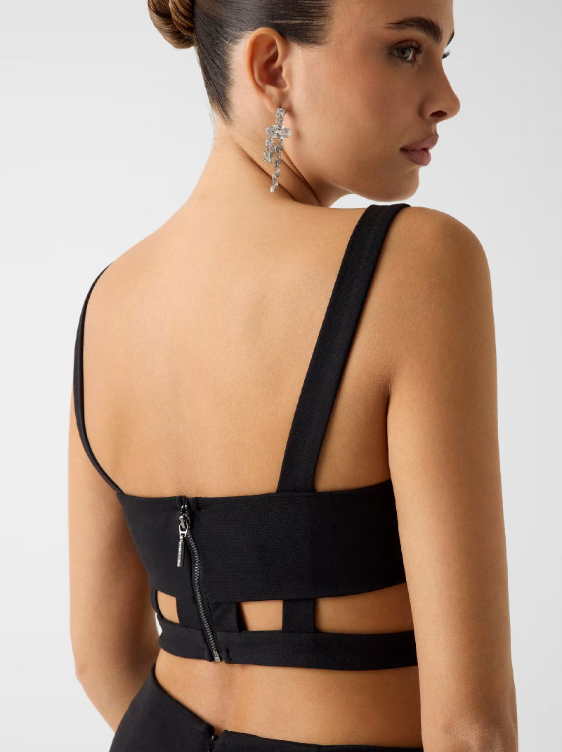 เติมเอกลักษณ์ให้การแต่งตัวด้วย เสื้อ GUESS Cut-Out Top สีดำ ดีไซน์สุดโมเดิร์นไร้แขน ตัดเย็บจากผ้าโมนาโกปอนเต้คุณภาพสูง มาพร้อมคอทรงสแควร์ที่ช่วยขับสัดส่วน และดีเทลเปิดเว้าที่เพิ่มลูกเล่นอย่างมีสไตล์ พร้อมซิปซ่อนด้านหลังเพื่อการปิดเปิดอย่างเรียบเนียน แมตช์ง่ายกับยีนส์เอวสูงหรือกางเกงทรงสวยสำหรับลุคชิคทั้งวันและตอนกลางคืน.