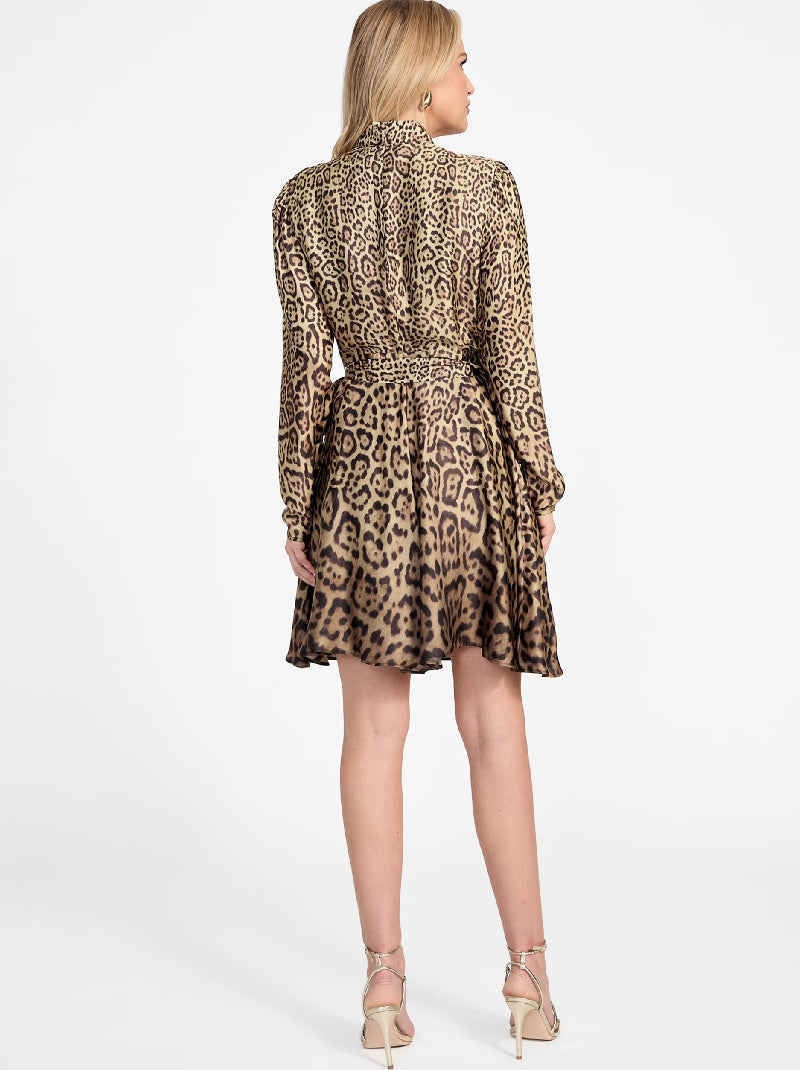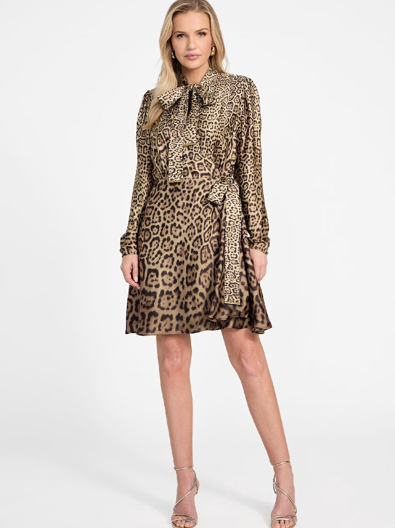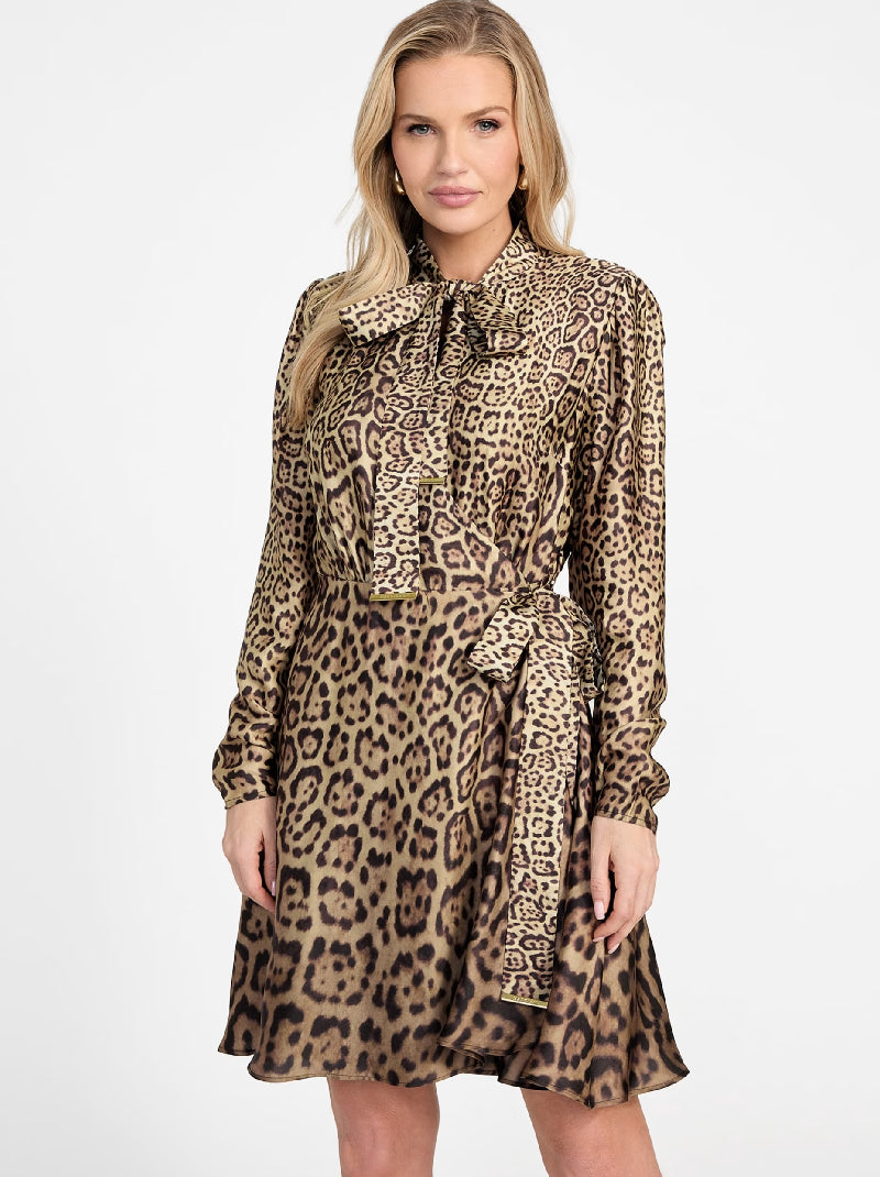 เดรสผ้าซาตินพิมพ์ลายจาก Marciano by GUESS รุ่น Eco Alanis มาพร้อมกับลายเสือดาวที่โดดเด่น คอวีผูกโบว์ แขนยาวเข้ารูป และกระโปรงสั้นแบบผ่าหน้า ดีไซน์เข้ารูปที่เอวด้วยสายผูก ช่วยเพิ่มความเซ็กซี่และความเคลื่อนไหวที่อิสระ เหมาะสำหรับงานกลางคืนหรืองานพิเศษที่ต้องการความโดดเด่นและมีสไตล์