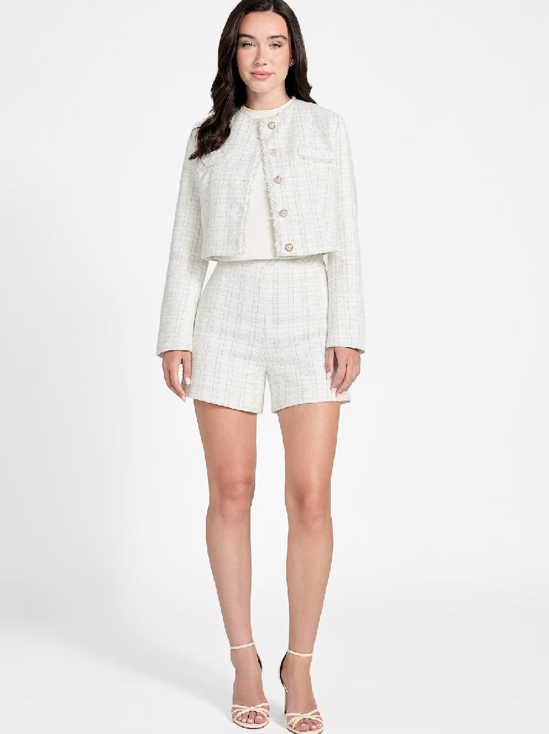 กางเกงขาสั้นทรงมินิสีขาวในสไตล์ทวีด ที่เติมความหรูแบบสตรีทเอจด้วยลวดลายละเอียดและทรงที่คมชัด พร้อมยกระดับลุคธรรมดาให้กลายเป็นความประทับใจ