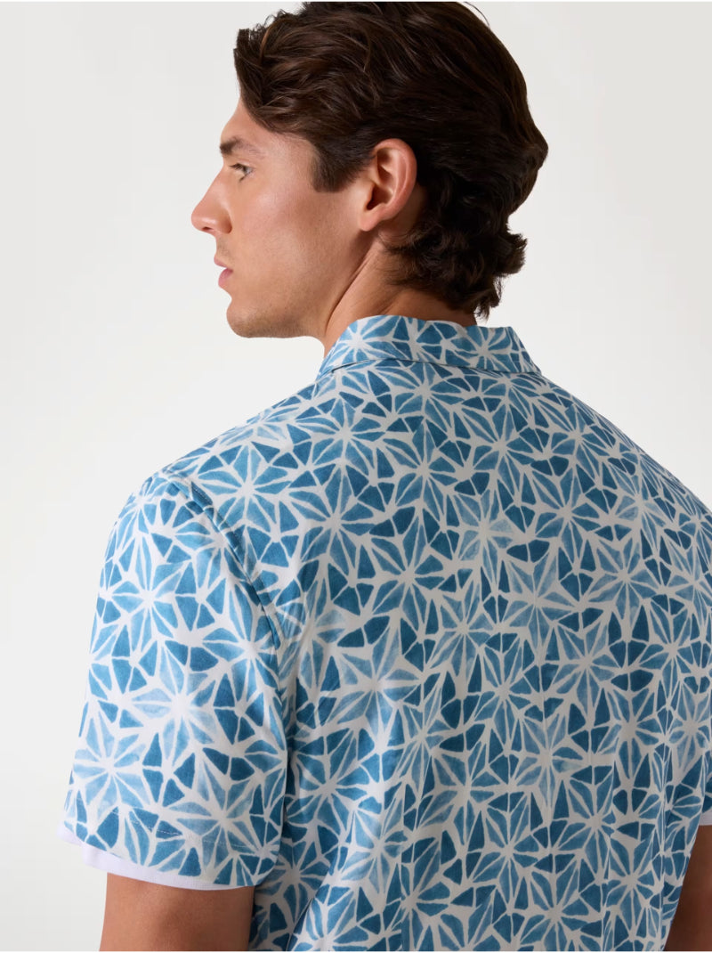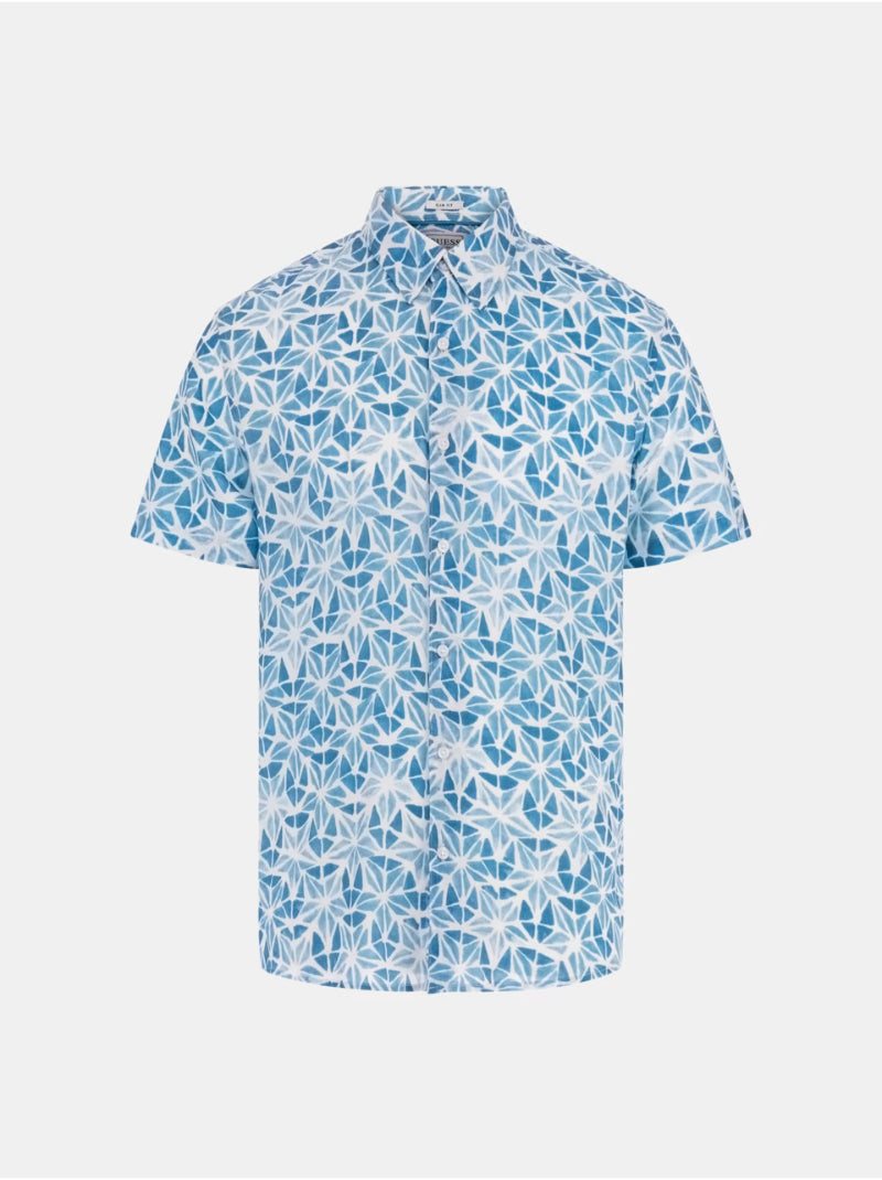 เพิ่มสีสันแห่งศิลปะให้กับตู้เสื้อผ้าของคุณด้วยเสื้อเชิ้ตแขนสั้น GUESS Eco Watercolor สีฟ้า ผลิตจากผ้า ECOVERO™ วิสโคส 100% ให้ความรู้สึกเบาสบายและระบายอากาศได้ดี เหมาะสำหรับสภาพอากาศร้อน ลวดลายเรขาคณิตที่ได้รับแรงบันดาลใจจากสีน้ำเพิ่มความโดดเด่นไม่เหมือนใคร ปกพับและกระดุมด้านหน้าช่วยเสริมลุคคลาสสิก ดีไซน์ทรงสลิมและความยาวมาตรฐาน เหมาะสำหรับการสวมใส่ในวันสบาย ๆ หรือโอกาสกึ่งทางการ